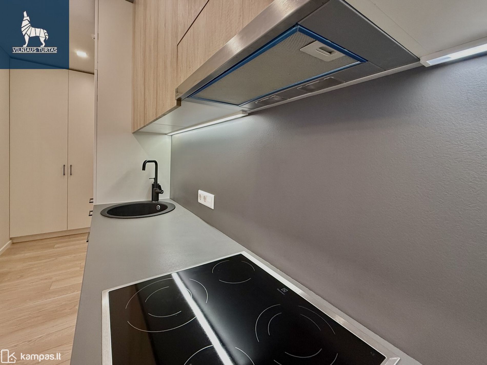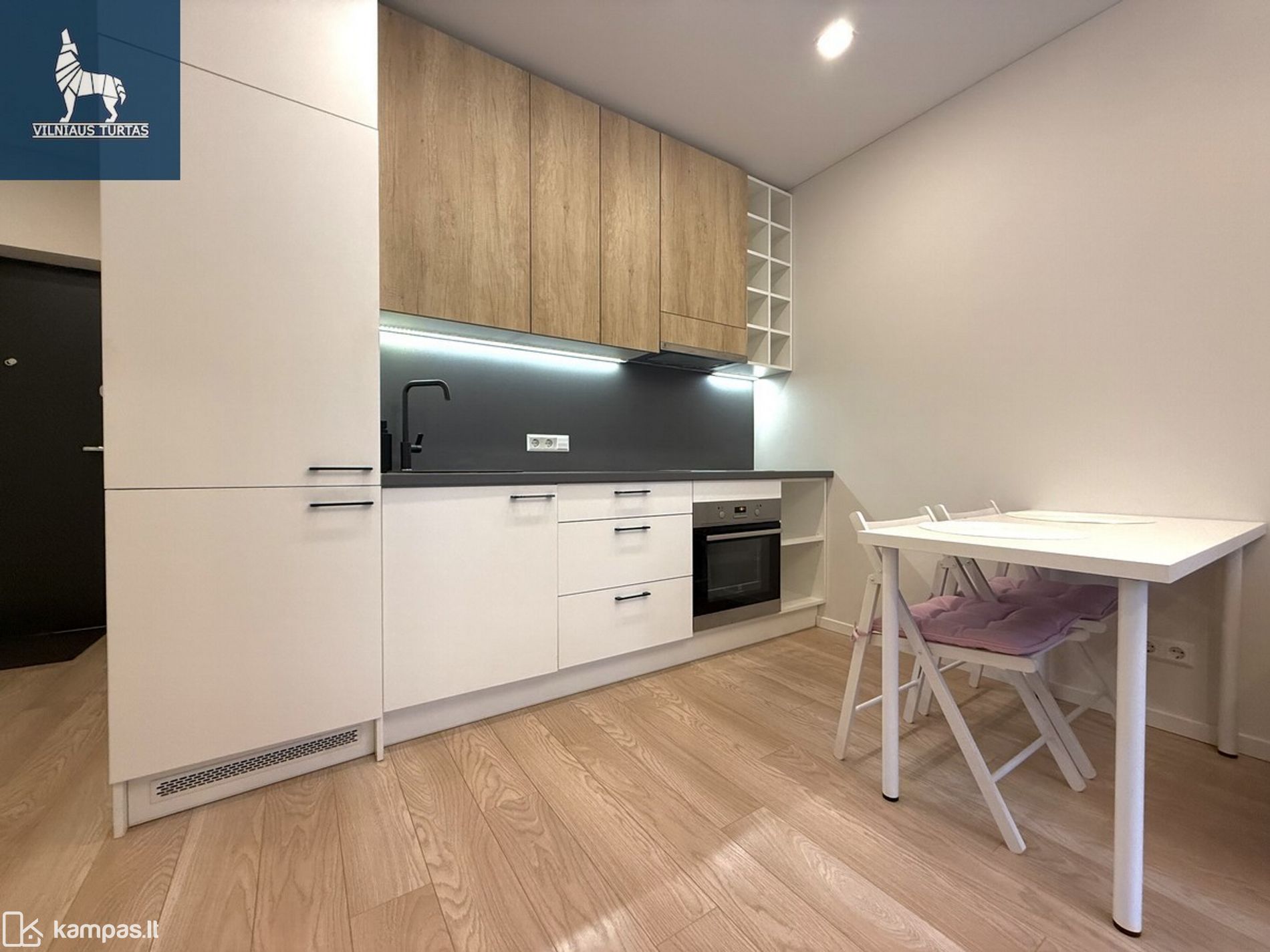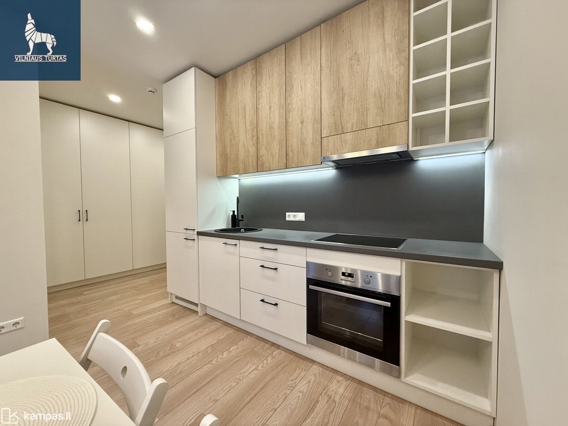 - Virtuvė su integruota buitine technika (orkaitė, kaitlentė, šaldytuvas, gartraukis)