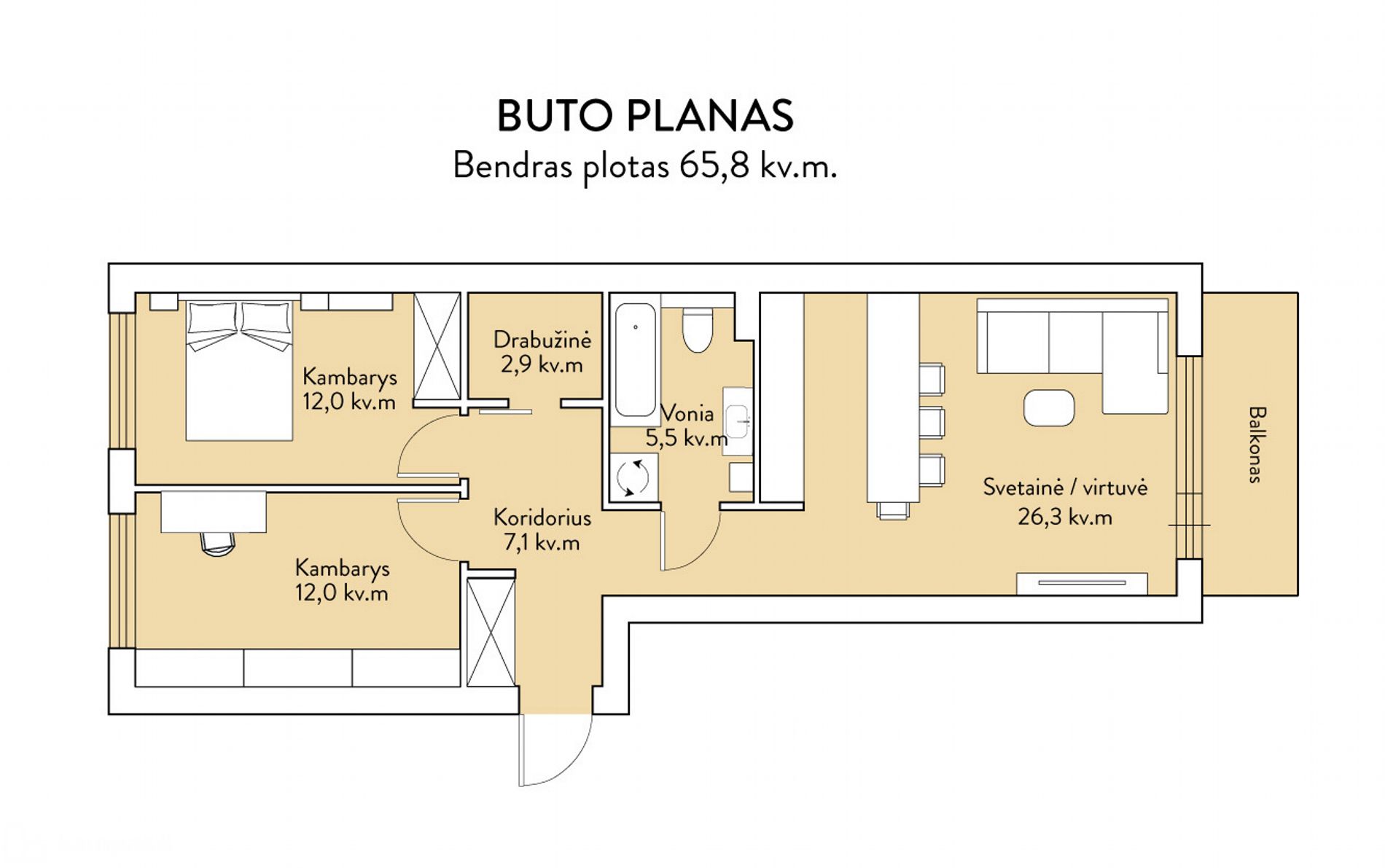 • Virtuvės ir svetainės zona bendra su išėjimu į balkoną;