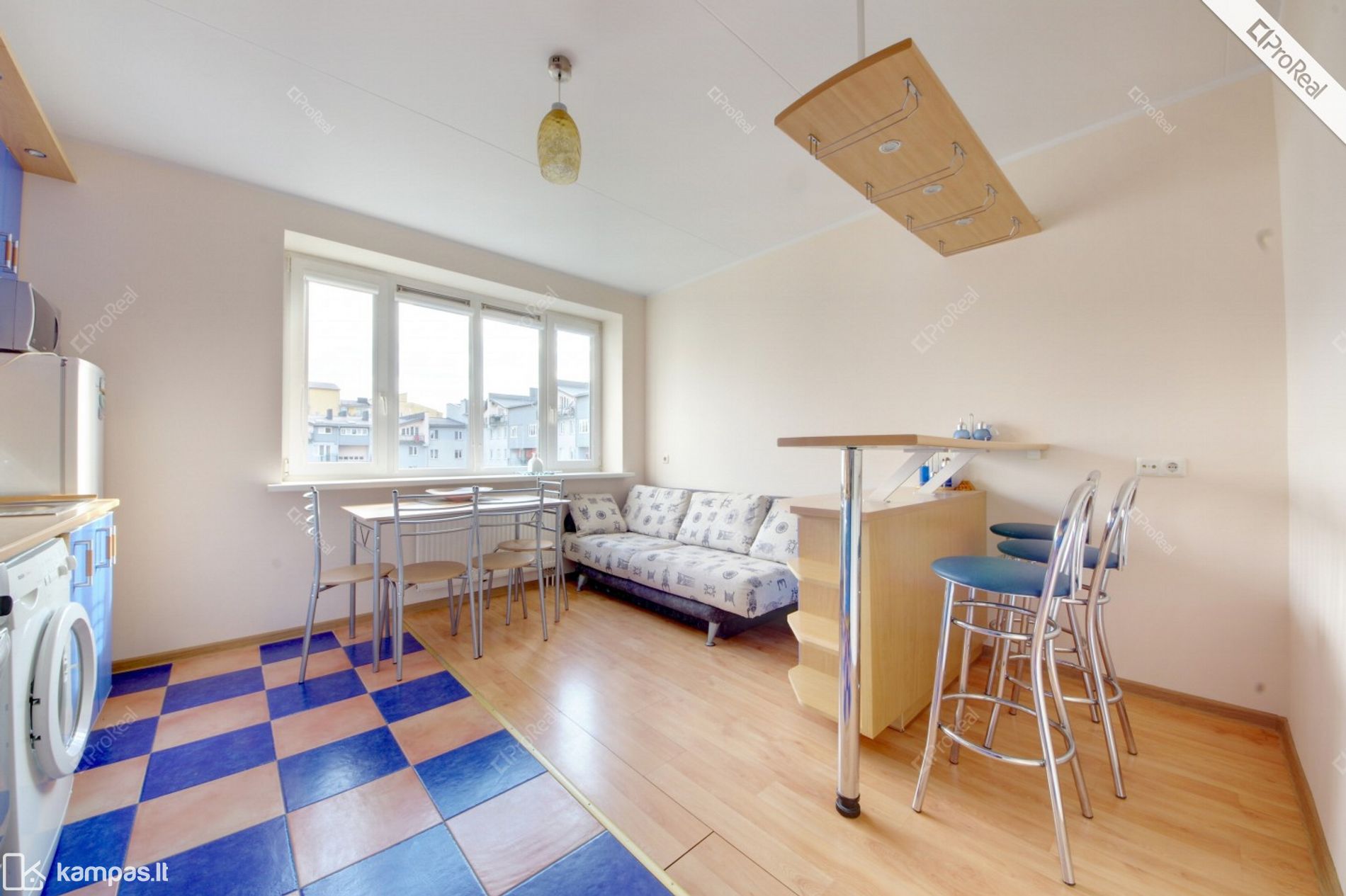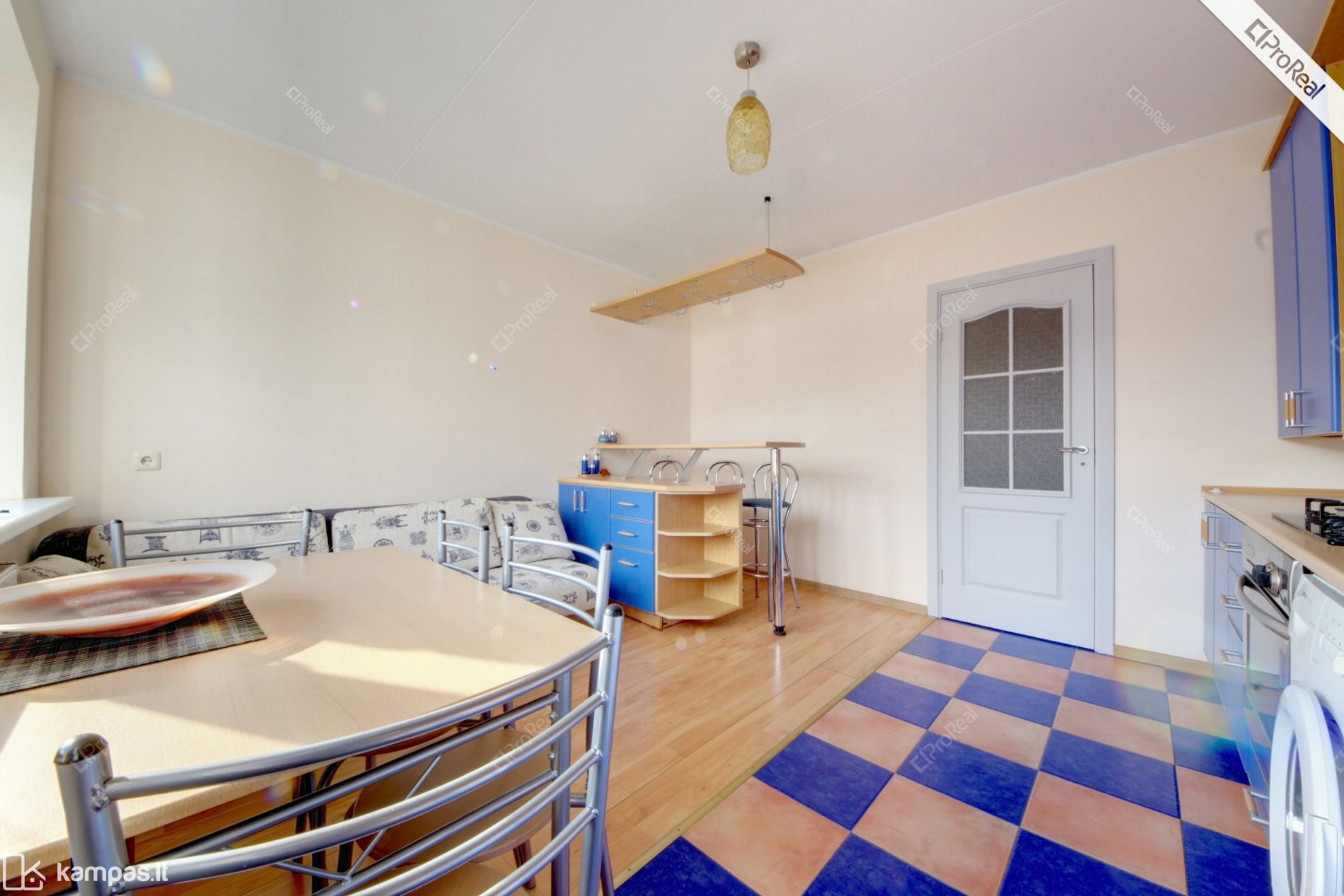 • Virtuvėje: integruoti virtuvės baldai, baras, stalas, kėdės, sofa-lova.