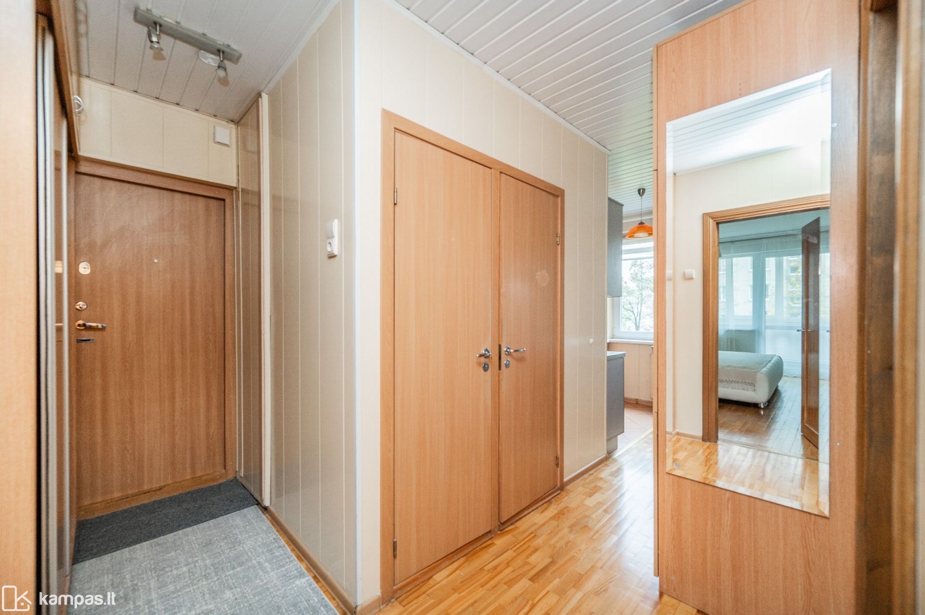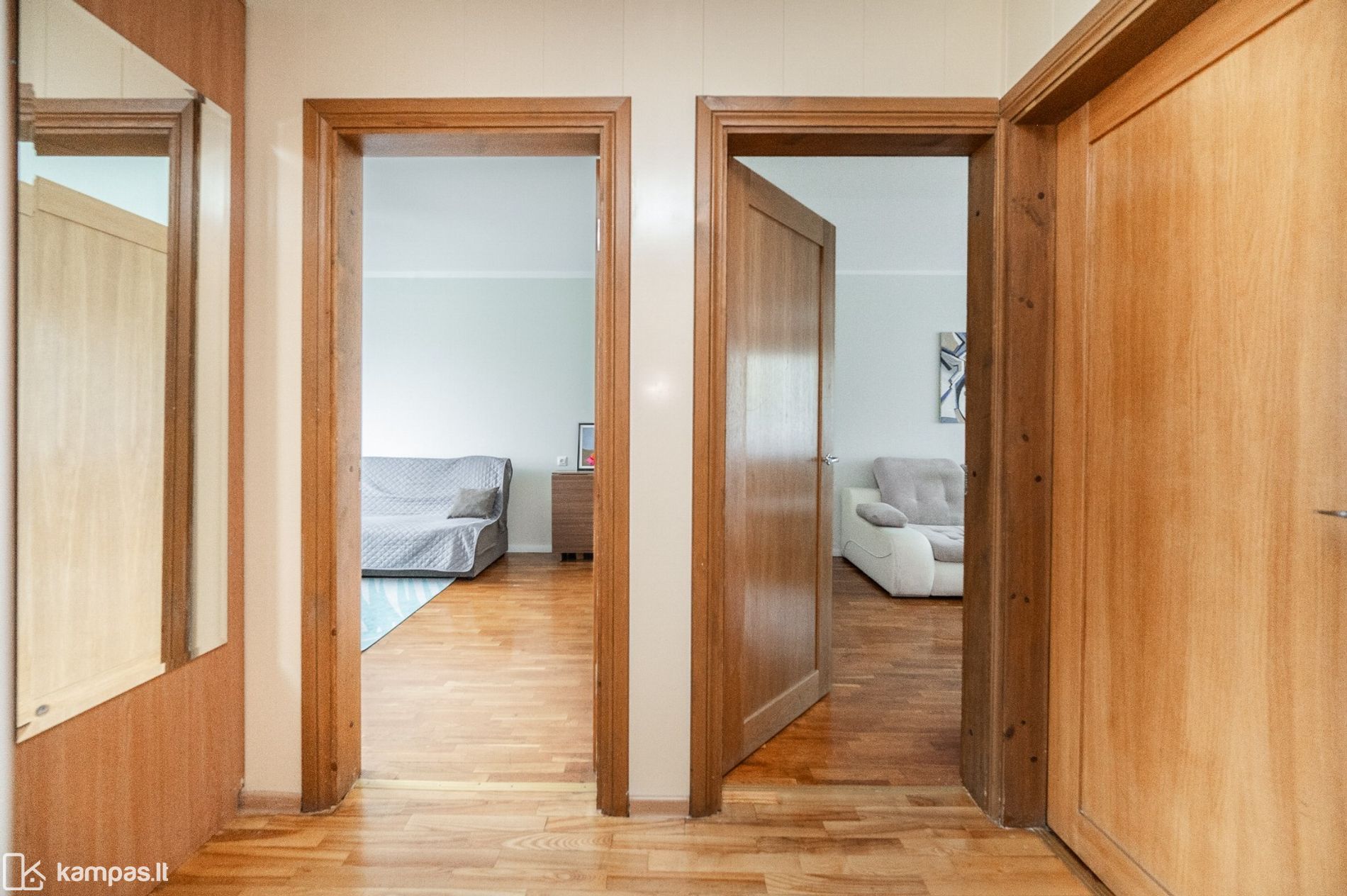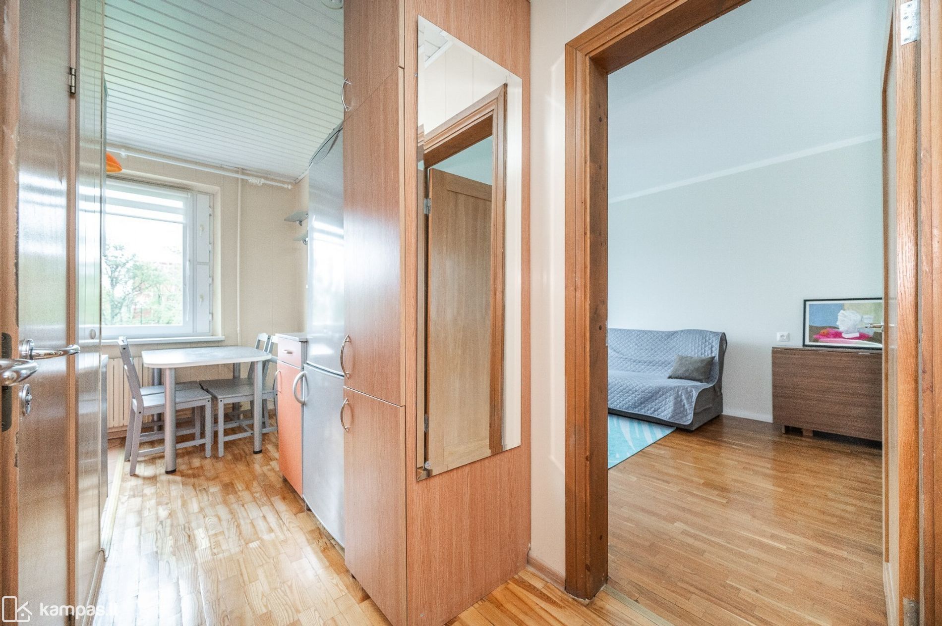• Grindys: kambariuose – natūralaus medžio parketas, virtuvėje ir sanitariniuose mazguose – plytelės;
