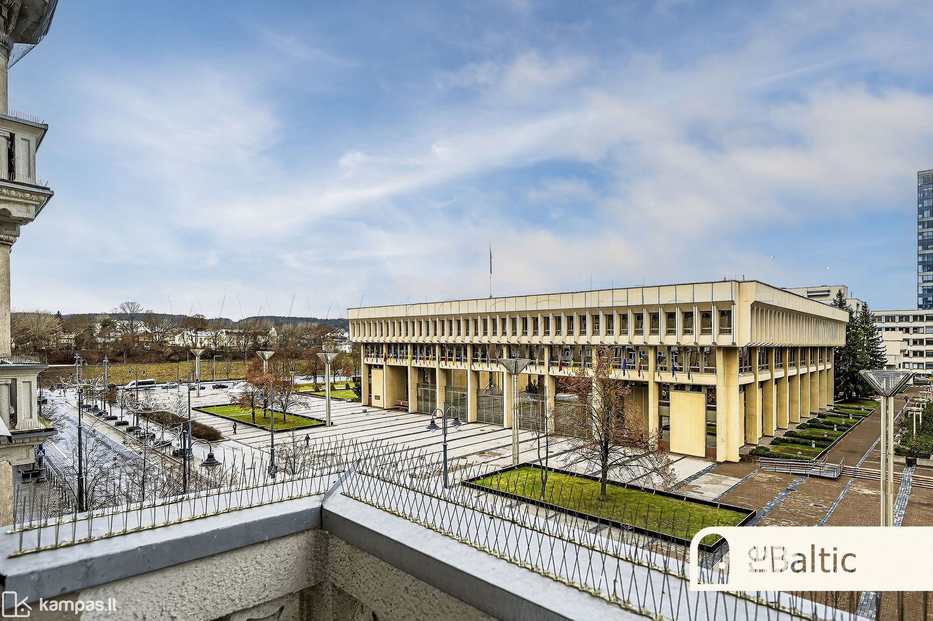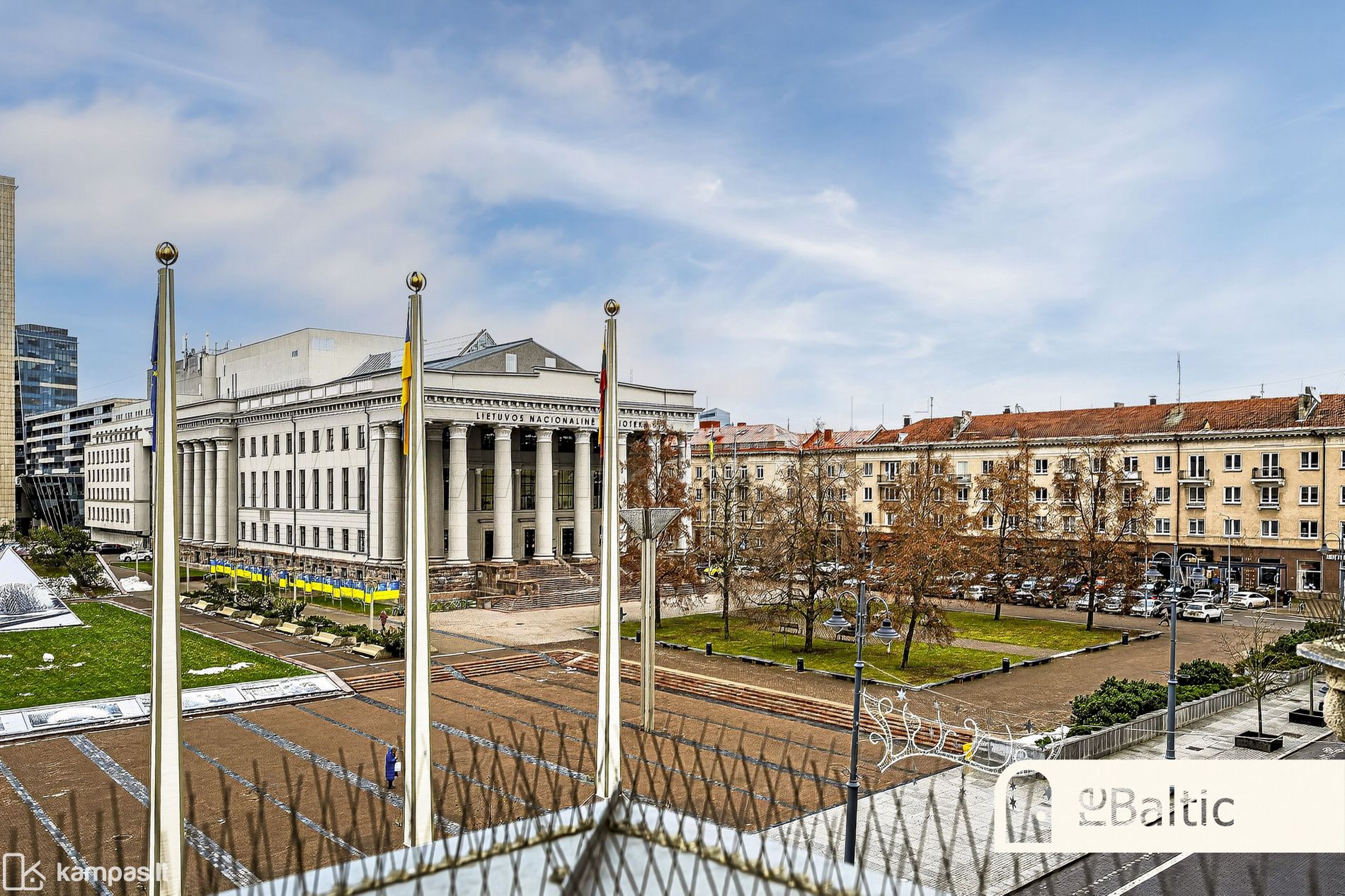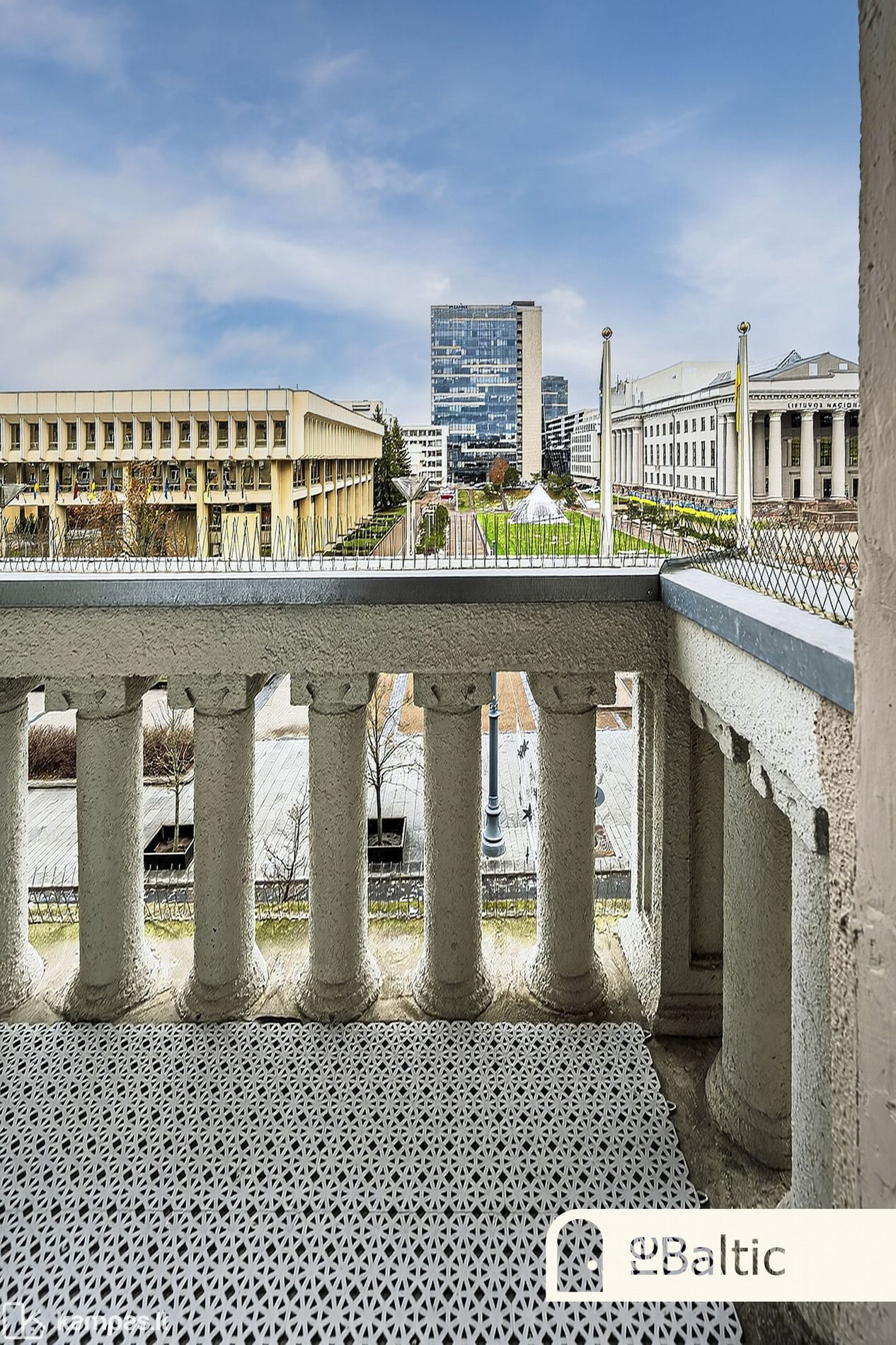 Modernly furnished one bedroom apartment next to Lithuanian Parliament, with high ceilings, balcony, and views of Gediminas Avenue.