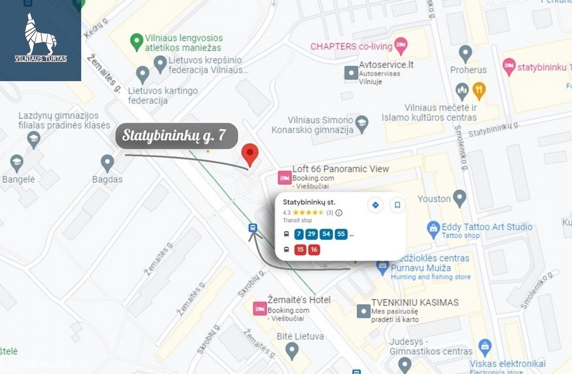 Ypač patraukli būsto lokacija turėtų sudominti tiek aktyvaus laisvalaikio, ar ramių pasivaikščiojimų mėgėjus – vos palikę namus, jau po kelių minučių pasieksite sportui ar pasivaikščiojimui patogų Vingio parką. Visai šalia namo randasi "Statybininkų" autobusų stotelė, greta įsikūrę keletas vaikų darželių, pradinių ir pagrindinių mokyklų, poliklinika, netoli PC „HyperRimi“, Lidl.