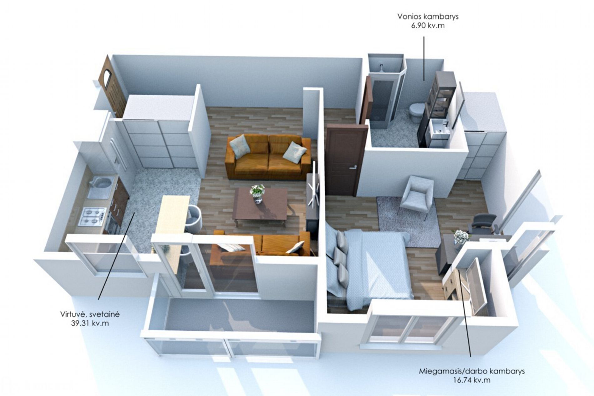- Kambarių skaičius: 2, galimybė perdaryti į 3