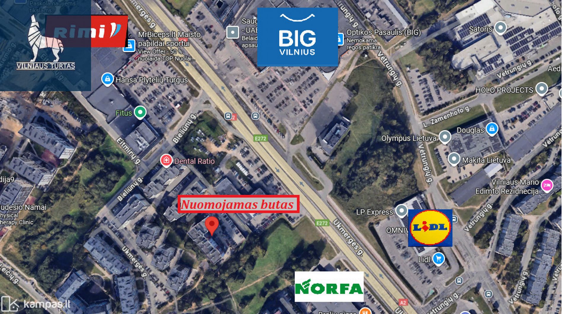 -Netoli prekybos centras BIG, Domus PRO, Rimi, LIDL; „Maxima", Norfa, IKI ;