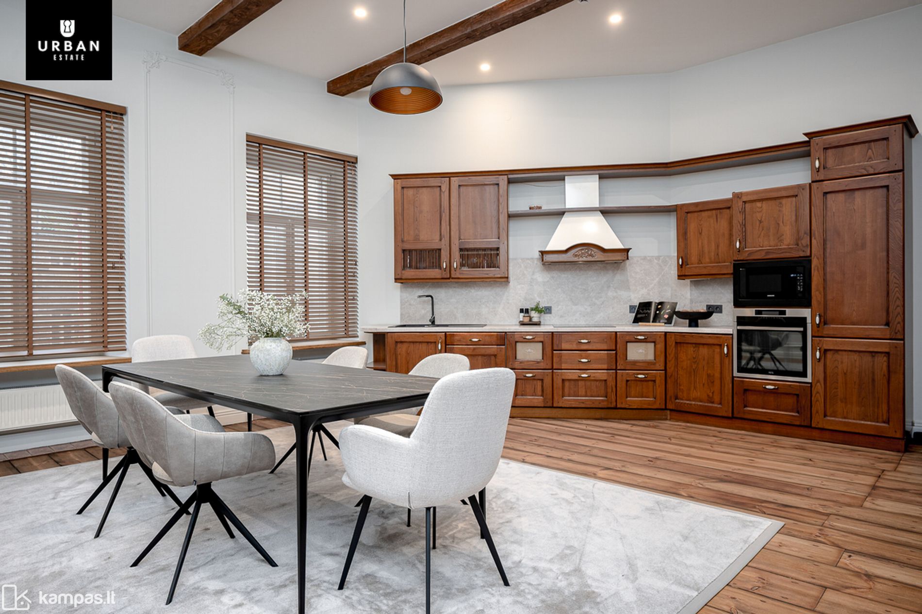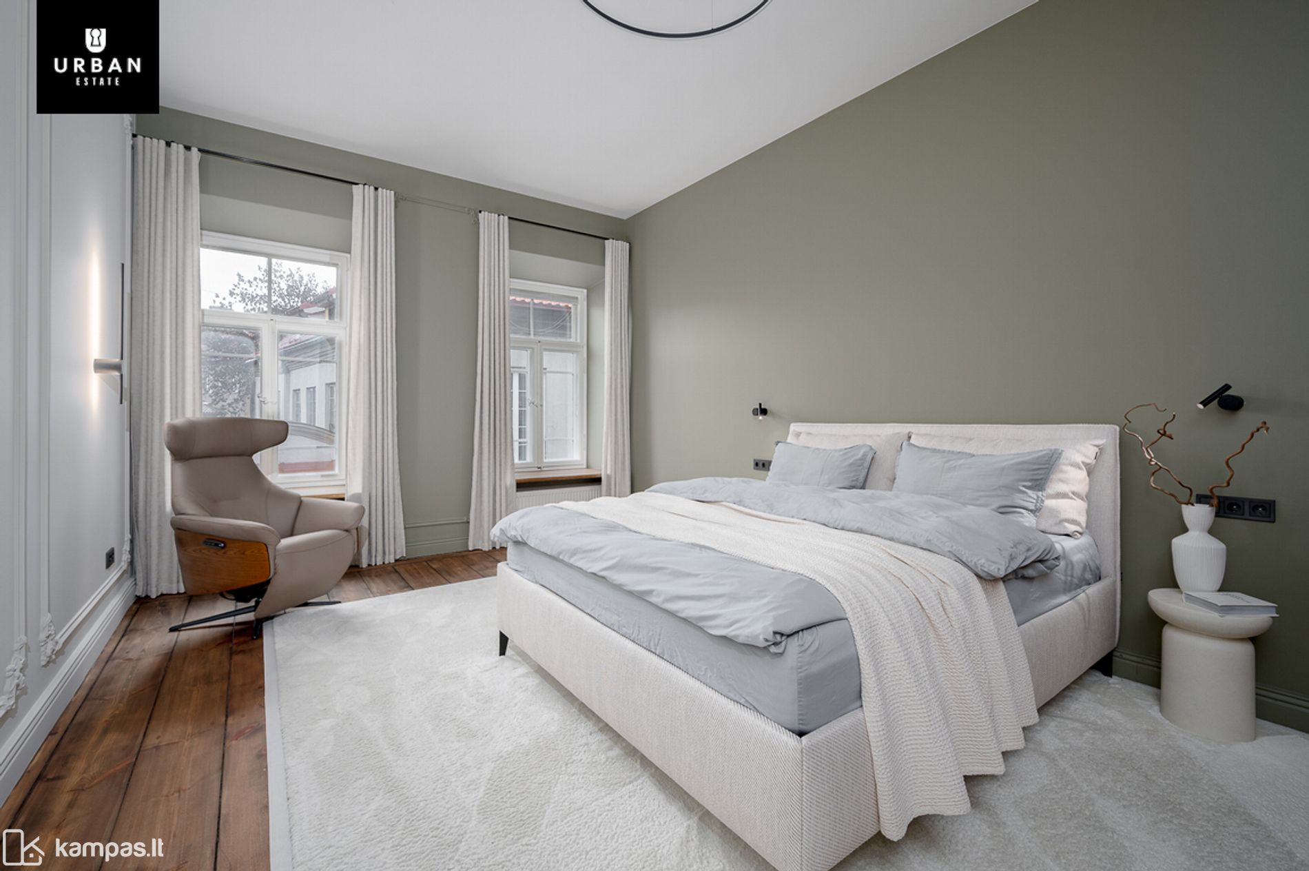 - Autentiškos bei atrestauruotos interjero detalės suderintos su šiuolaikiniu interjeru, itin aukštos lubos, siekiančios 3.2 metrus, dvivėrės durys, židinys, suteikia dar didesnio šarmo namams.