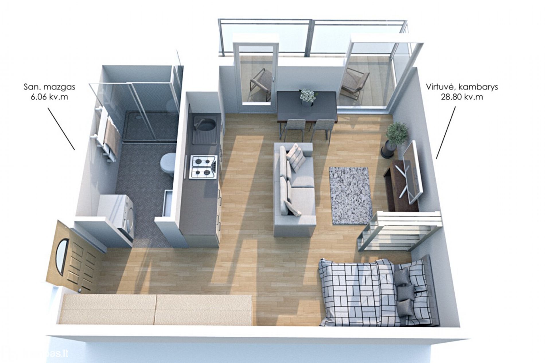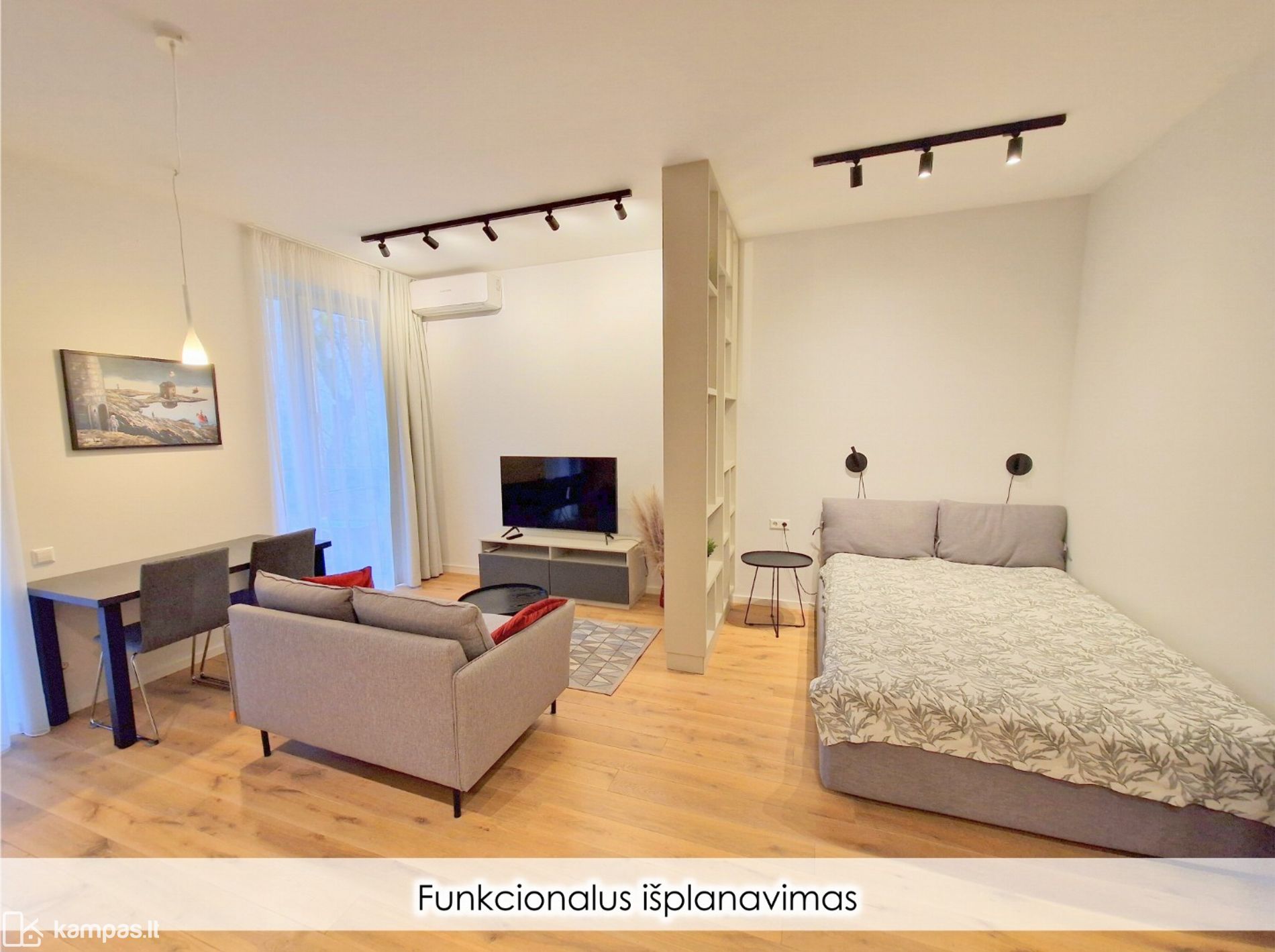• Patogus ir funkcionaliai išplanuotas vieno kambario butas su atskirta miegamojo zona, taip pat su virtuvės, valgomojo bei poilsio zonomis bei erdviu vonios kambariu.