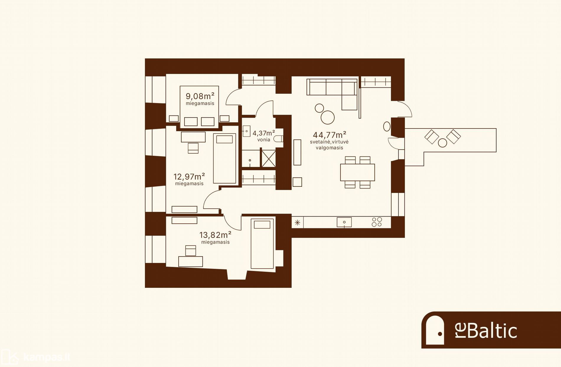 • Erdvi svetainė kartu su virtuve, išėjimas į balkoną-terasą