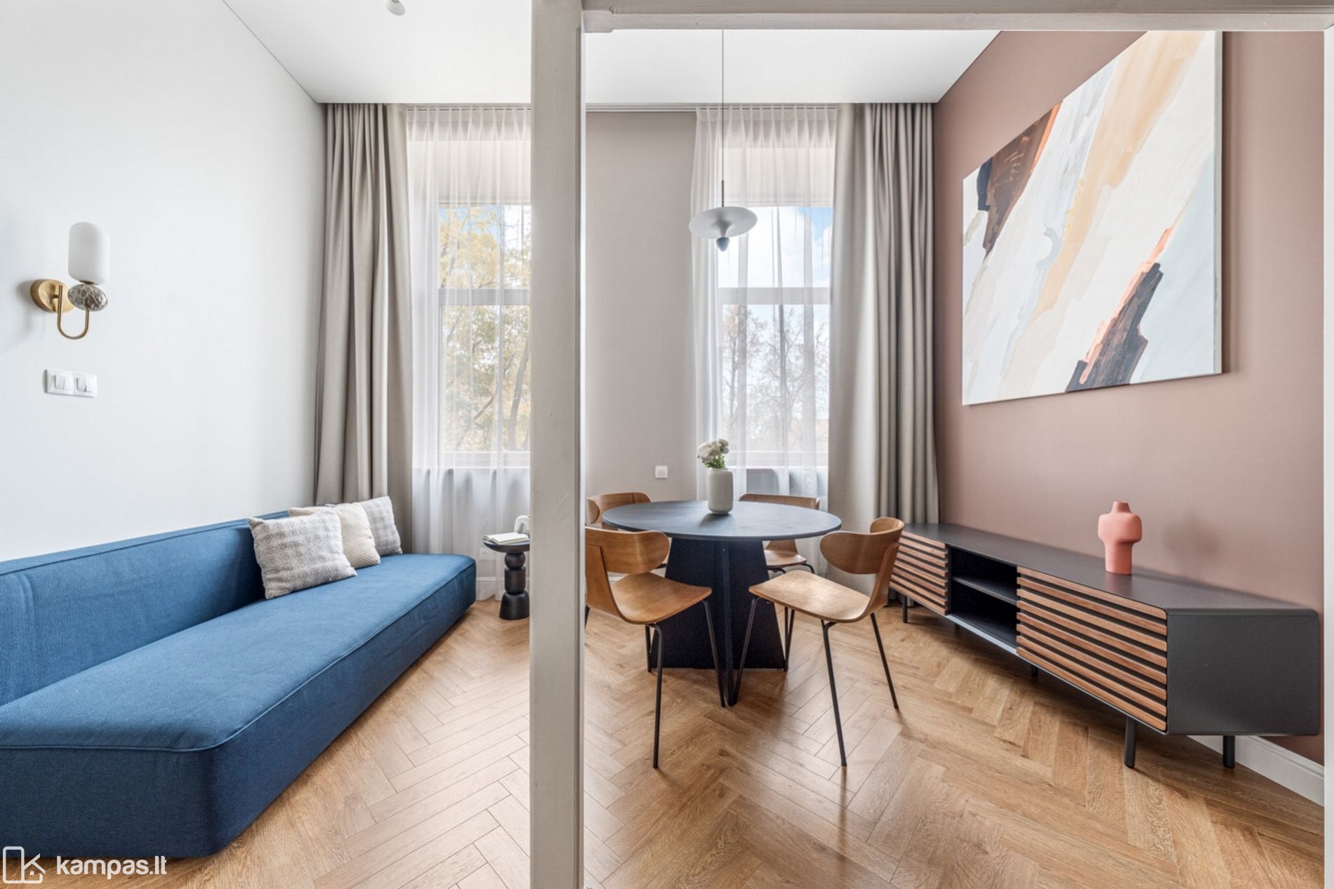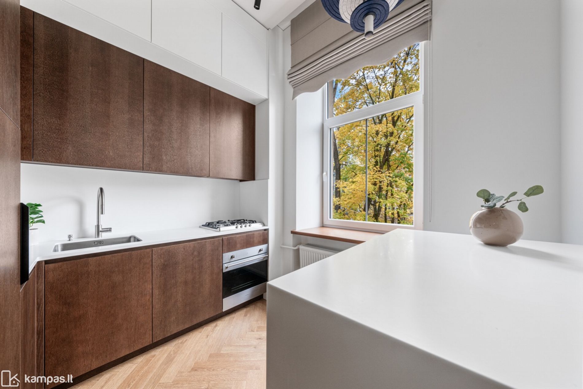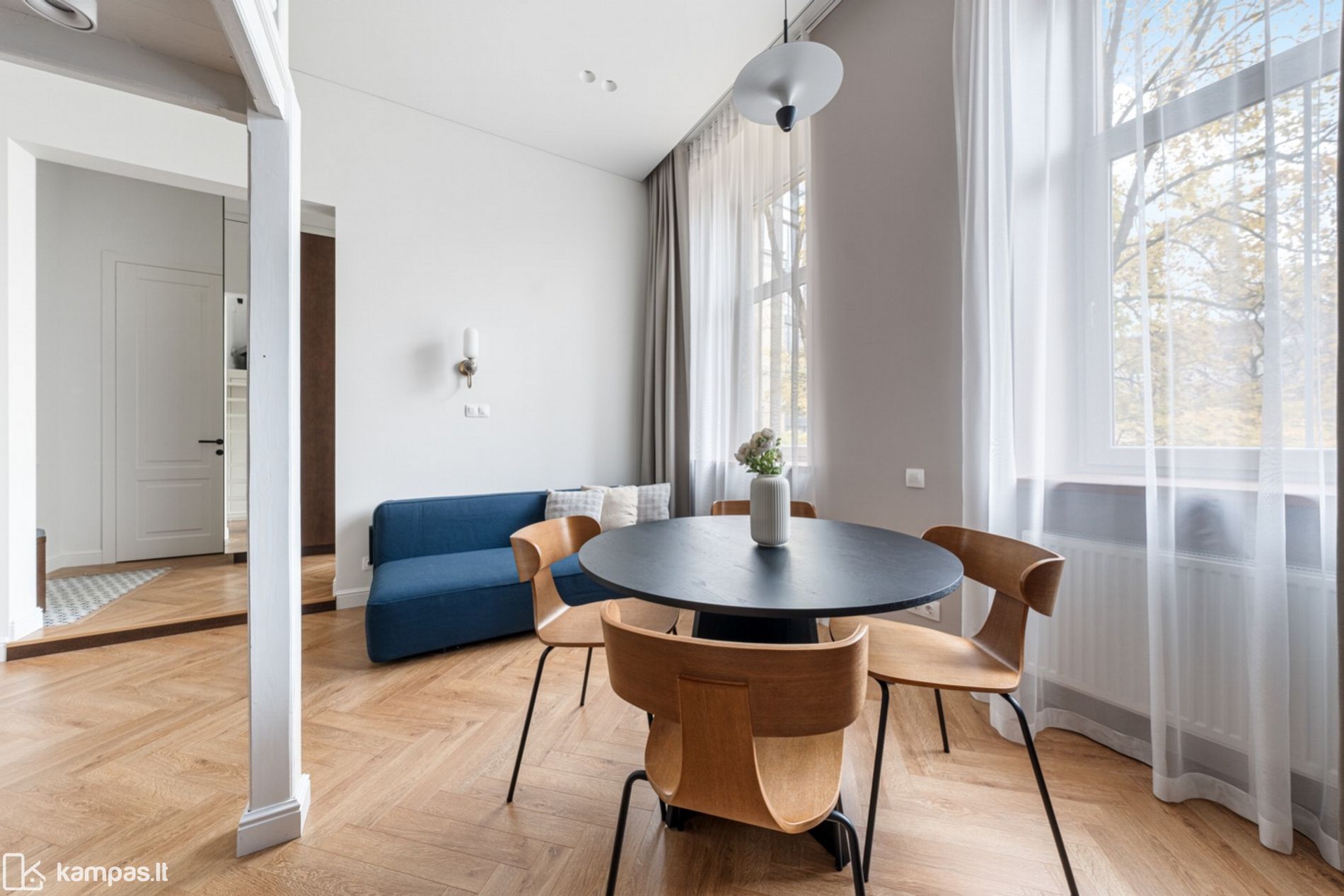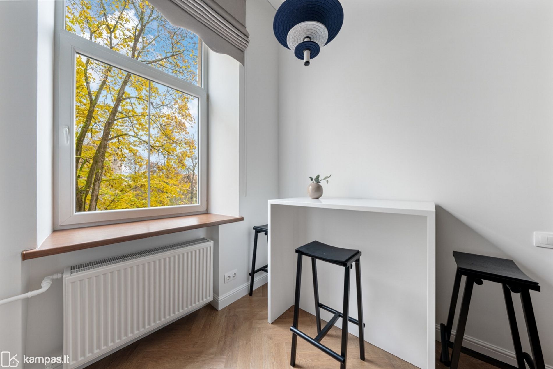 Vilniaus prestižinėje M.K. Čiurlionio gatvėje nuomojamas, dizainerio pagalba įrengtas butas aukštomis lubomis.