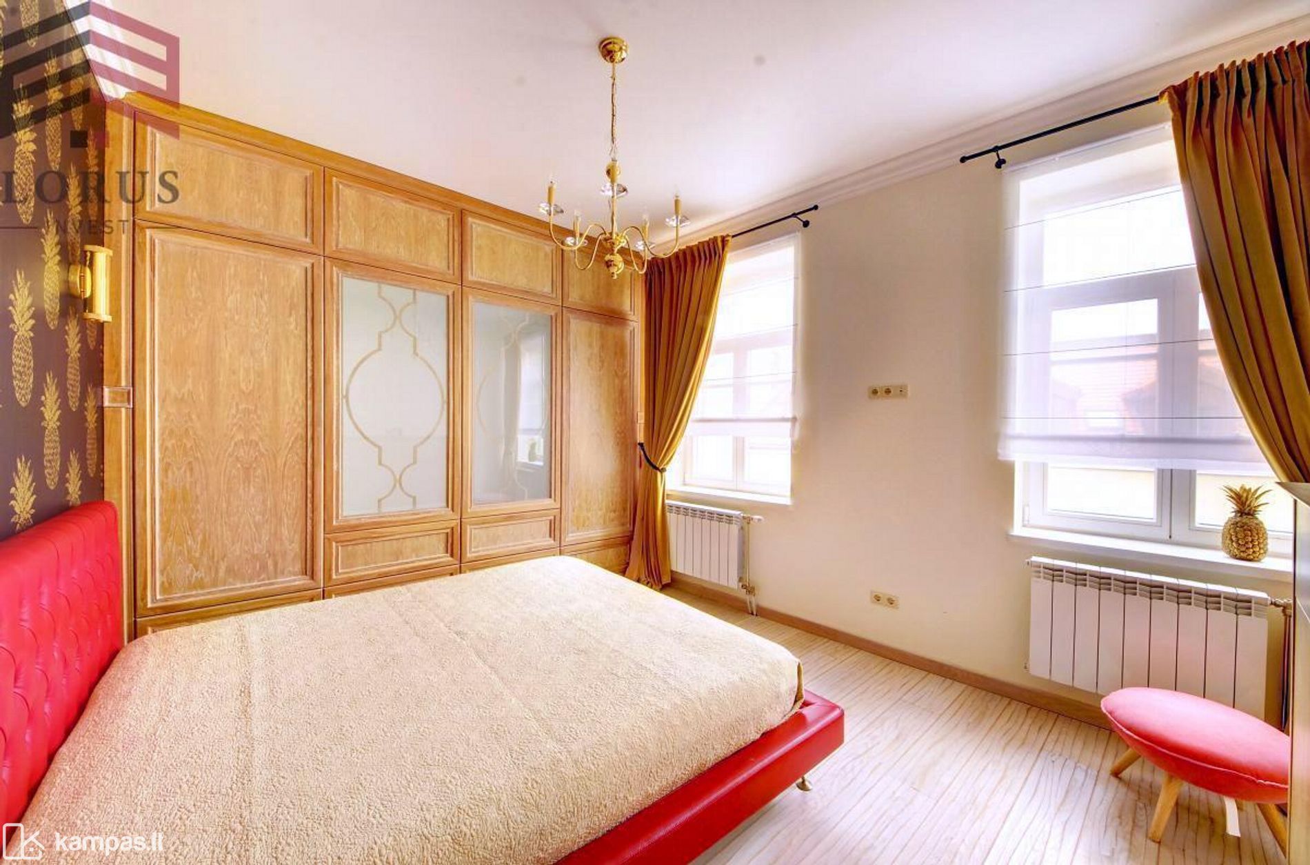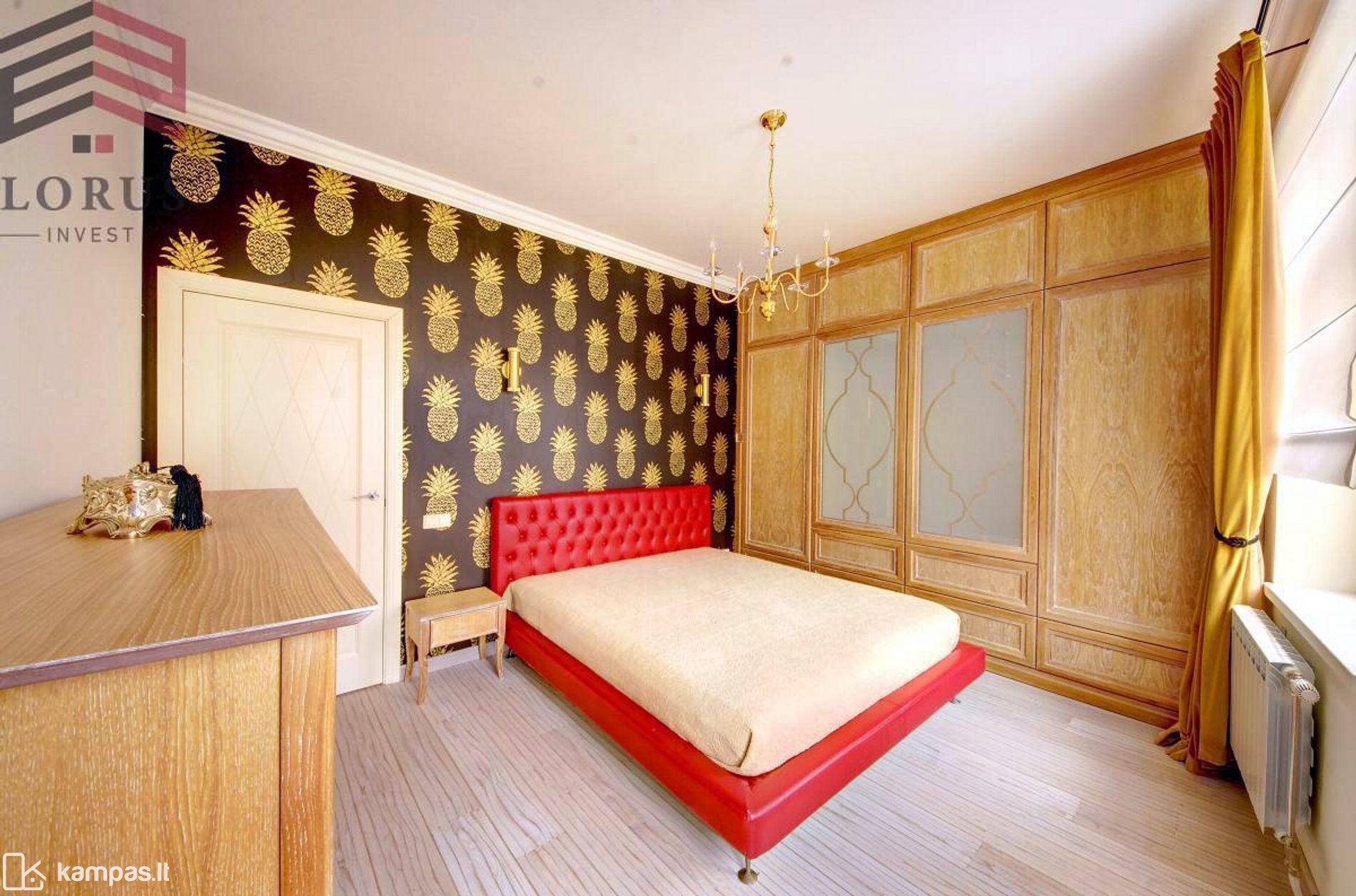 Virtuvė sujungta kartu su svetaine, vonios kambarys erdvus, jame įrengtos šildomos grindys, miegamajame itin erdvi spinta.