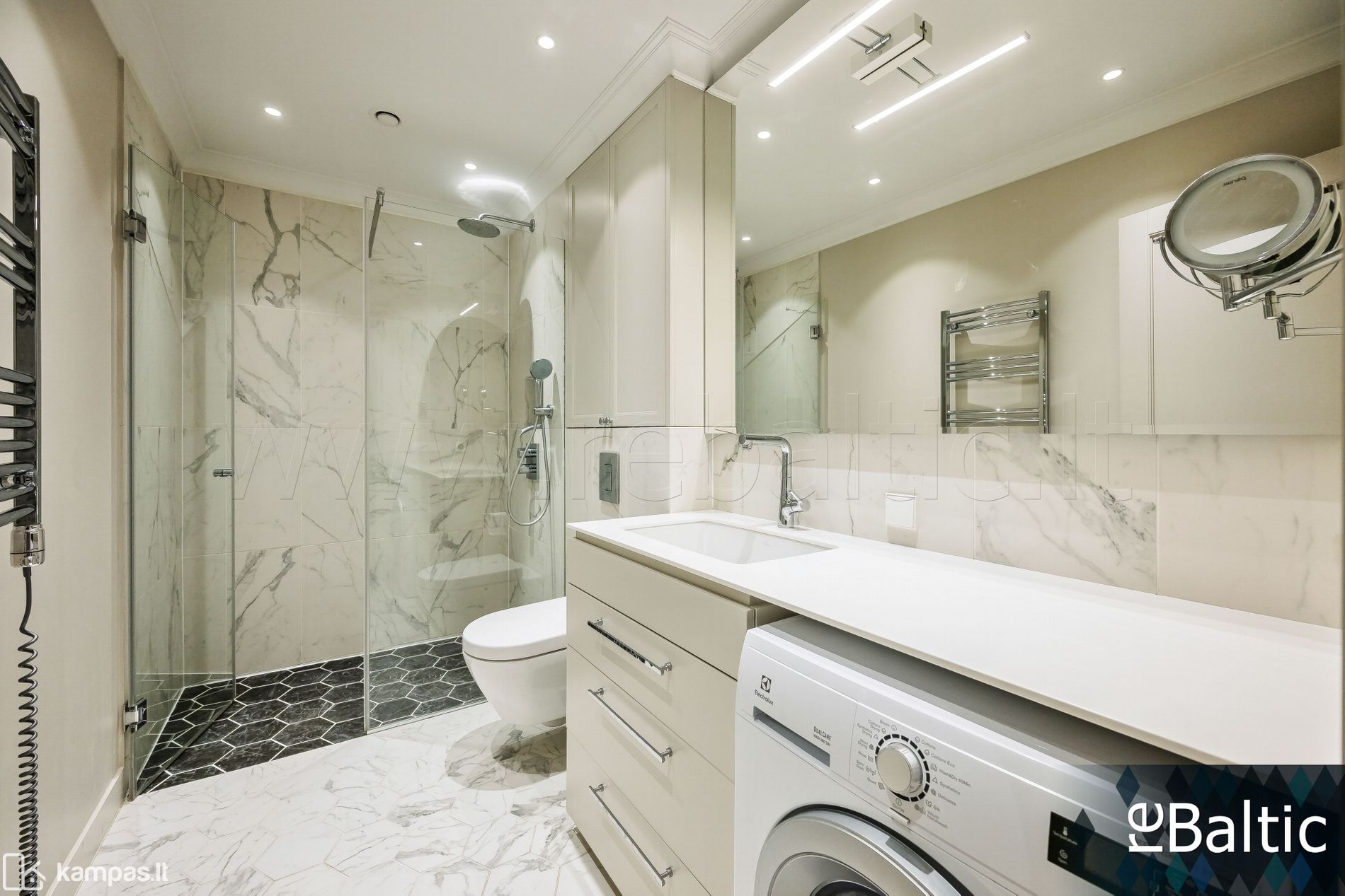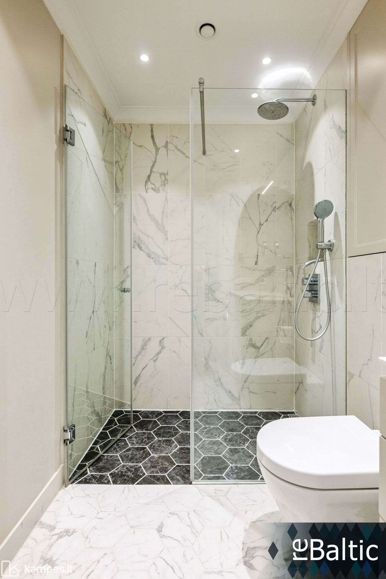 Erdvus vonios kambarys: dušas, WC, šiuolaikiškai įrengta erdvė patogiai kasdienybei;