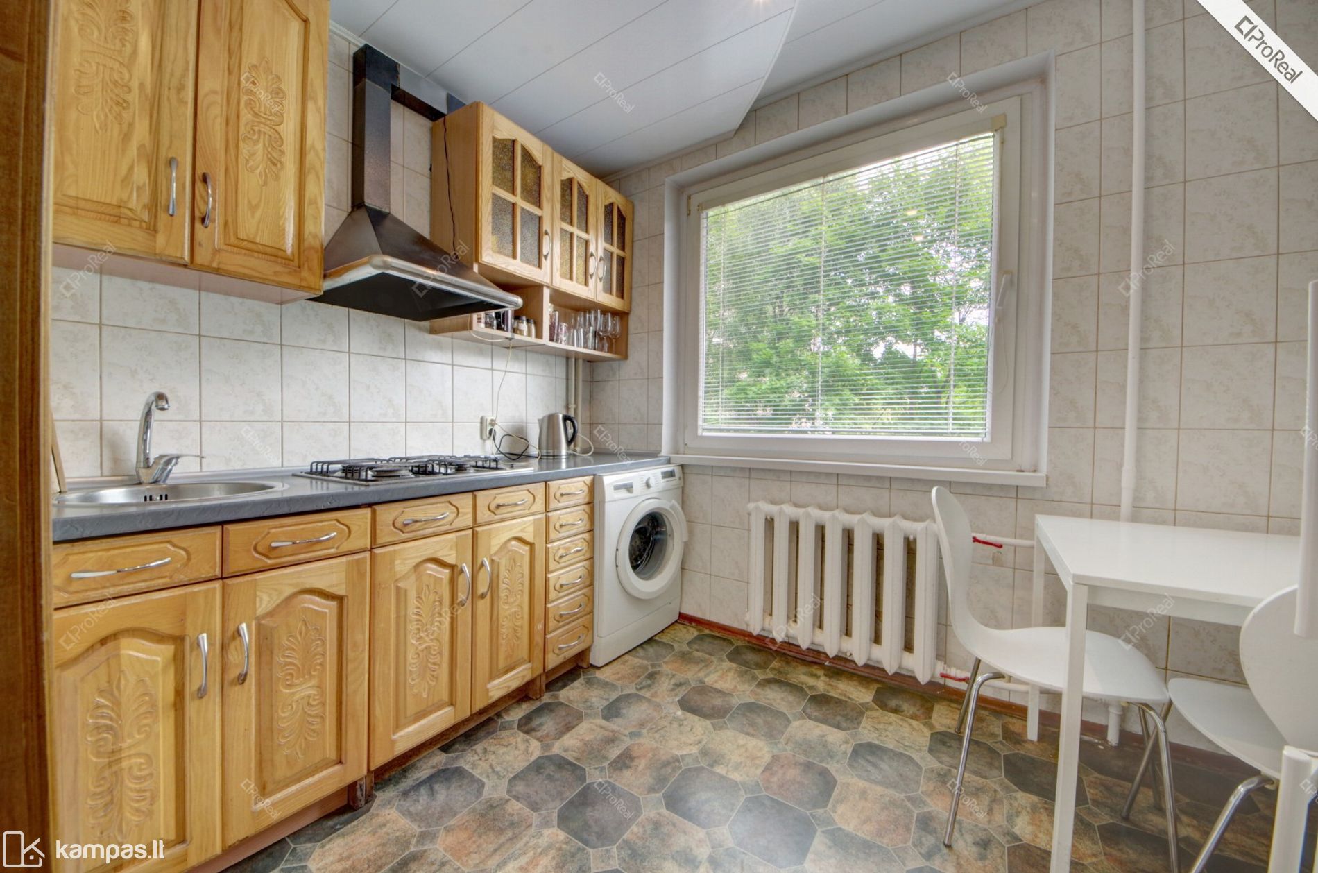Virtuvėje: kėdės, spintelės, stalas, virtuvės baldai.