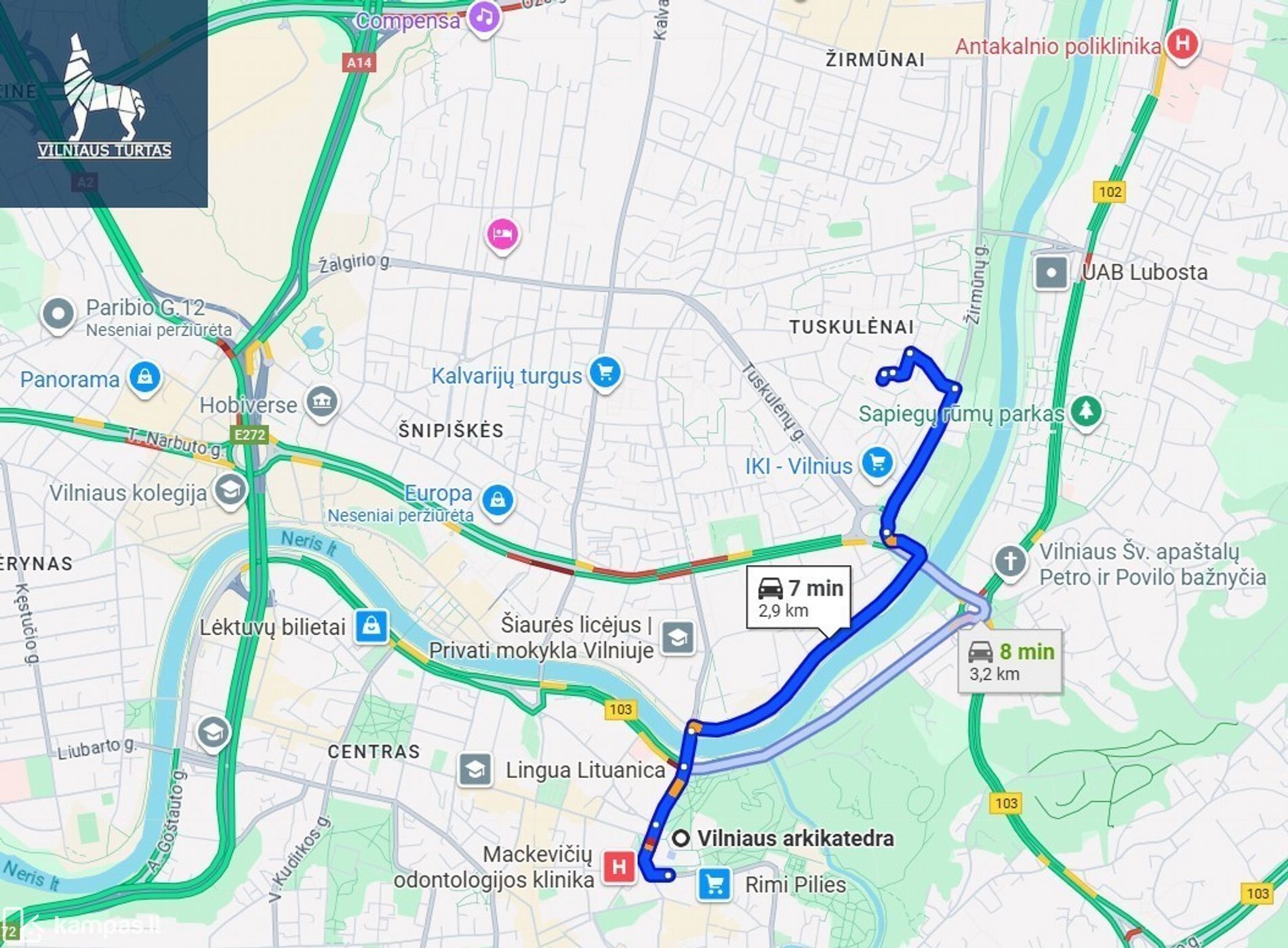 - Katedros aikštė – ~8 min. automobiliu, ~25 min. pėsčiomis.