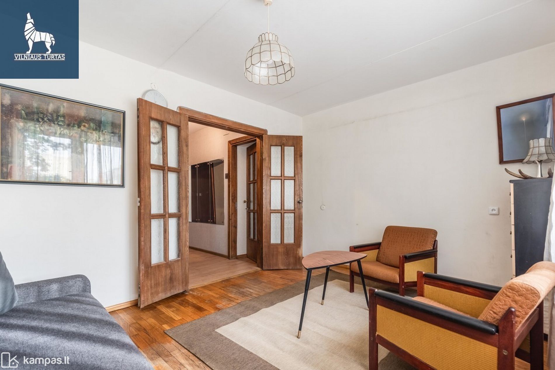 - Svetainė su plačiomis dvigubomis durimis, trivietė sofa.