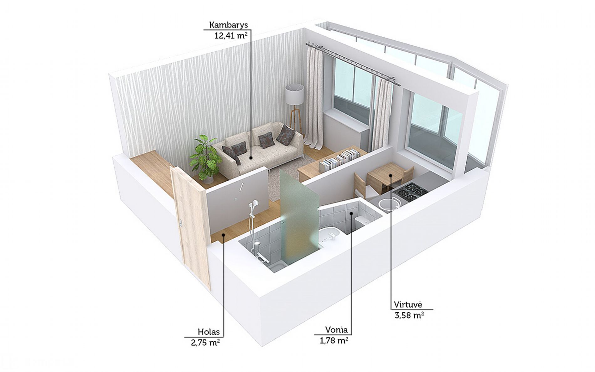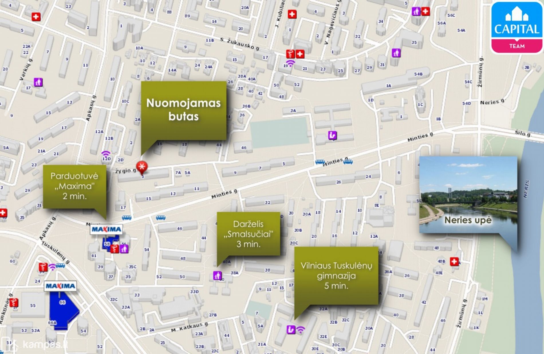 • Netoliese parduotuvės, vaikų darželiai, mokyklos, gydymo įstaigos, viešojo transporto stotelės, Neries upė.