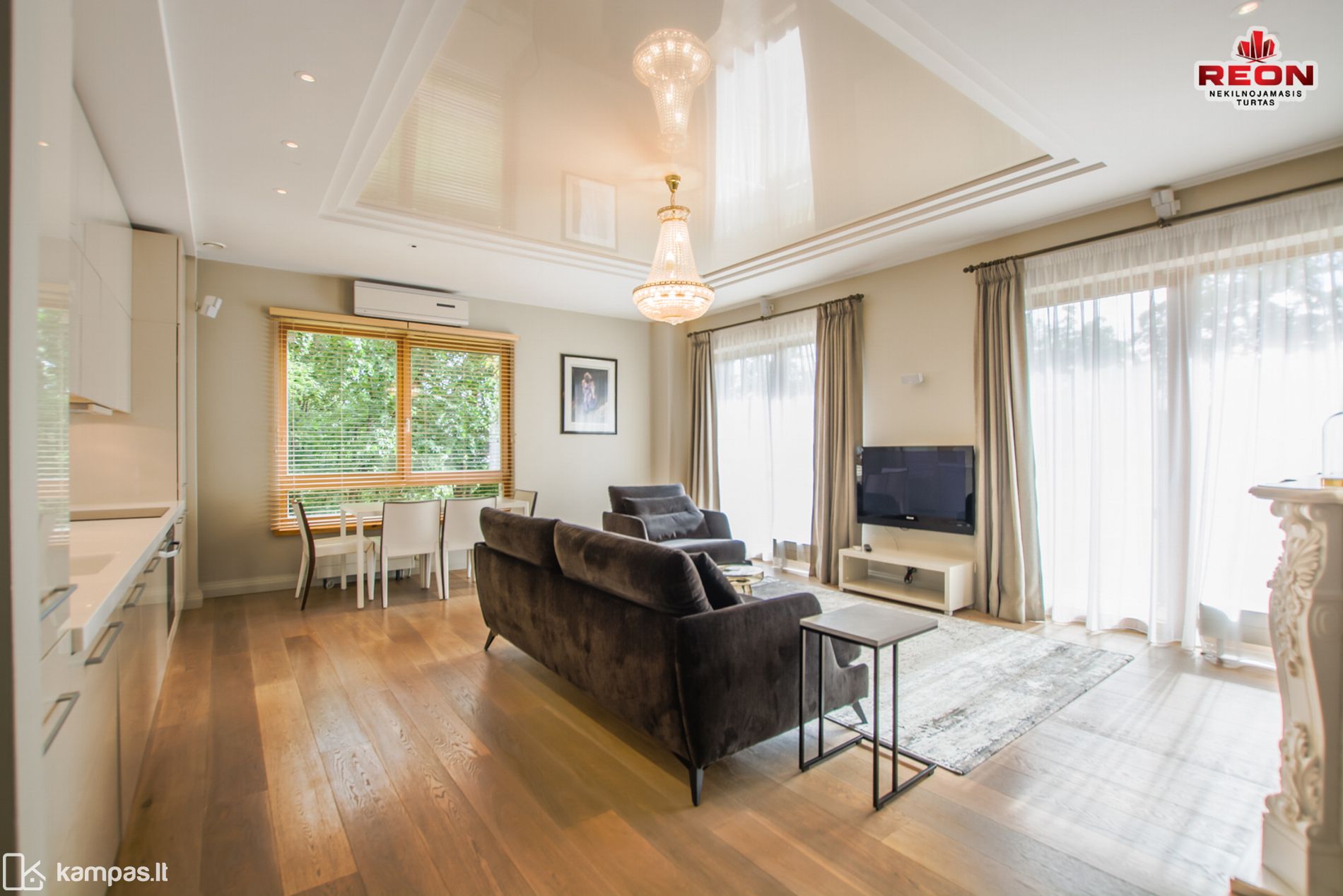 Butas pasižymi jaukia ir prabangia atmosfera. Svetainė sujungta su virtuve – erdvė šviesi, su dideliais vitrininiais langais, pro kuriuos atsiveria žalumos vaizdas. Virtuvė moderni, įrengta aukštos kokybės buitine technika, daug spintelių ir vietos maisto ruošimui. Šalia – valgomojo zona prie lango, kur malonu mėgautis rytine kava. Svetainėje stovi patogūs minkšti baldai, televizorius ir židinys, suteikiantis jaukumo ir šilumos pojūtį.