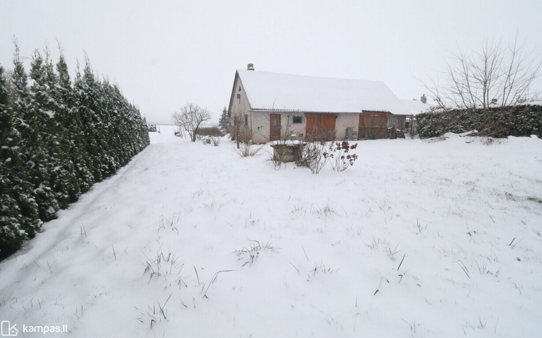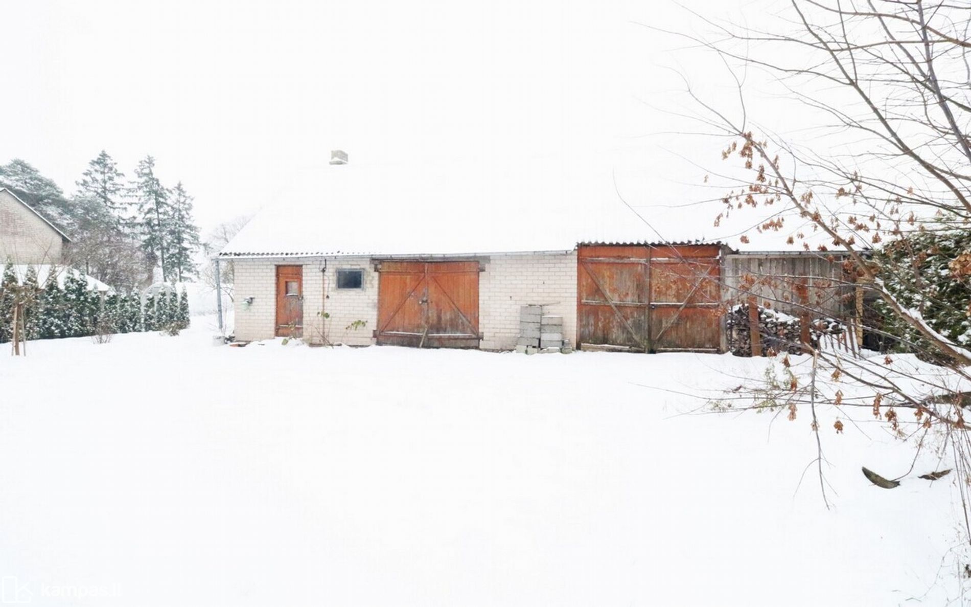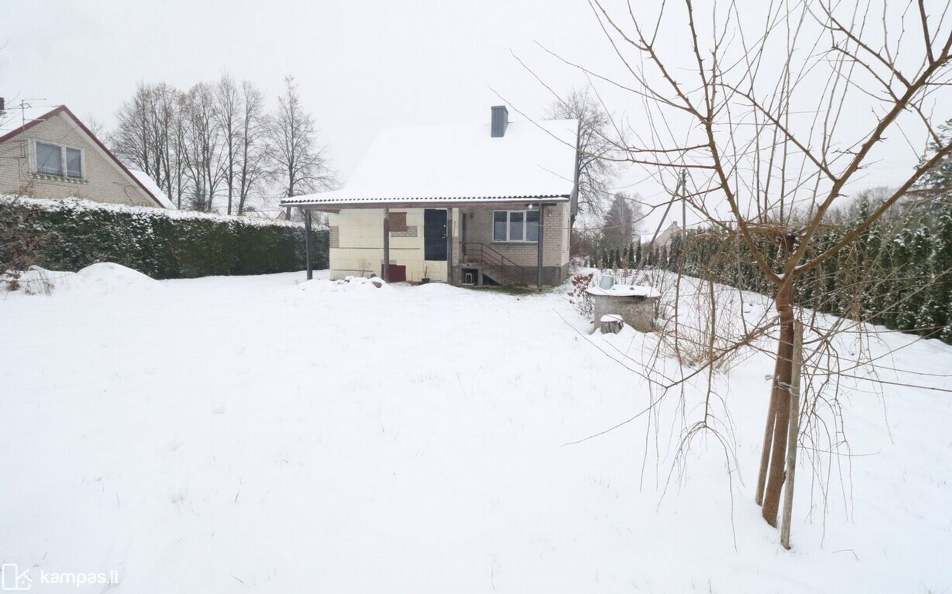 Aplink namą auga dideli dekoratyviniai krūmai ir medžiai, daug žalumos. Yra du įėjimai į namą.