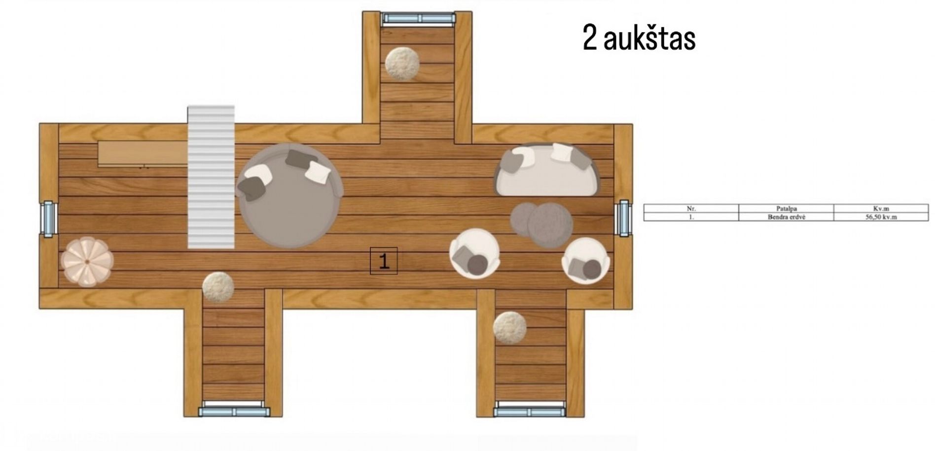 - 2 aukšto bendra erdvė: 56,50 kv.m.