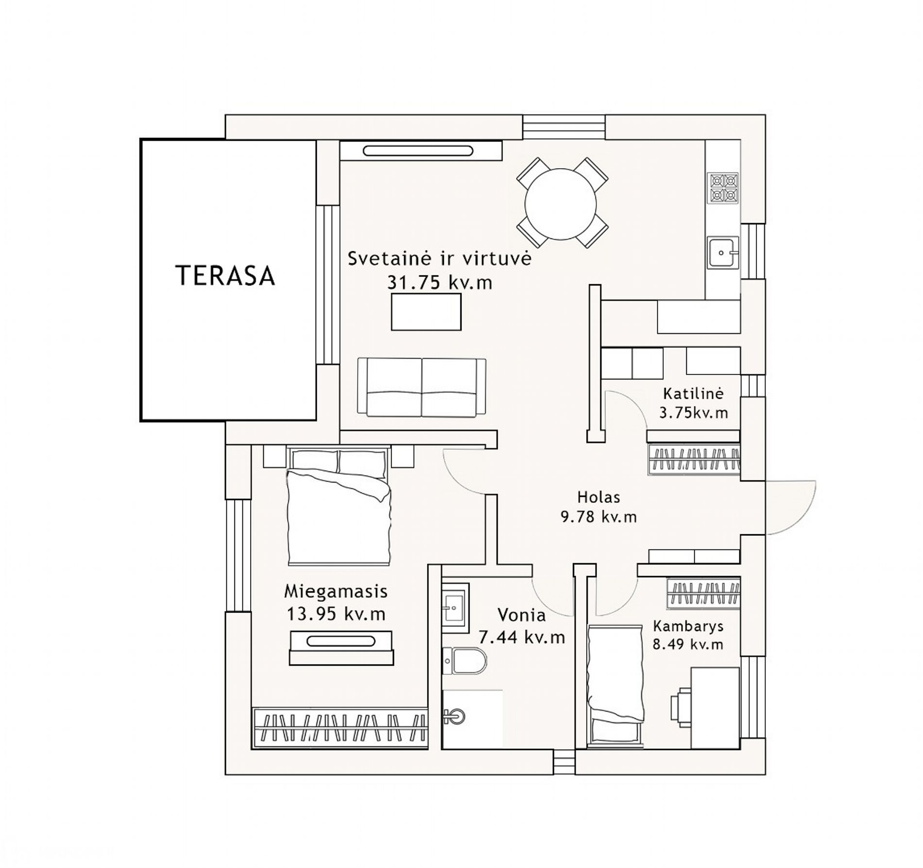 - Kambarių skaičius: 3 (2 miegamieji + svetainė su virtuve);
