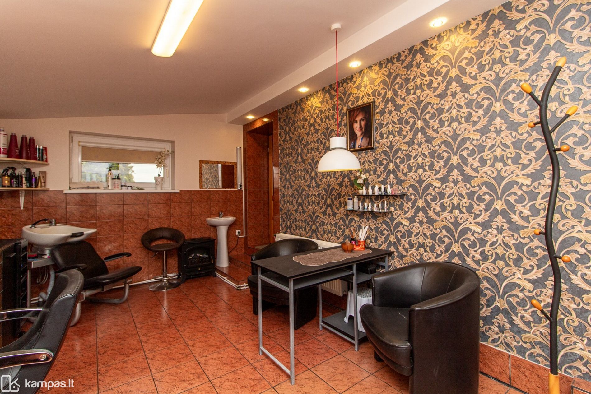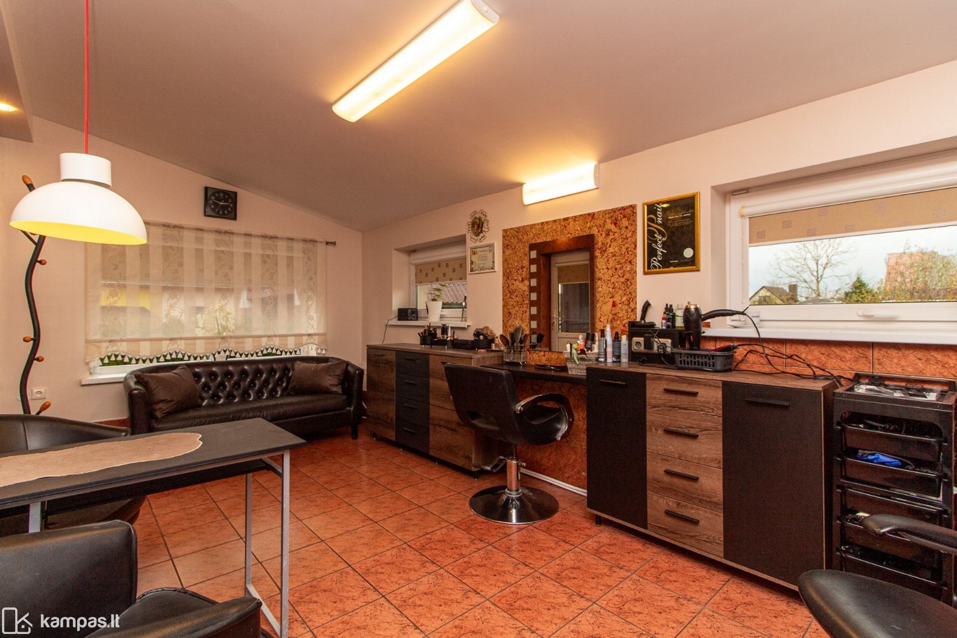 Pirmas aukštas: tambūras, koridorius, svetainė su virtuve (įrengtos šildomos grindys), miegamasis, kirpyklos patalpa, dušas ir tualetas vienoje patalpoje.