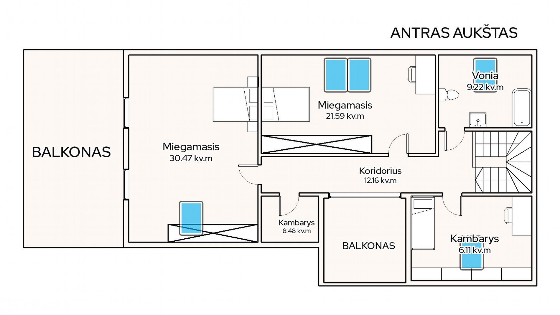 - Dujinis šildymas su kiekvieno kambario temperatūros reguliavimu;
