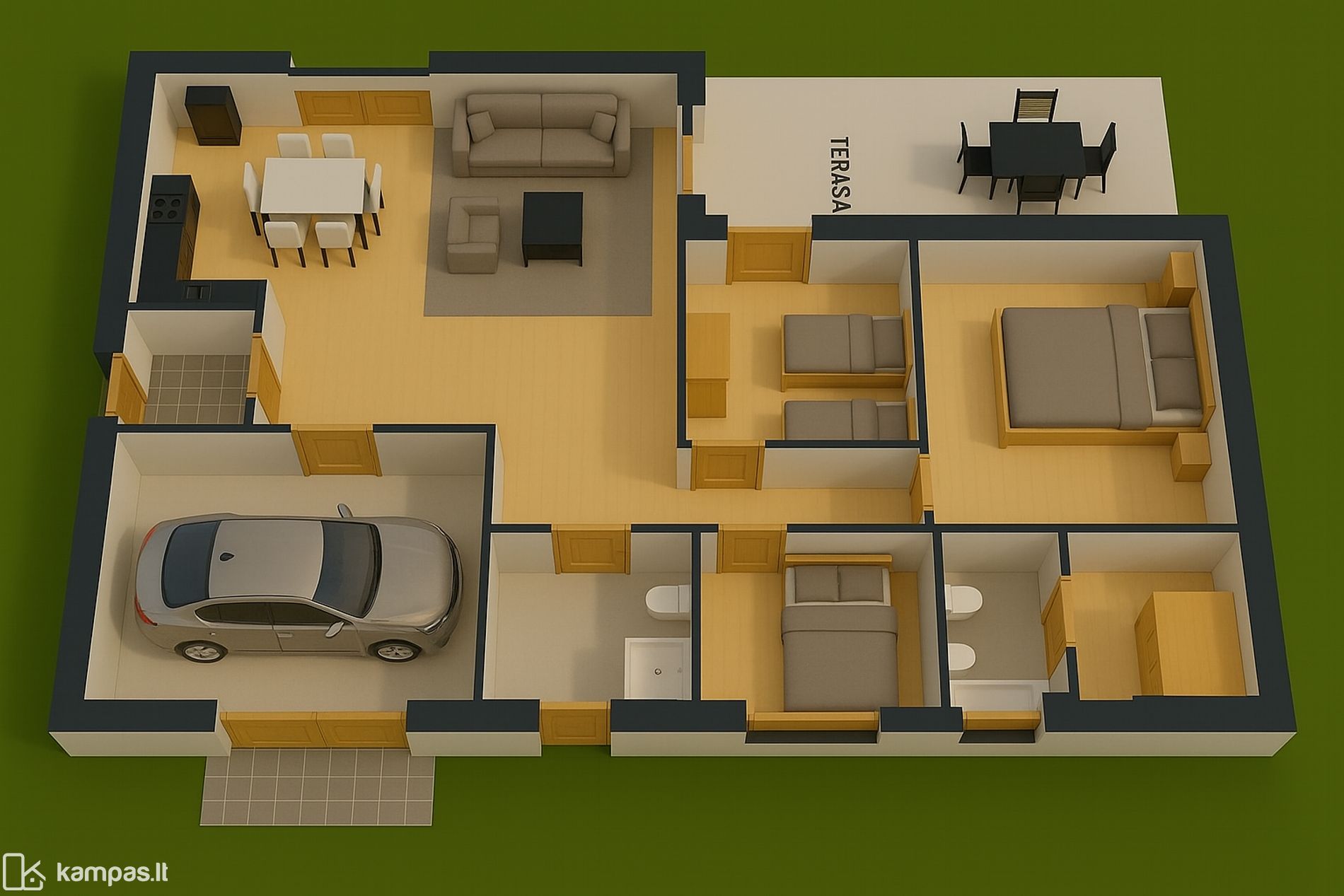 Parduodamas 1 aukšto Namas Panemunėje Viršučių g. NAUJA STATYBA! bendr. pl. 147 kv.m. ir 7a. žemės sklypas. Dalinė apdaila. Išplanavimas: svetainė sujungta su virtuve bendra erdvė 41kv,m., kambariai 20 kv.m. , 15 kv.m., 11 kv.m., vienas WC priklauso prie suaugusiųjų kambario, kitas WC skyrtas svečiams. Garažas 24 kv.m. Įrengimas: Stogas apšiltintas akmens vata, sienos ištinkuotos, elektros instaliacija, rekuperacija ir grindinis šildymas išvedžioti. Miesto vanduo ir kanalizacija. Lauko sienos apšiltintos putų polisteroliu ir aptinkuotos dekoratyviniu tinku. Langai plastikiniai vokiški kokybiški su trijų stiklų paketais. Elektros įvadas 11 kw. Šildymas oras vanduo. Vieta lauko terasai su išėjimu iš svetainės. Sklypas lygus . Teritorija aptverta.