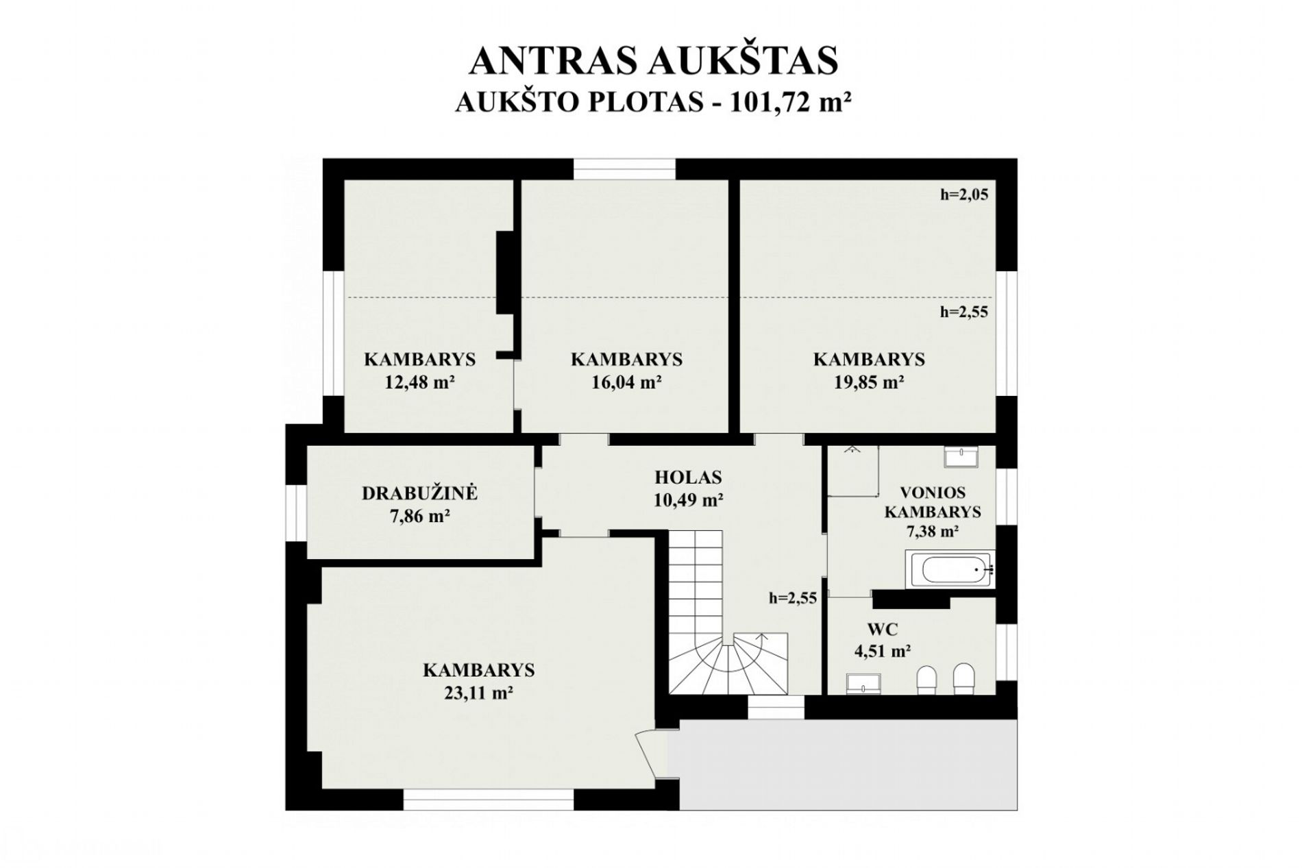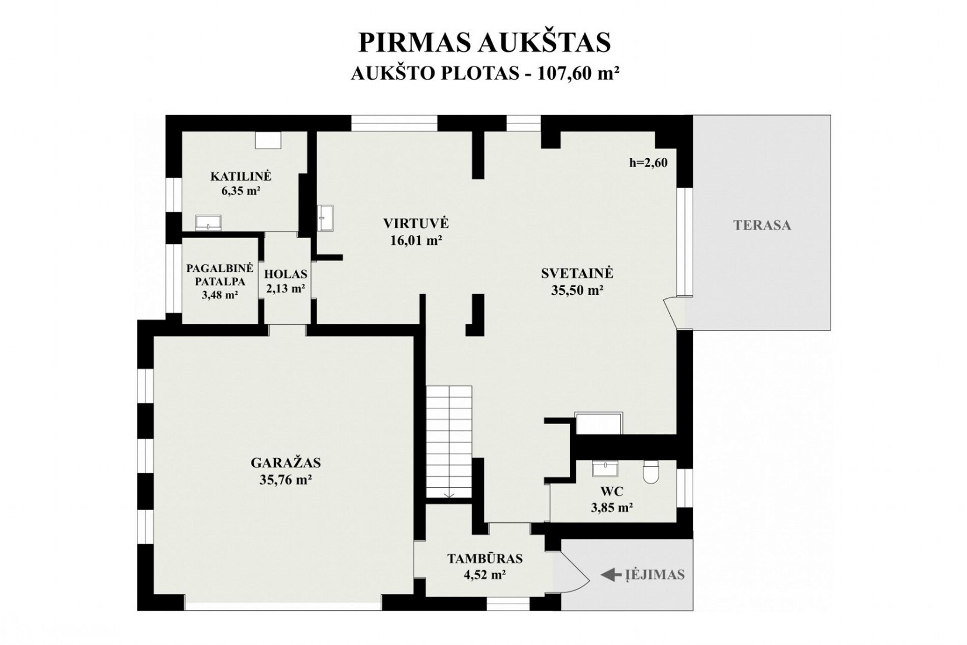 Vidaus erdvės suplanuotos funkcionaliai – aiškiai atskirtos gyvenamosios ir poilsio zonos. Pirmas aukštas veikia kaip viena didelė, patogi šeimos erdvė.