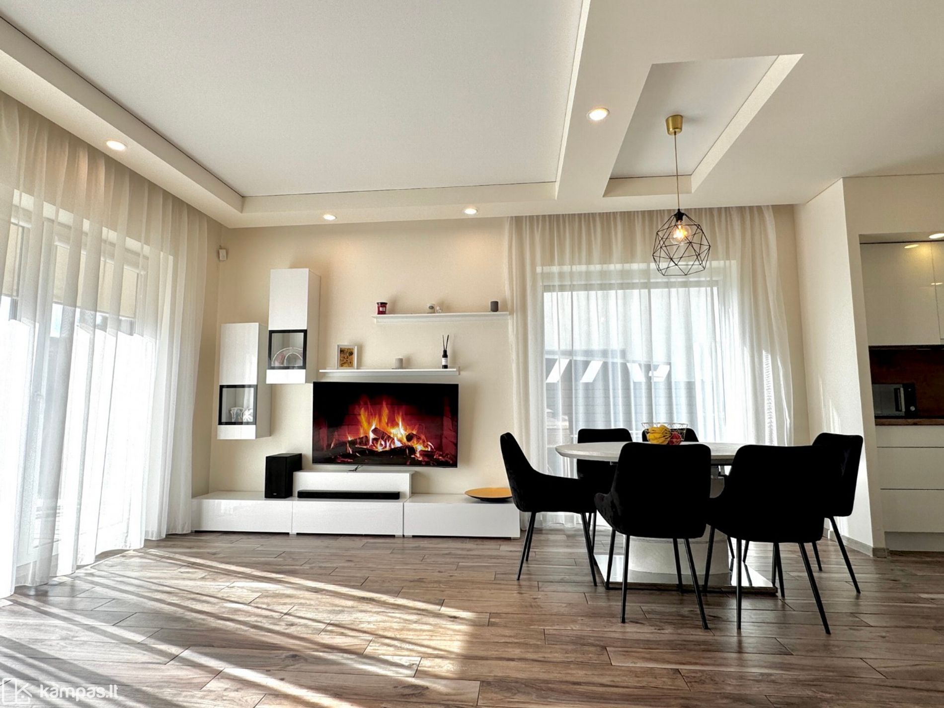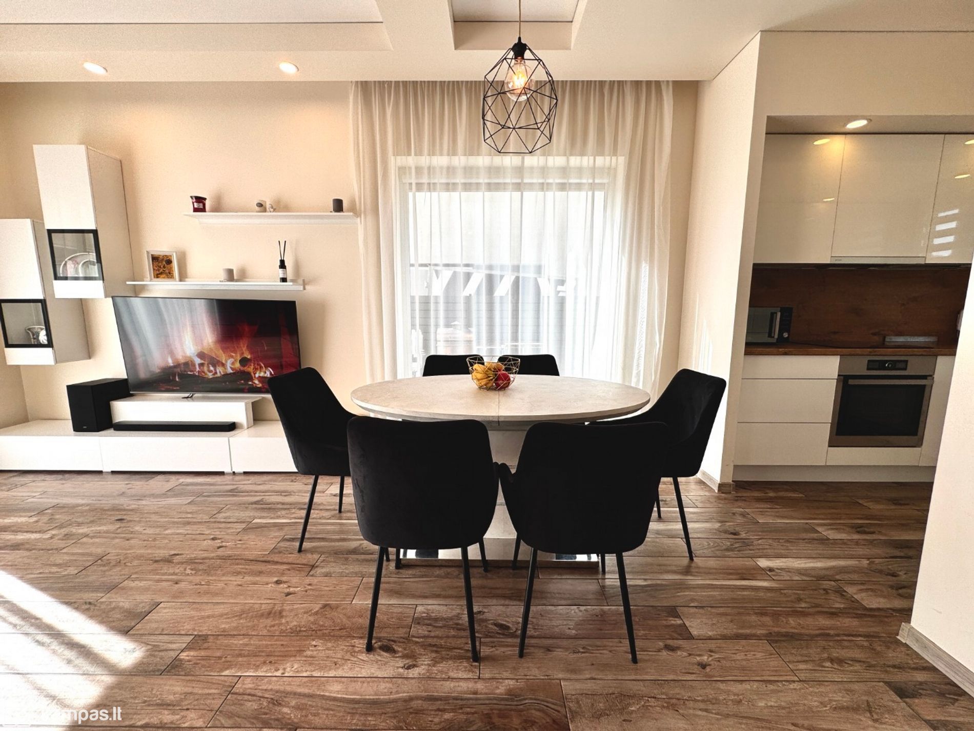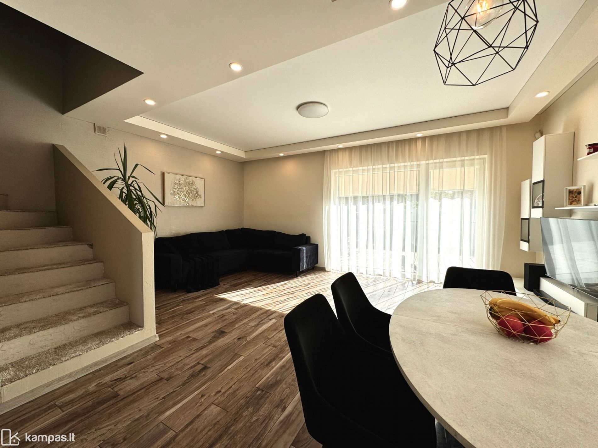 Erdvus pirmas aukštas, kur svetainė sujungta su virtuve ir valgomu – šeimos vieta bendram laikui.