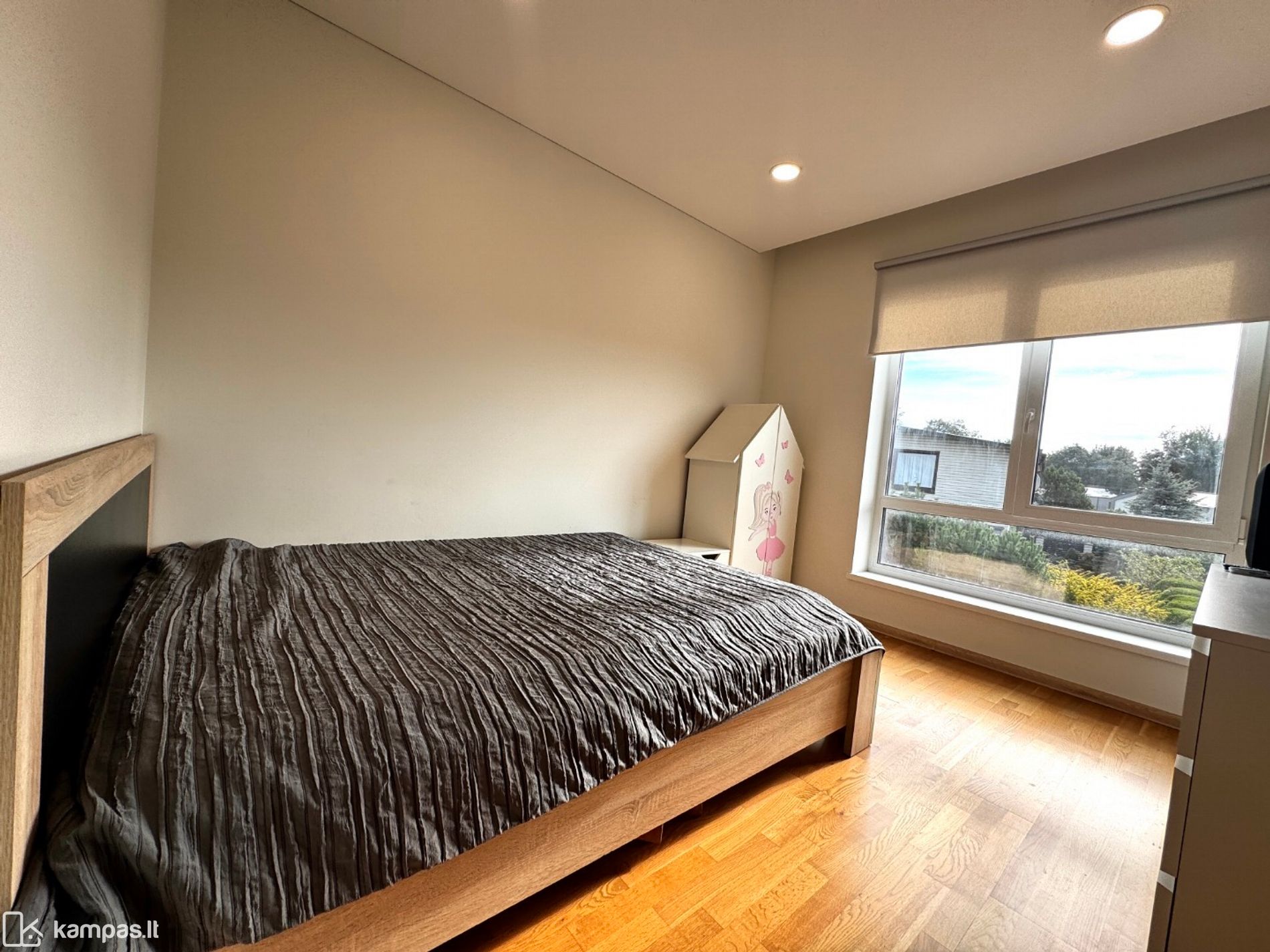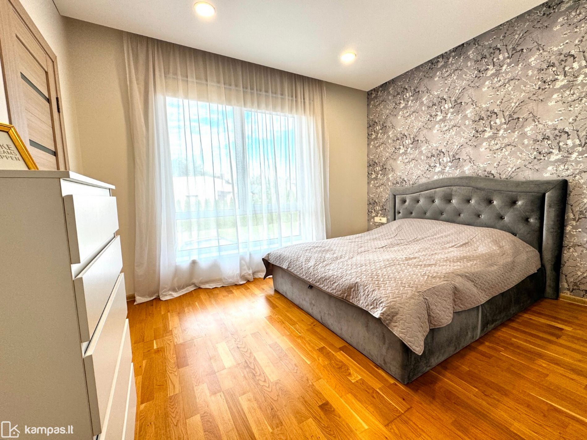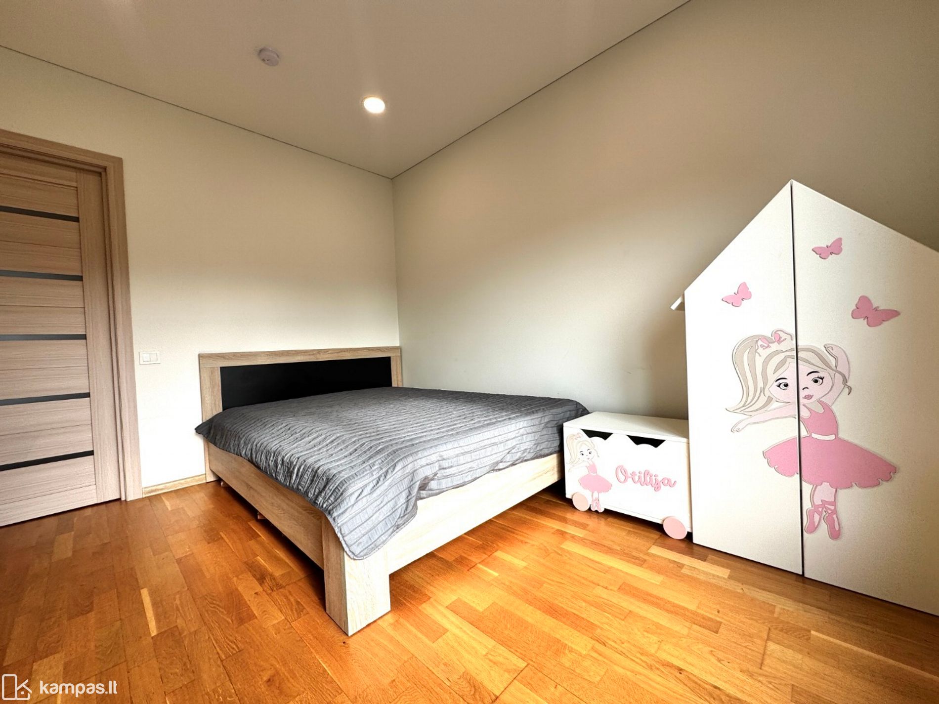 Antrame aukšte trys miegamieji – kiekvienam savo kampas. Tėvų miegamajame yra atskira drabužinė.