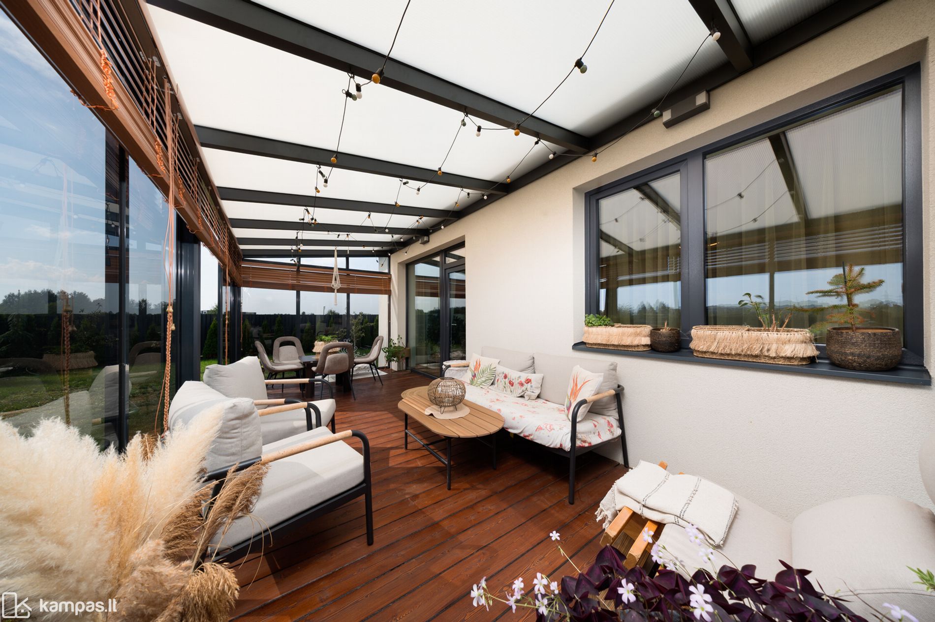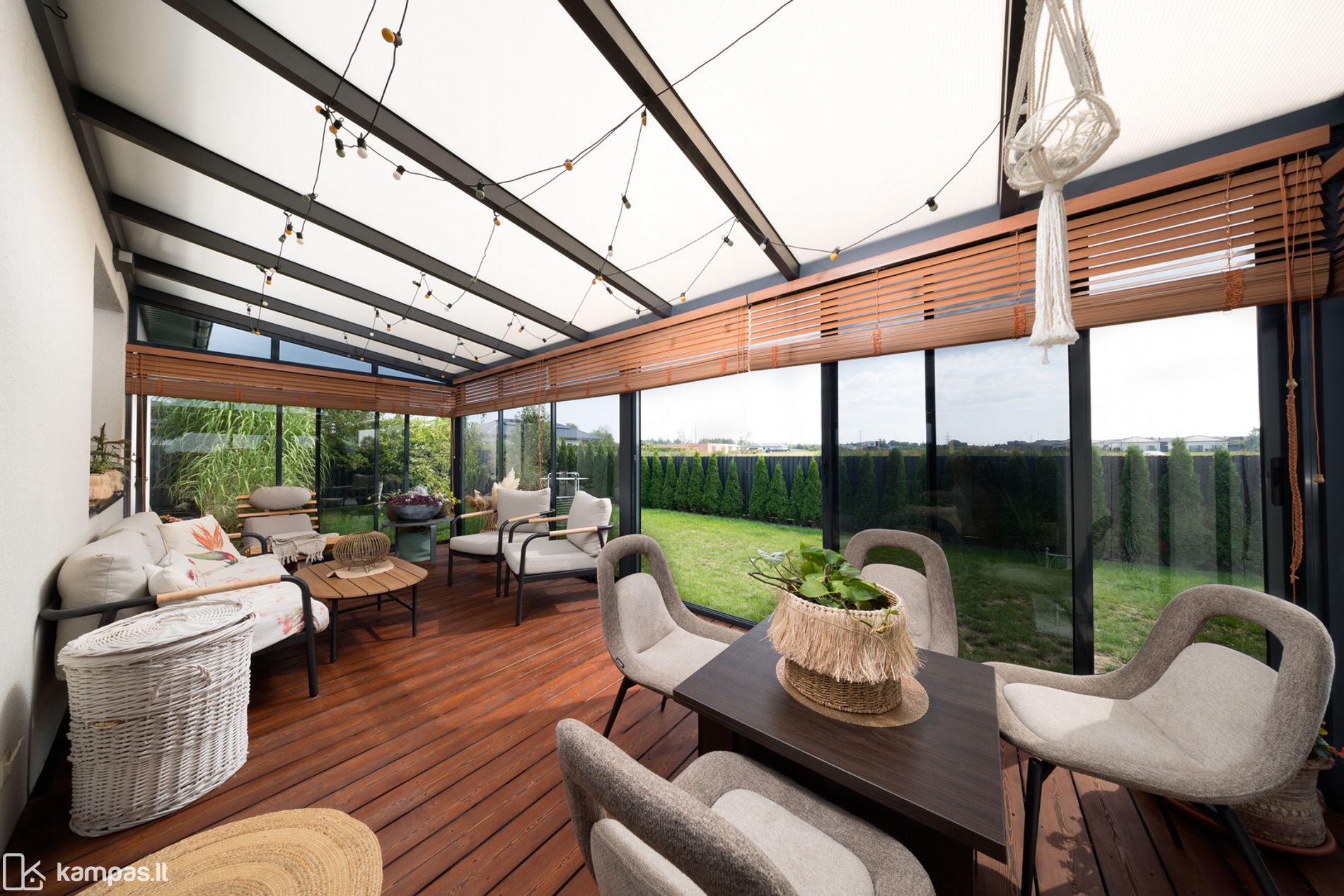 Privatus, apželdintas ir aptvertas kiemas sukuria tikrų namų jausmą, tačiau didžiausias šio namo pasididžiavimas - erdvi įstiklinta terasa po stogu kviečia leisti laiką gryname ore tiek šiltais vasaros vakarais, tiek vėsesnėmis dienomis idealiai tinkanti šeimos vakarienėms ar jaukiems susitikimams su draugais. Terasa pastatyta iš itin kokybiškų medžiagų: impregnuotos natūralaus medžio grindys, aliuminio profilių pilnai varstomi langai, natūralaus medžio vidaus žaliuzės, tonuotas terasos stogas. Terasa yra pilnai apstatyta baldais, o jos bendra plotas ~30 kv.m. Tai vieta, kurioje galima mėgautis gamta neišeinant iš namų – ramybė, šviesa ir komfortas vienoje erdvėje!
