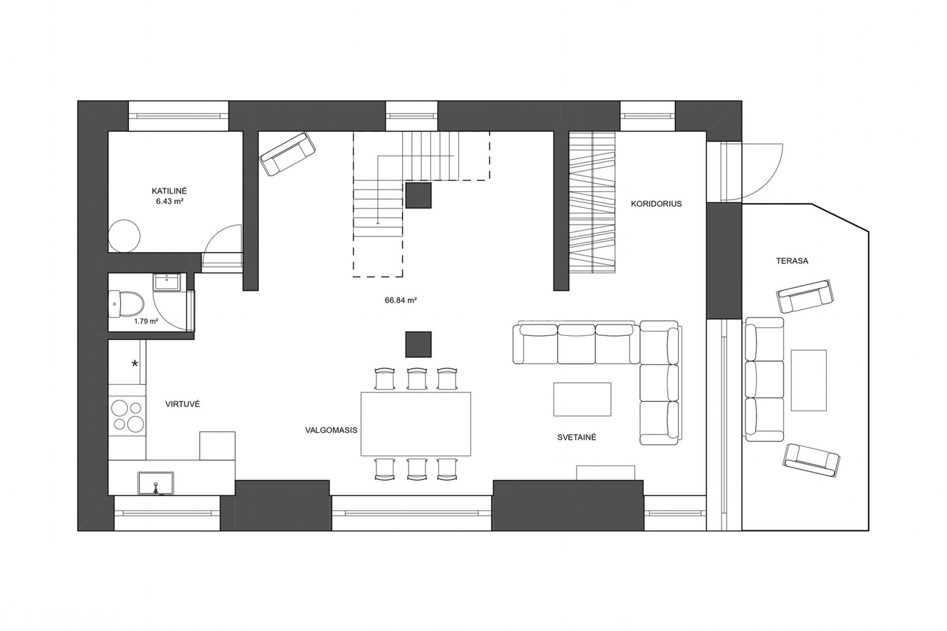 I aukšte - erdvi rūbinė, svetainė, virtuvė, tualetas, sandėliukas.