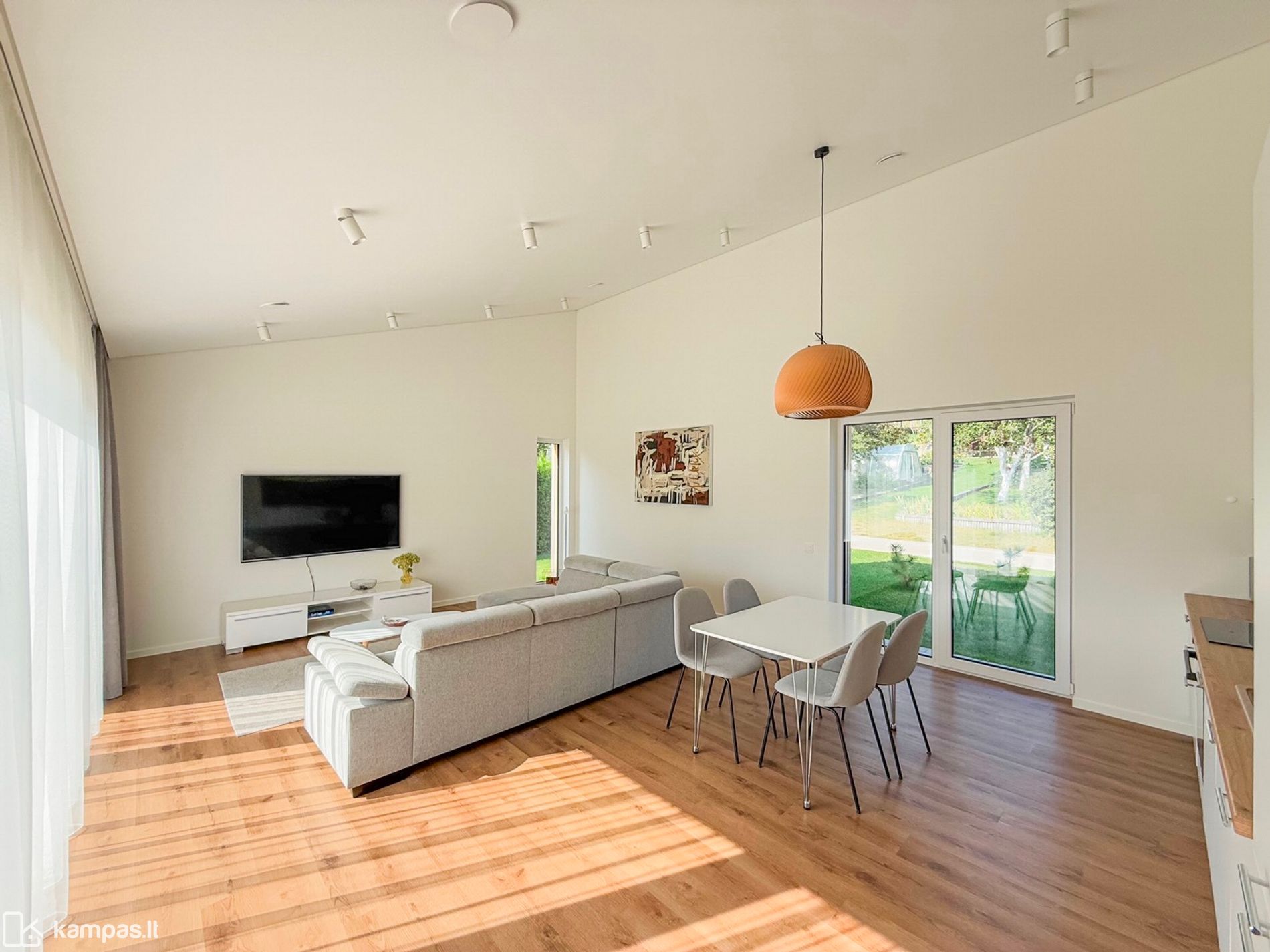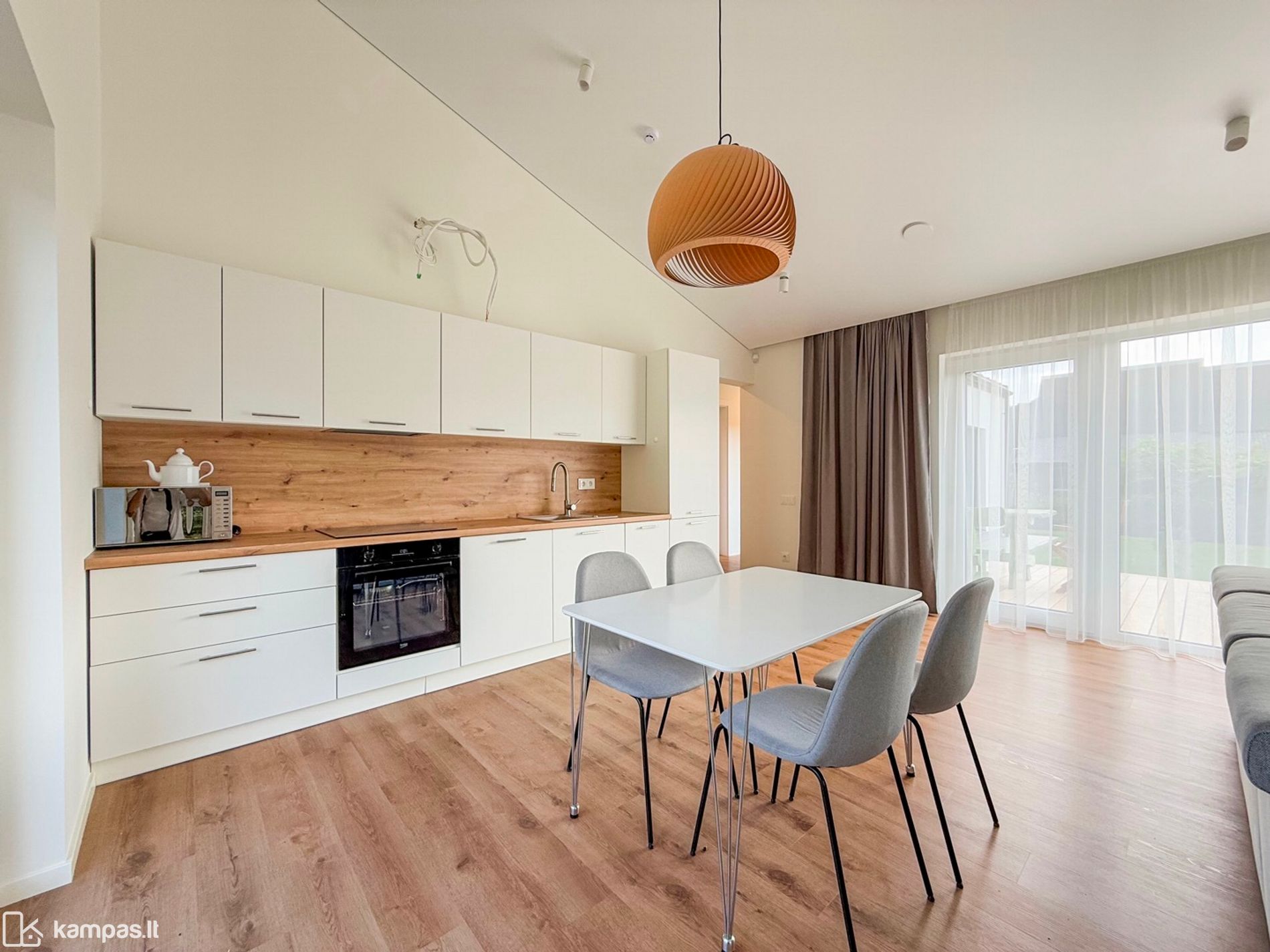 - ĮRENGTAS, aukštos lubos, su baldais ir buitine technika;