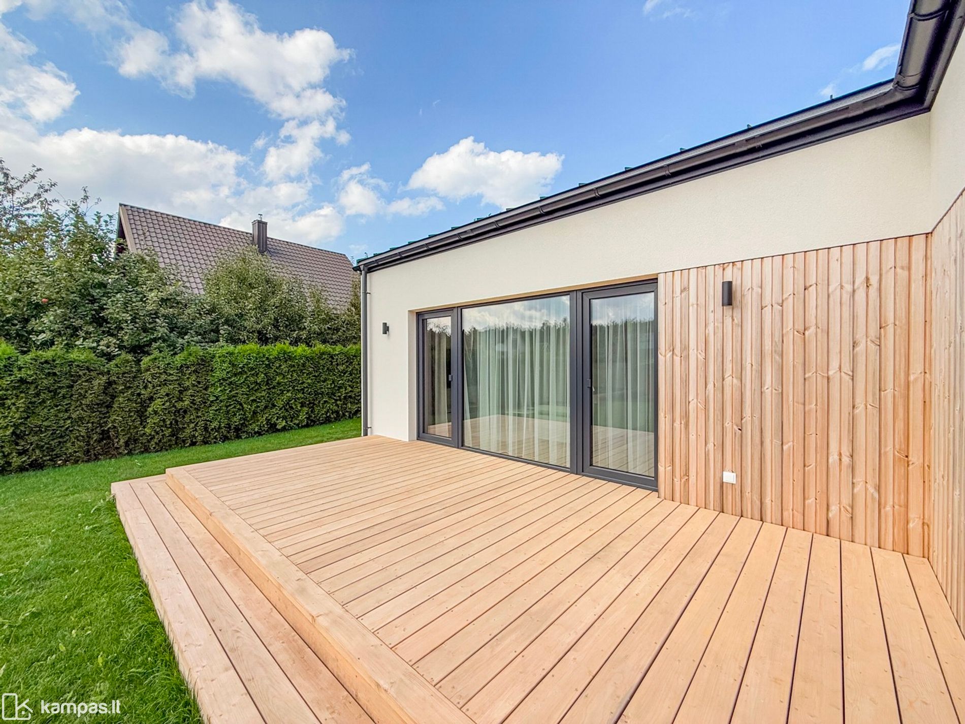 - Fasado apdaila - struktūrinis tinkas su termo medienos intarpais;