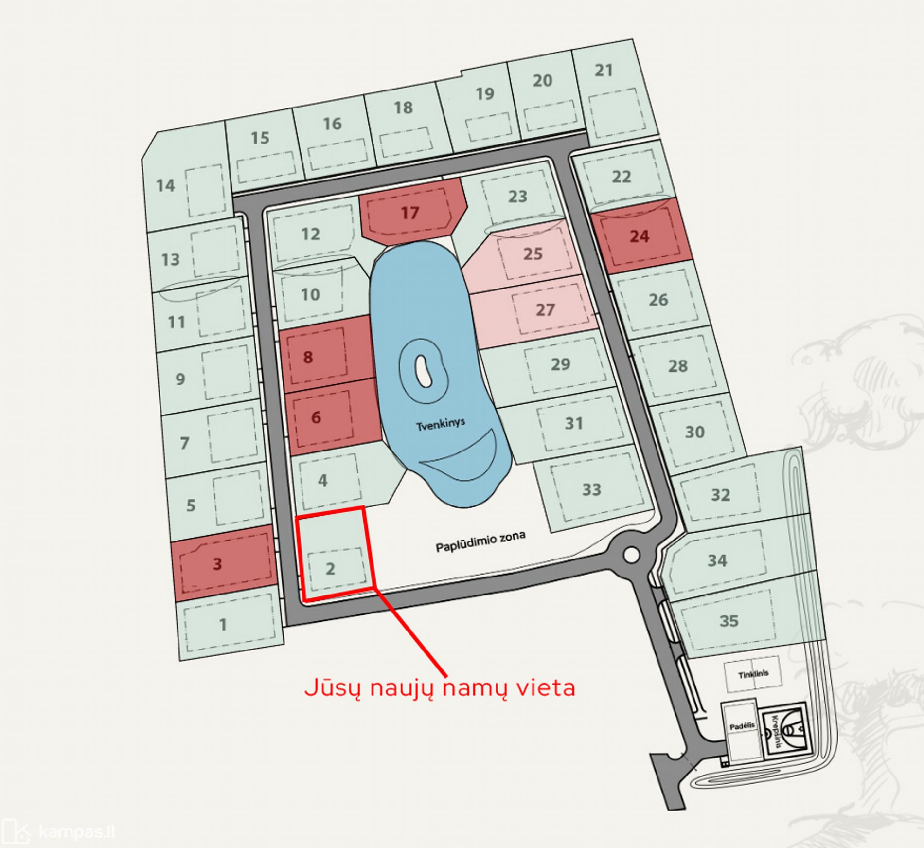 • Aplinka – zonos atskirtos kalvelėmis, galimybė apželdinti vaismedžiais ar gėlių pievomis.