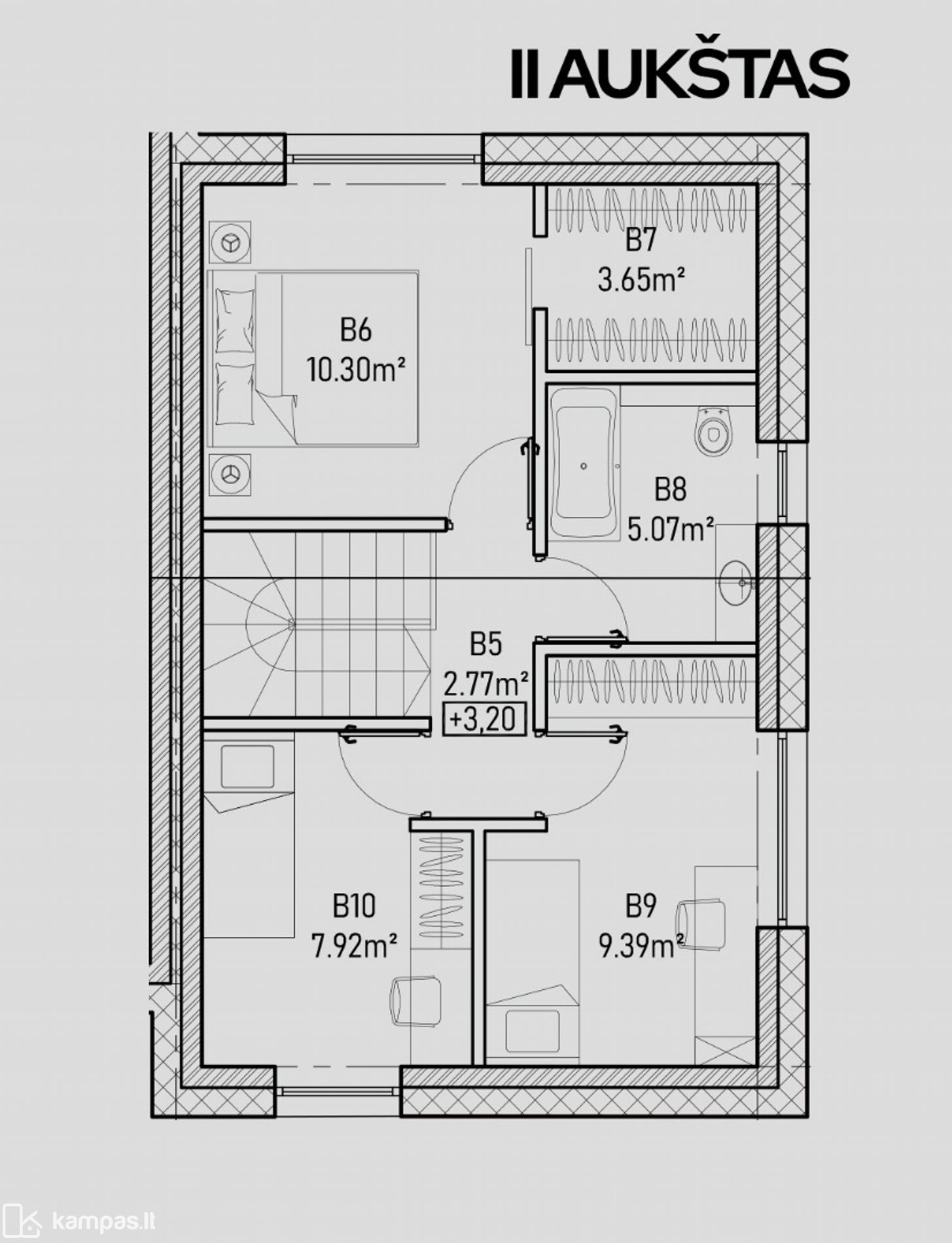 Antrame aukšte trys miegamieji: 10.30 kv. m, 9.39 kv. m, 7.92 kv. m