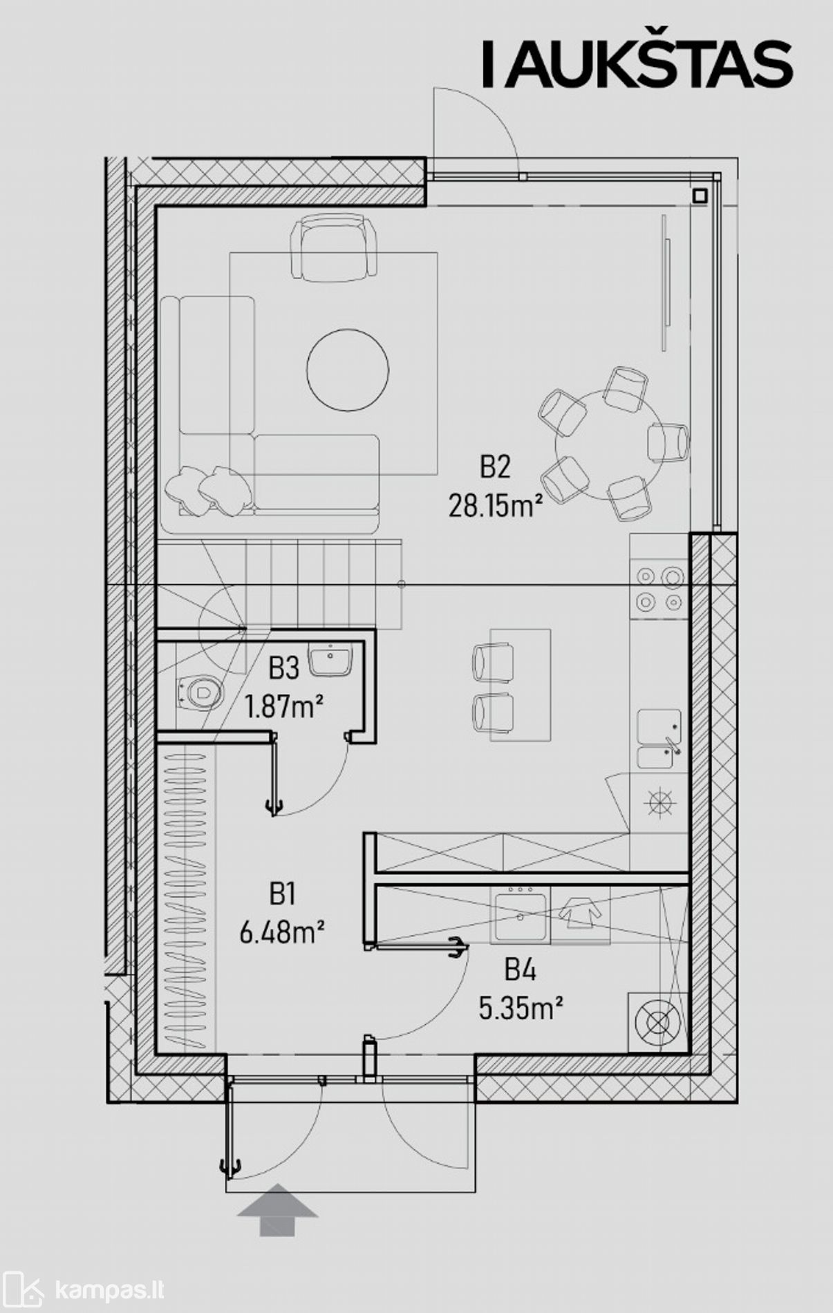 Pirmas aukštas: erdvi svetainės su virtuvės zona 28.15 kv. m