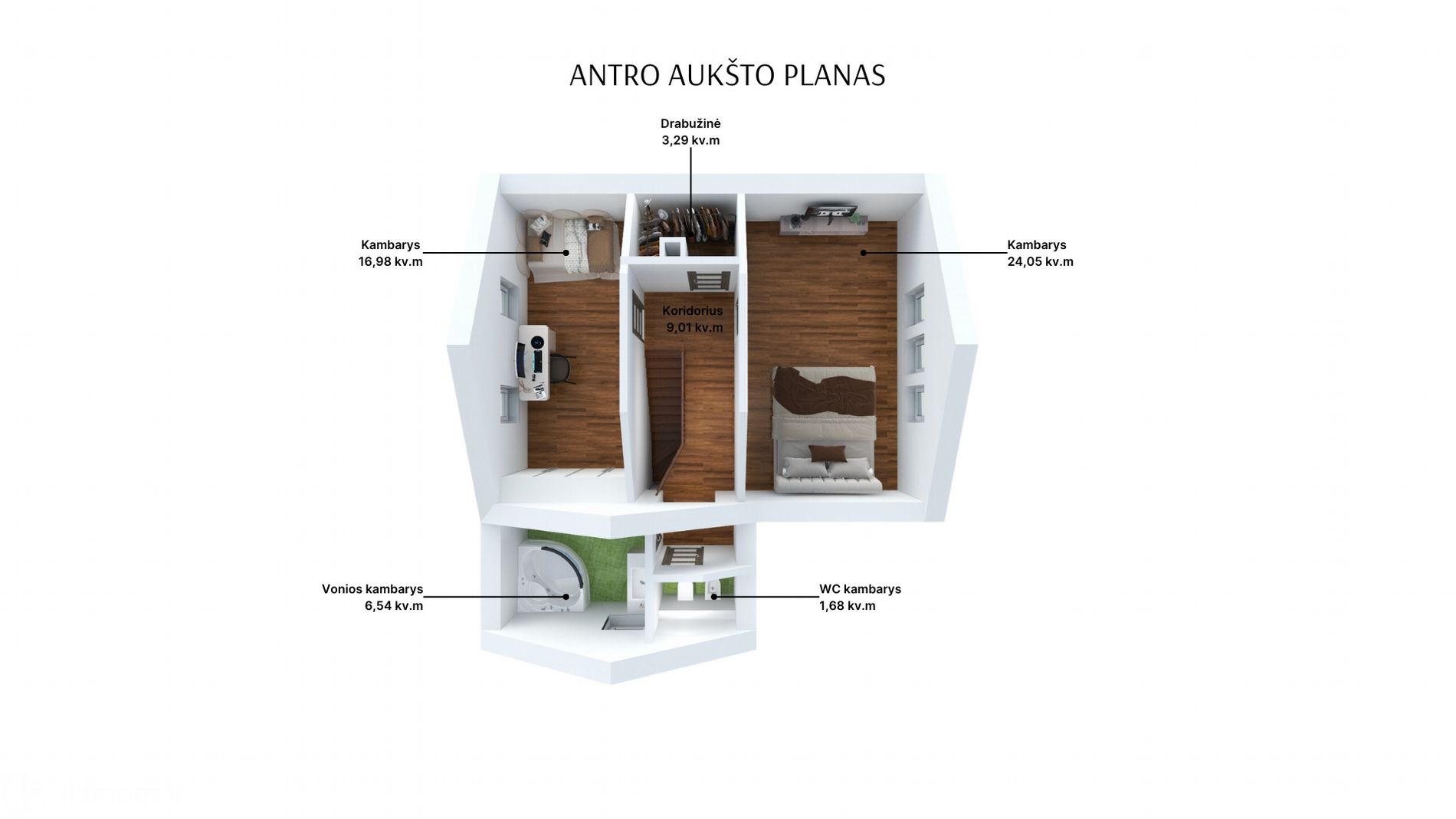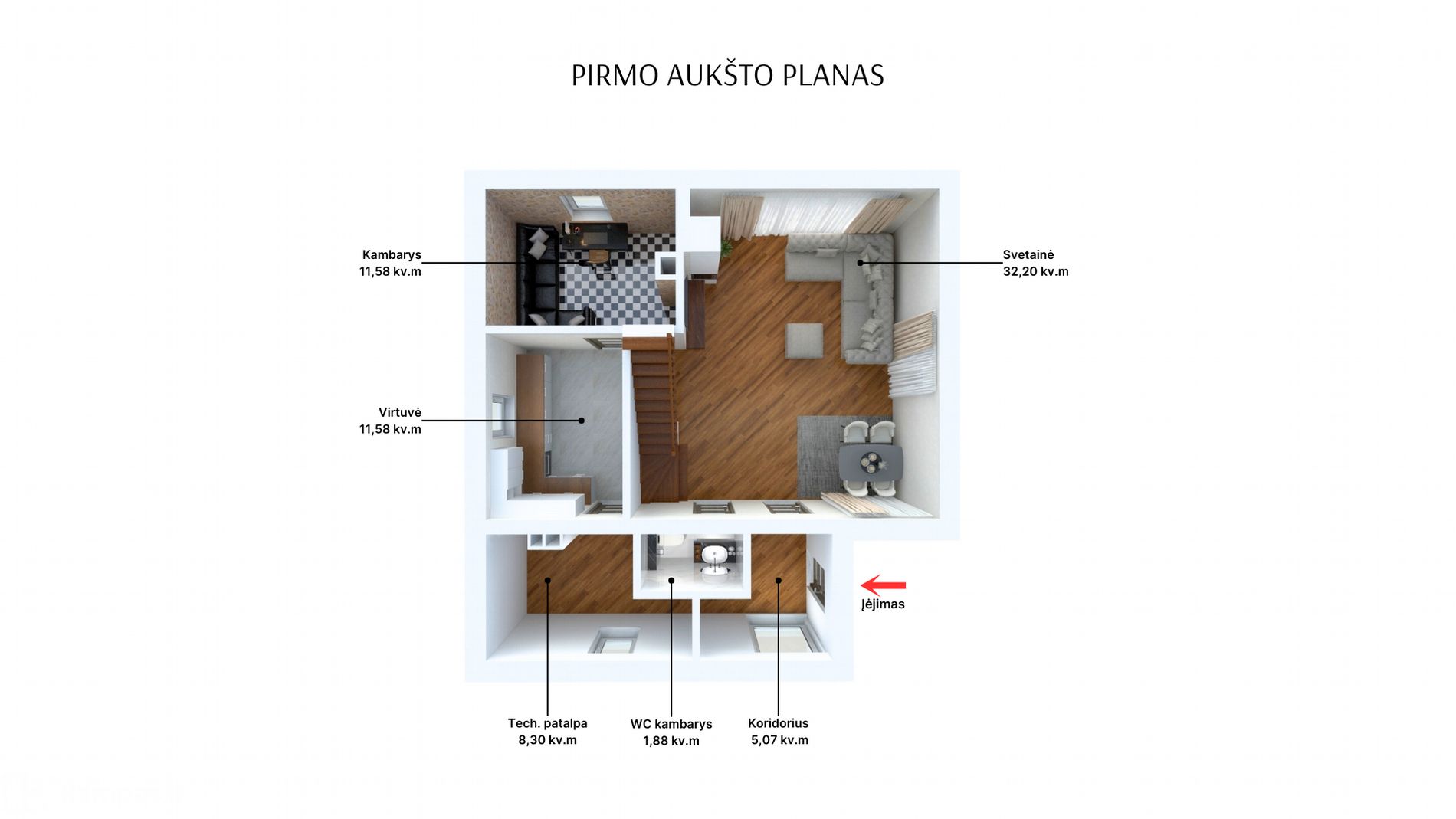 Išplanavimas funkcionalus, patogus šeimai, suteikiantis atskiras erdves poilsiui ir privatumui.