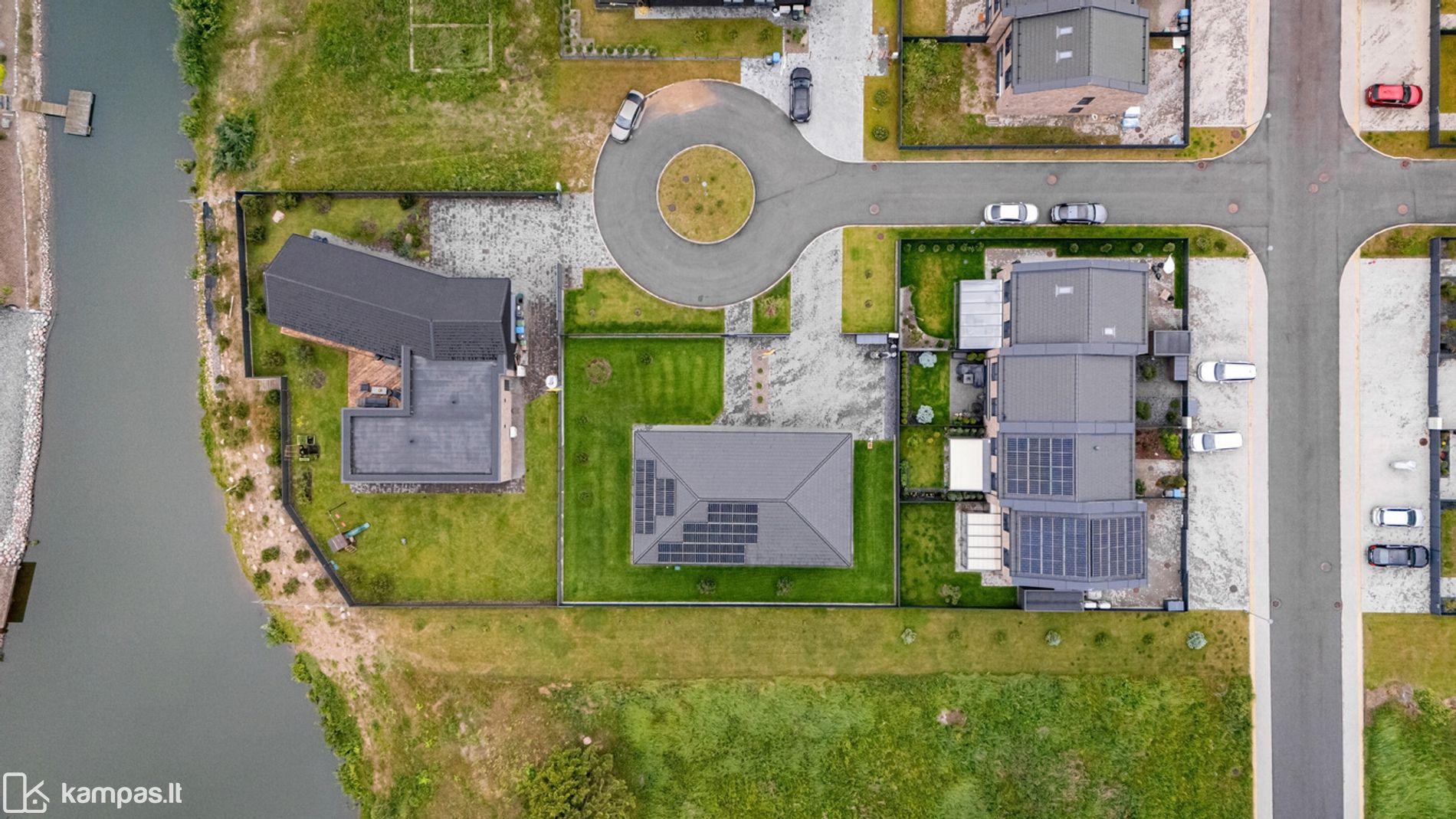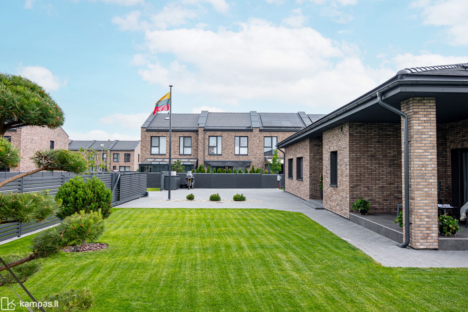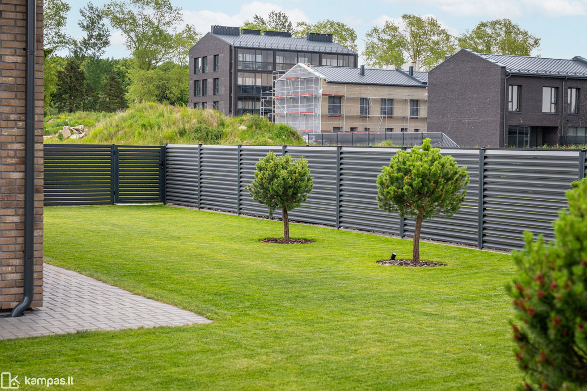 Pilnai sutvarkyta aplinka – trinkelėmis grįsti takai, apšvietimas, veja su „Hunter“ laistymo sistema ir vejos robotu