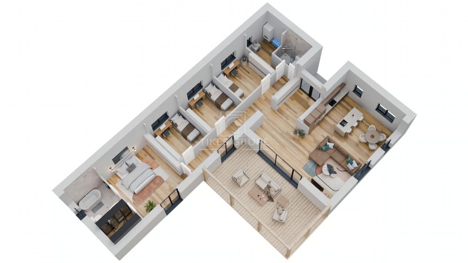 Erdvi svetainė su virtuve ir valgomuoju (apie 42 m²) – šviesi, jauki ir funkcionali erdvė, kurioje gera leisti laiką kartu. Iš svetainės atsiveria išėjimas į dengtą 34,6 m² terasą – puiki vieta rytinei kavai ar poilsiui po dienos darbų. Tėvų miegamasis turi atskirą drabužinę, o trys papildomi kambariai pritaikyti vaikams, svečiams ar darbui iš namų.