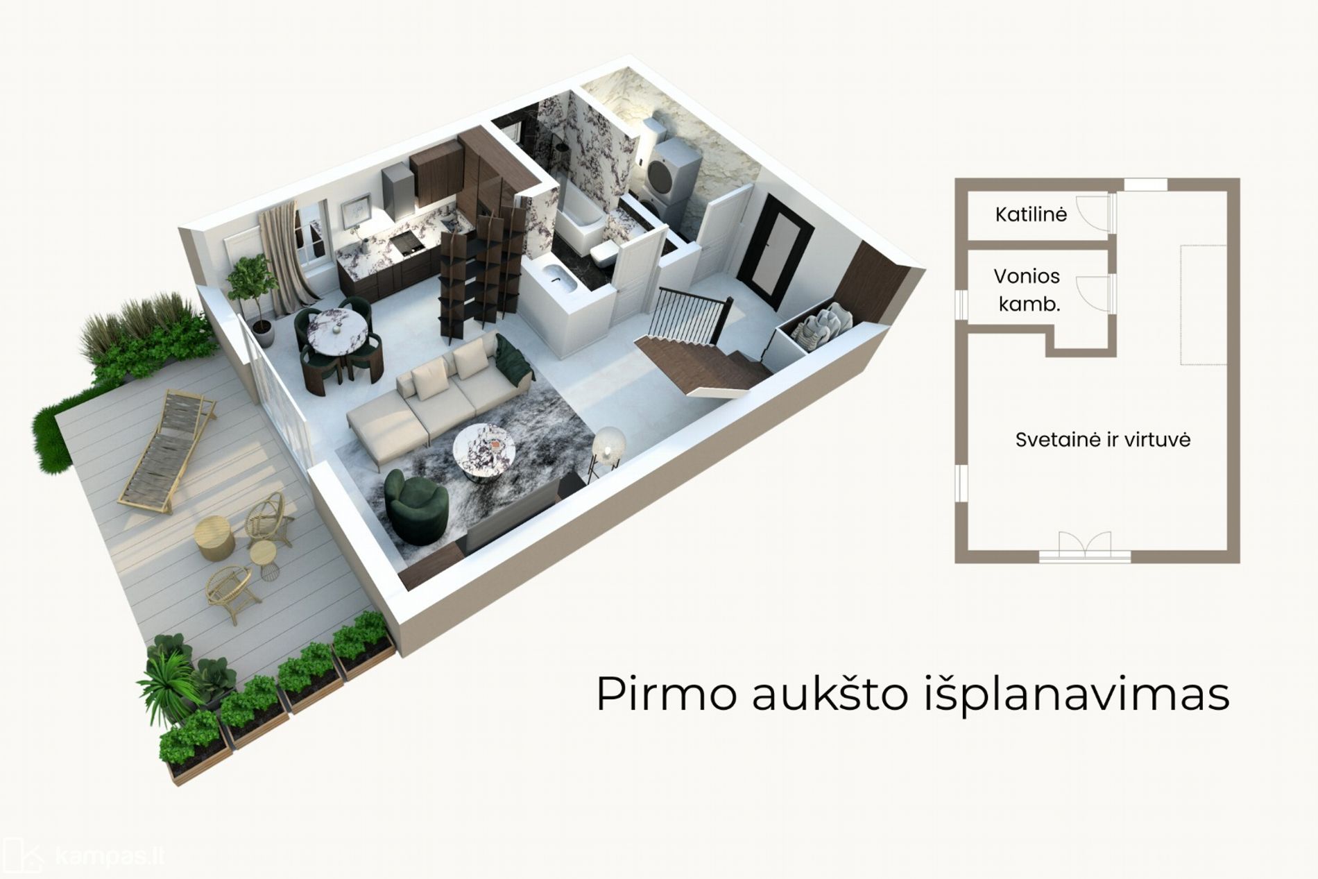 - Optimalus namo plotas ir numatomas funkcionalus namo išplanavimas - 3 miegamieji kambariai, 2 vonios kambariai (su dušu ir vonia), darbo vietos (pasirinktinai), virtuvė/valgomasis/svetainė bendroje erdvėje bendrystei, terasa vakaruose - nuostabiems saulėlydžiams;