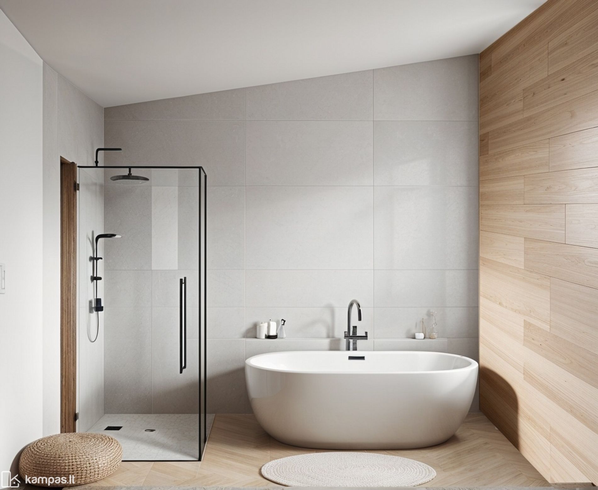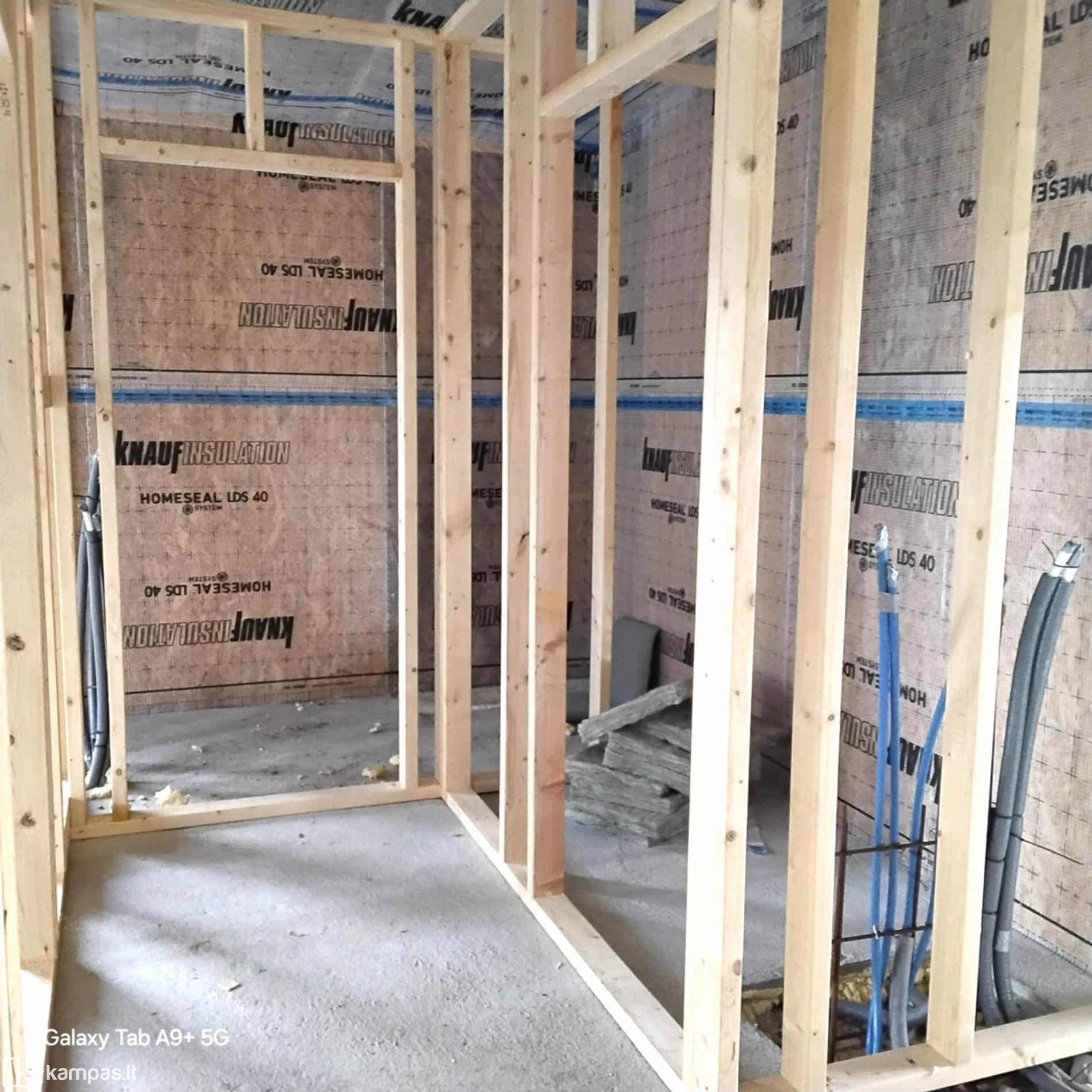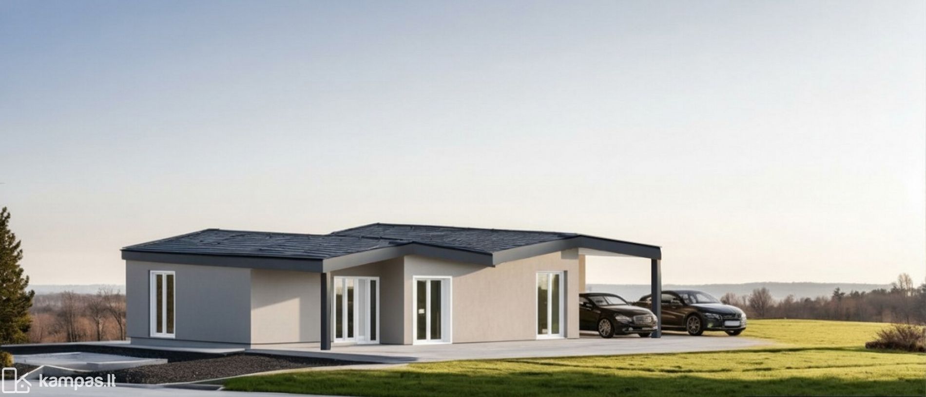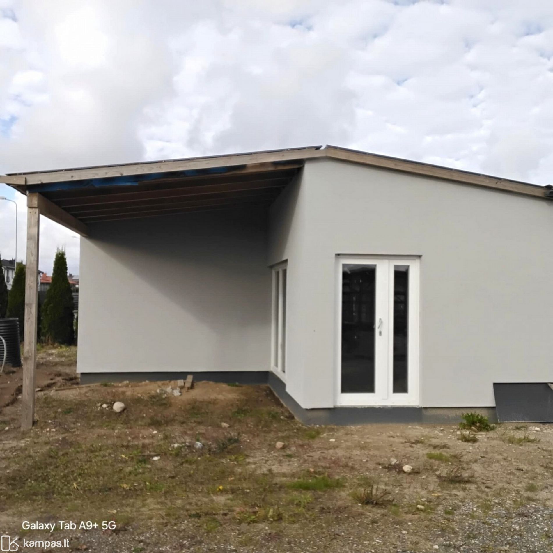 Namas taip pat idealiai tinka gyventi ir 2 šeimoms. Bendras plotas 110 kv. m Kambarių skaičius: 5 Aukštų skaičius: 1 Šildymas aeroterminis. Miesto vandentiekis. Erdvi terasos zona. Vieta automobilio stoginei. Dalinė apdaila. išvedžiotas grindinis šildymas, apšiltintas stogas. Galimybė persiplanuoti erdves. Namas su daline apdaila leidžia pirkėjui pritaikyti interjerą pagal savo poreikius ir skonį (pridedu vizualizacijos planus). Erdvus gyvenamasis plotas. Patogūs kambariai ir erdvūs koridoriai suteikiantys galimybę įvairiems interjero sprendimams.