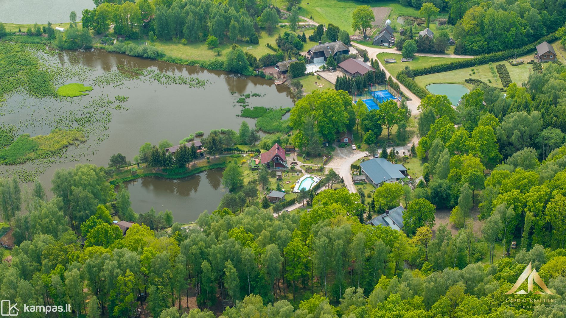 Dvi pavėsinės – terasos su šaslikinėmis,gražus prūdas, lauko teniso, krepsinio aikštelė.