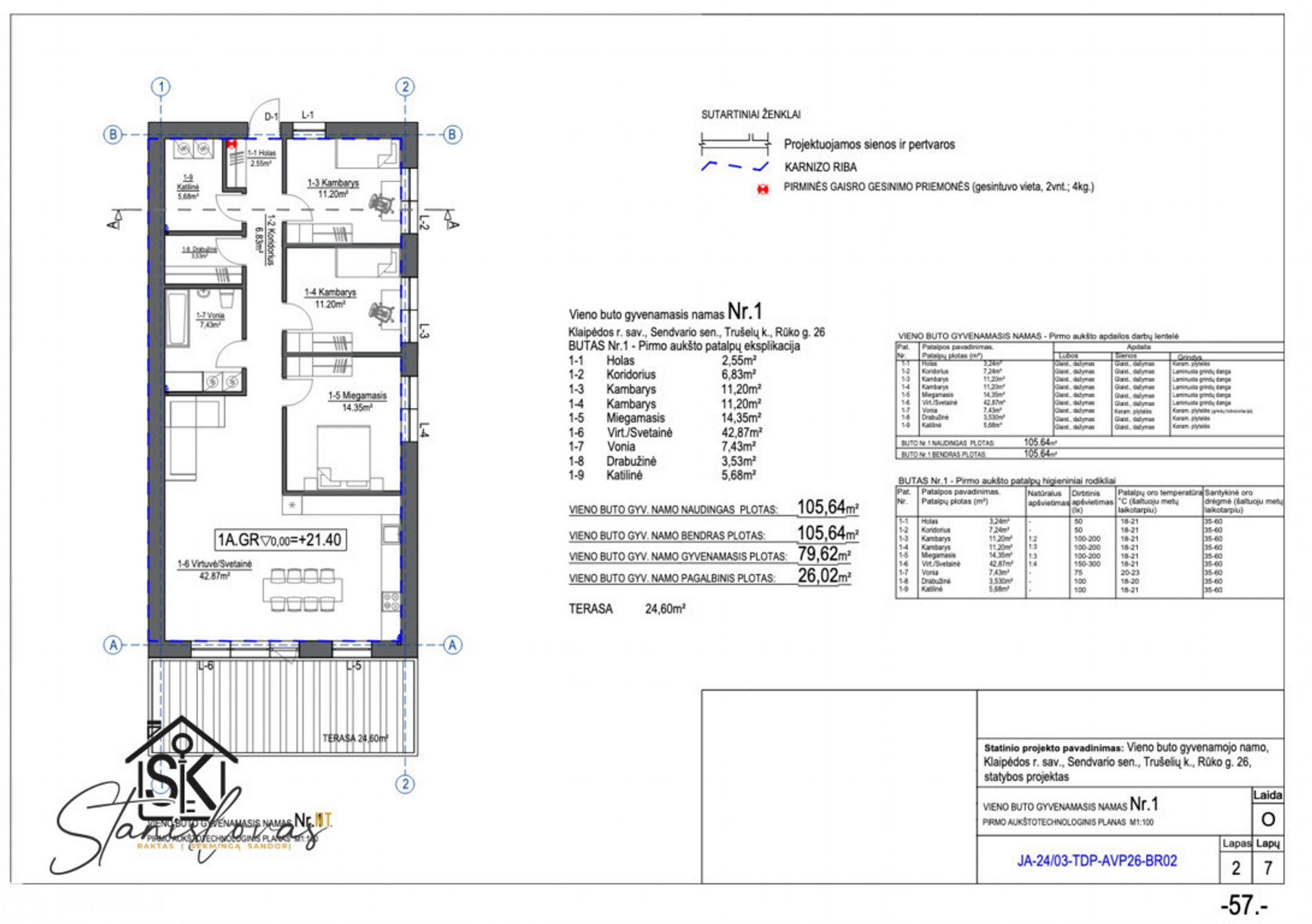 • Svetainė/Virtuvė - 42.87 kv.m.;