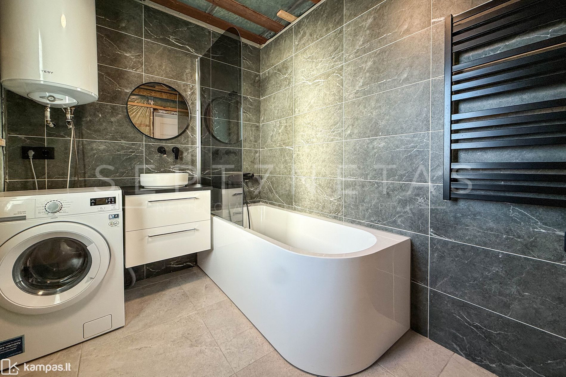 - Vonios kambario grindys, sienos išklotos plytelėmis;