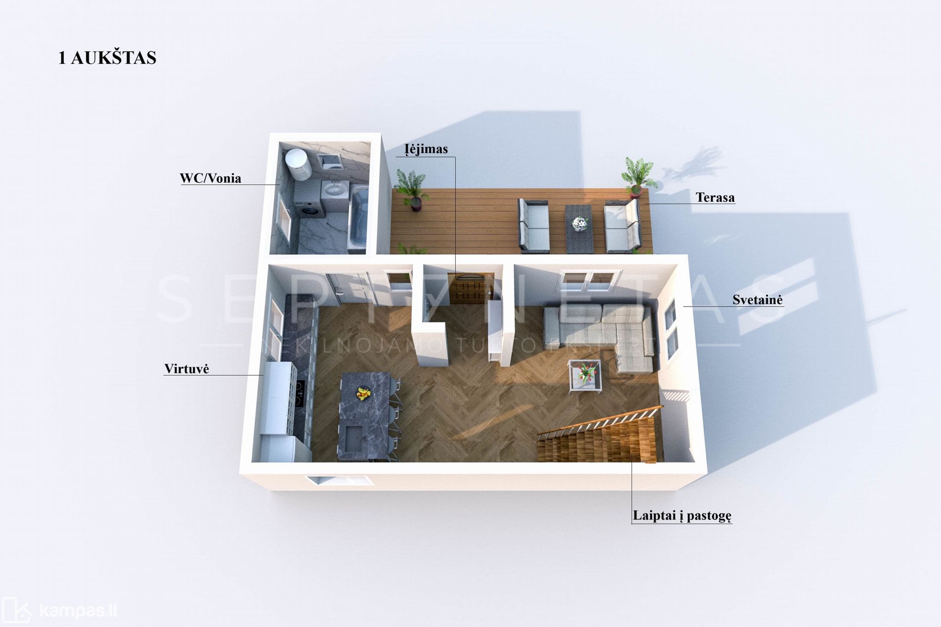 - Prie namuko įrengta medinė terasa su stogu;