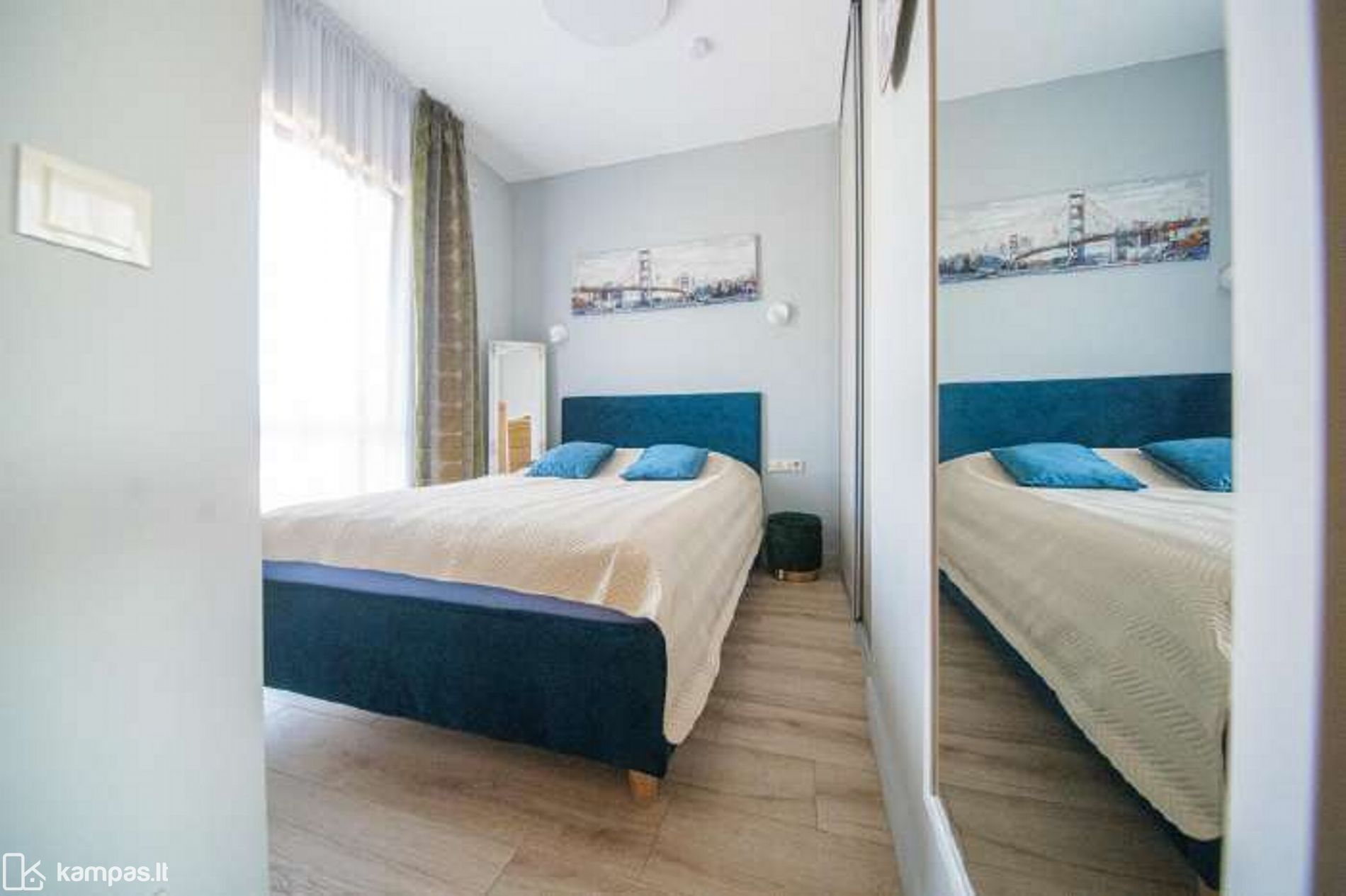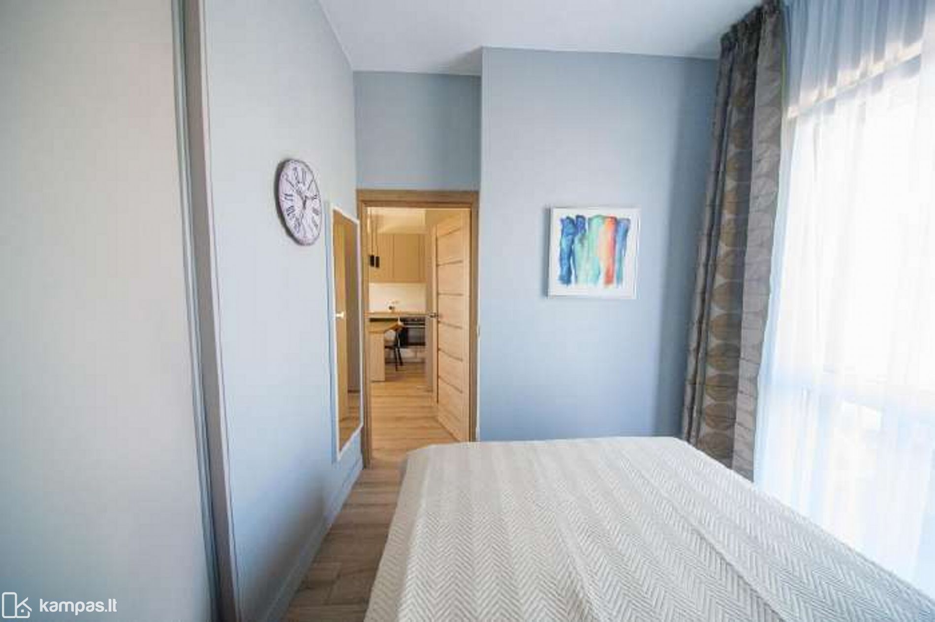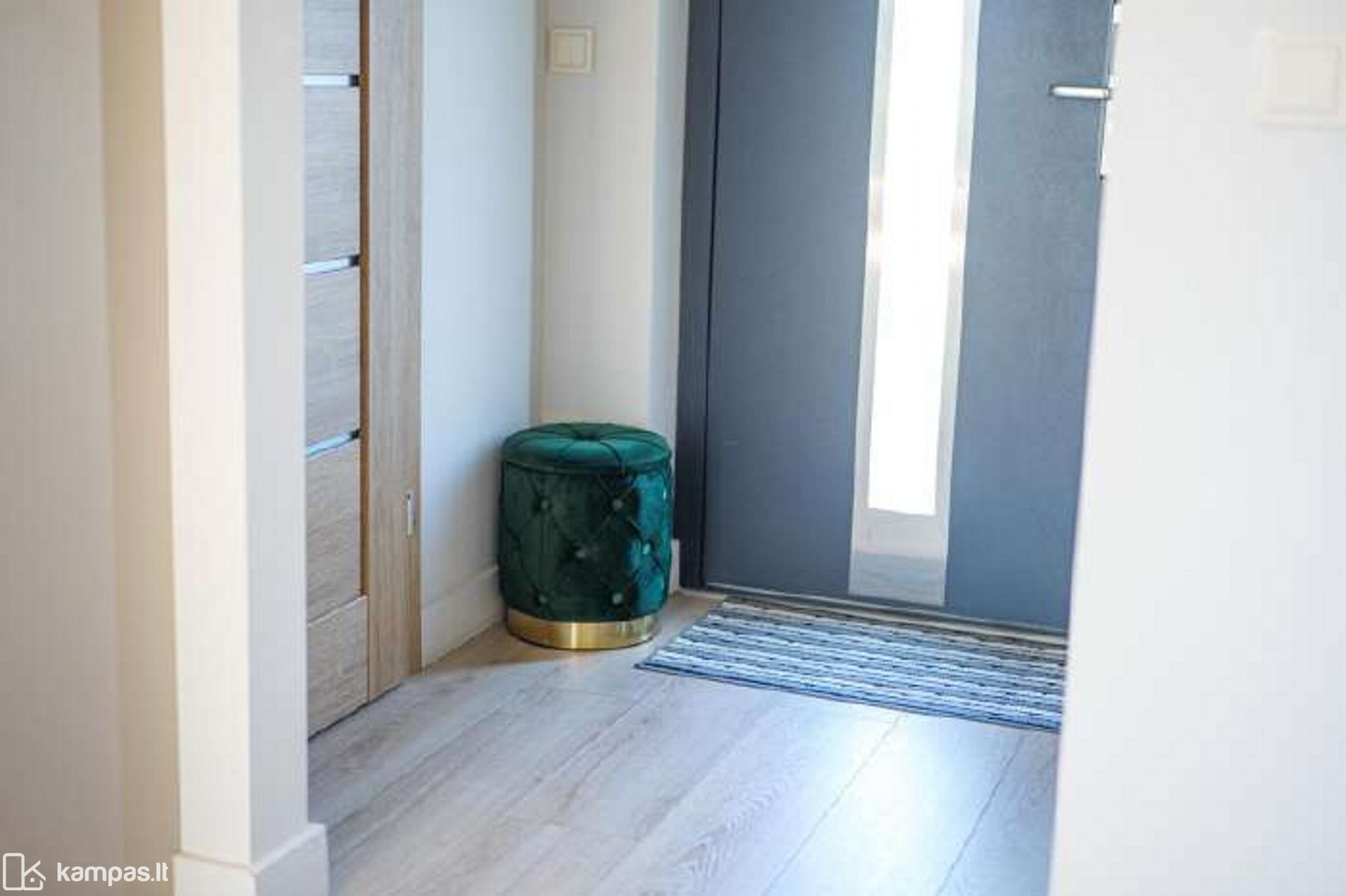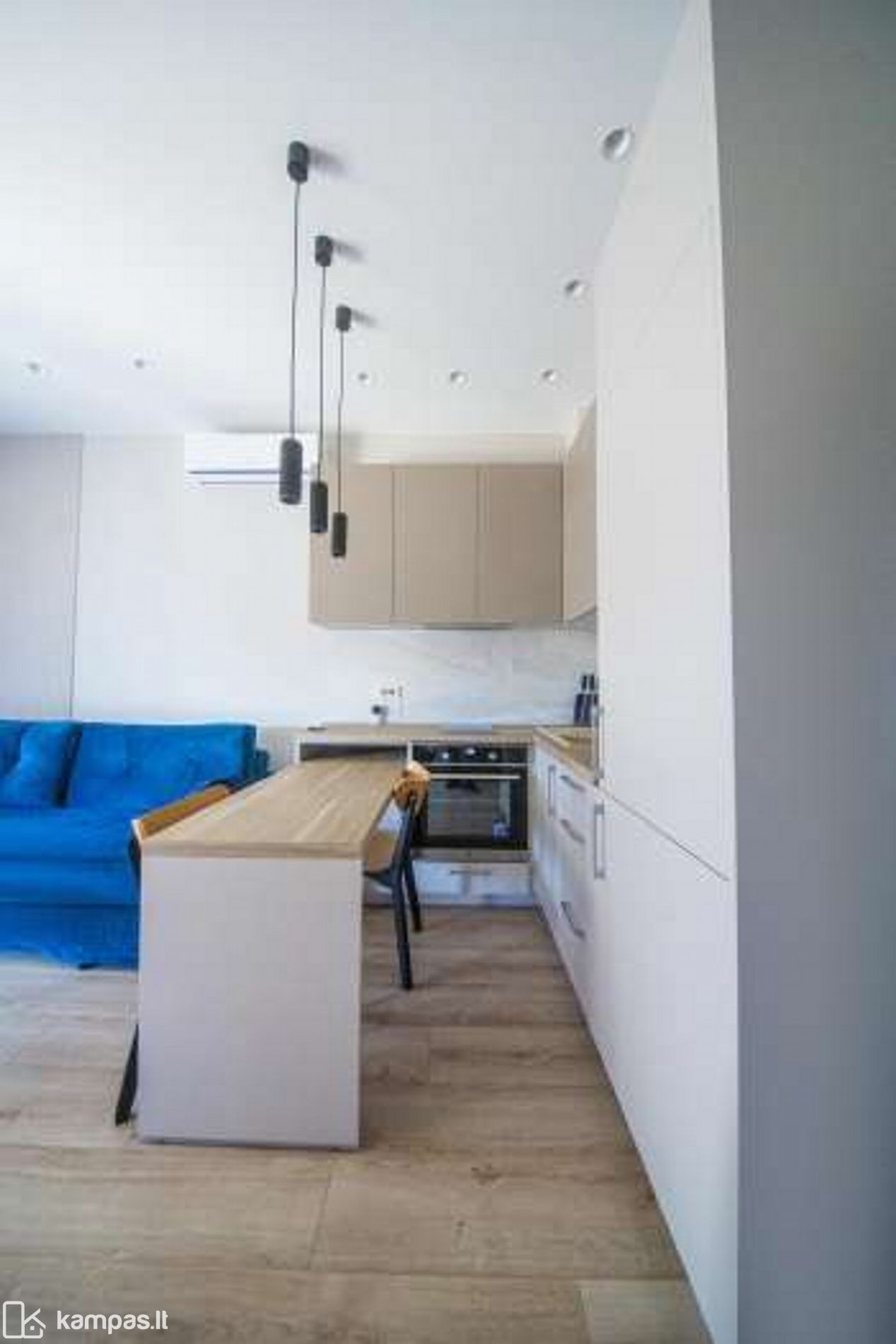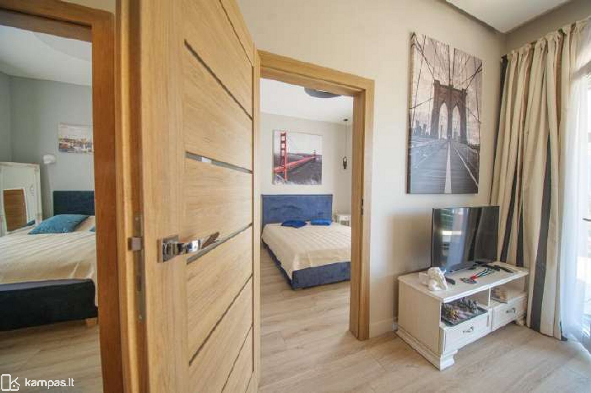 - Aukštos klasės įrengimo medžiagos ir baldai, įmontuojami baldai gaminti pagal individualų užsakymą. Stilinga virtuvė, išskirtinės sieninės spintos iki lubų koridoriuje ir abiejuose miegamuosiuose