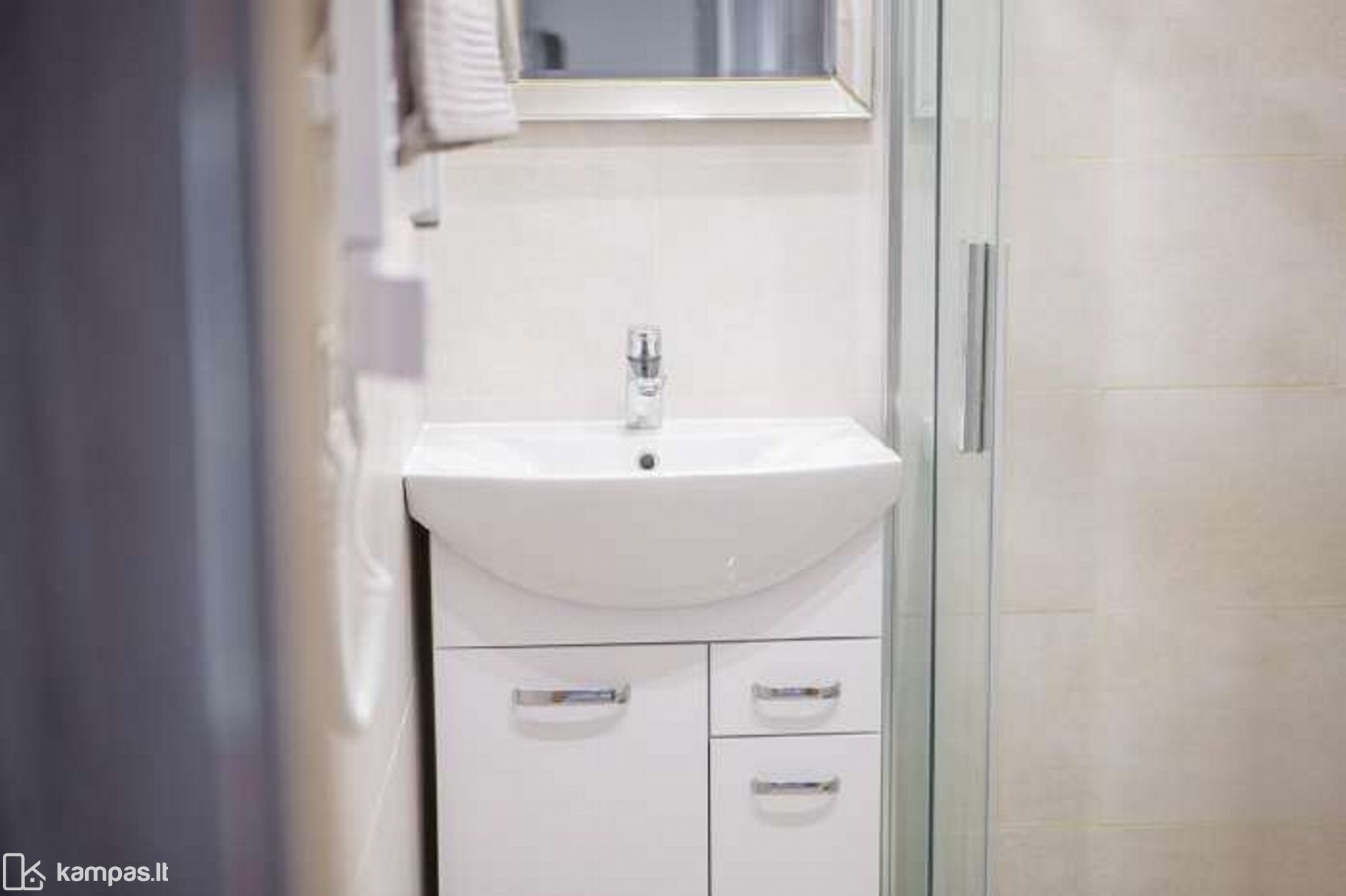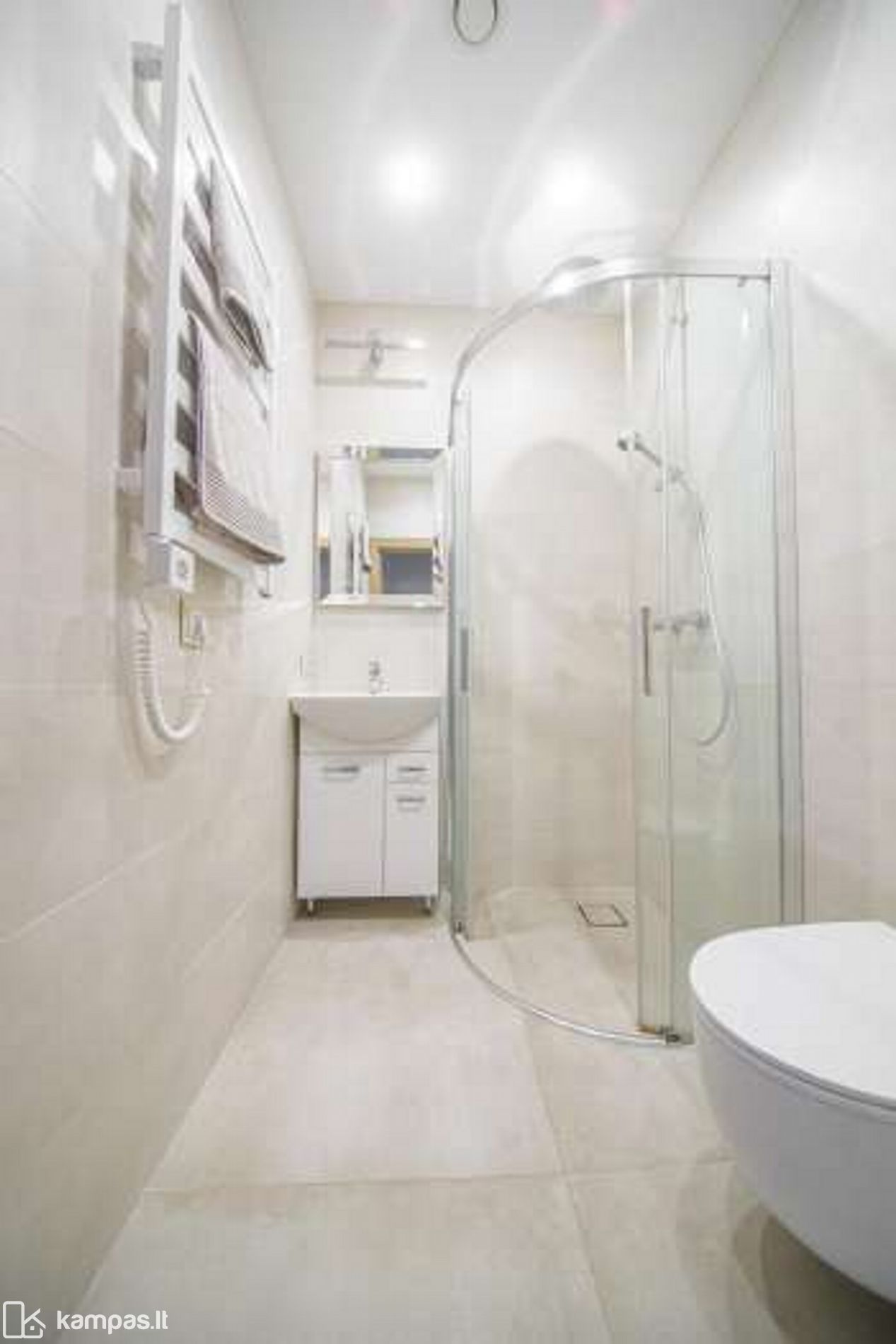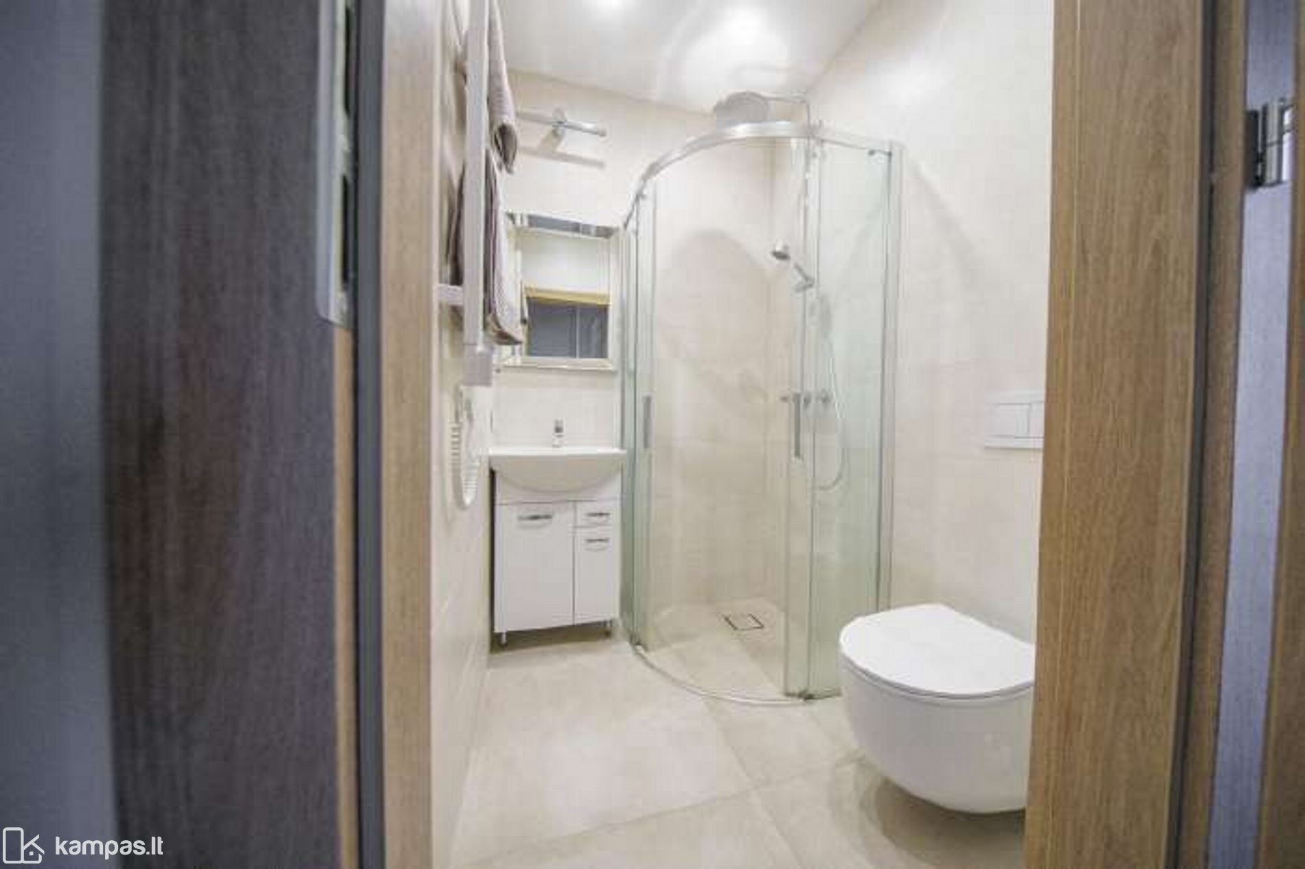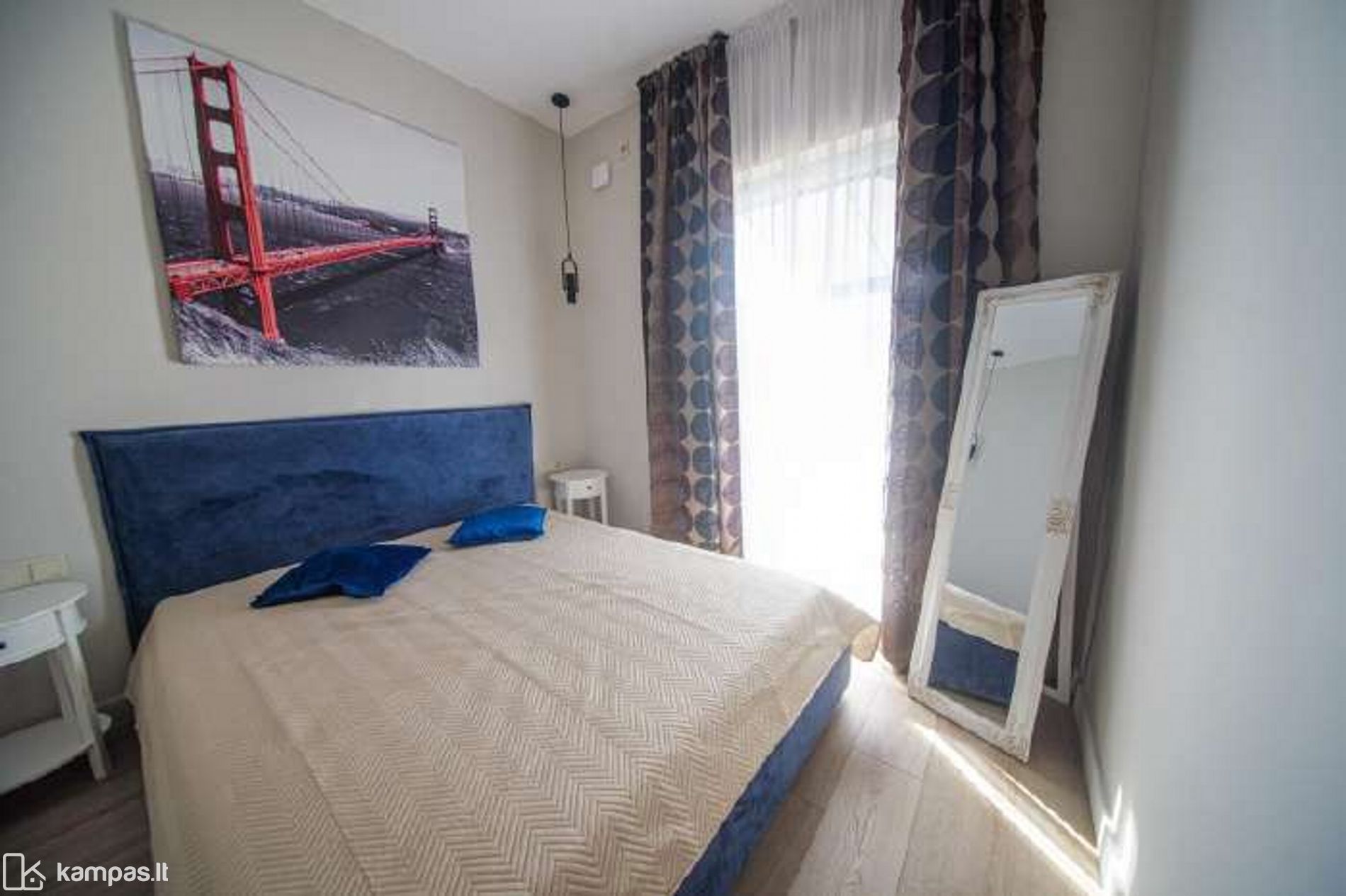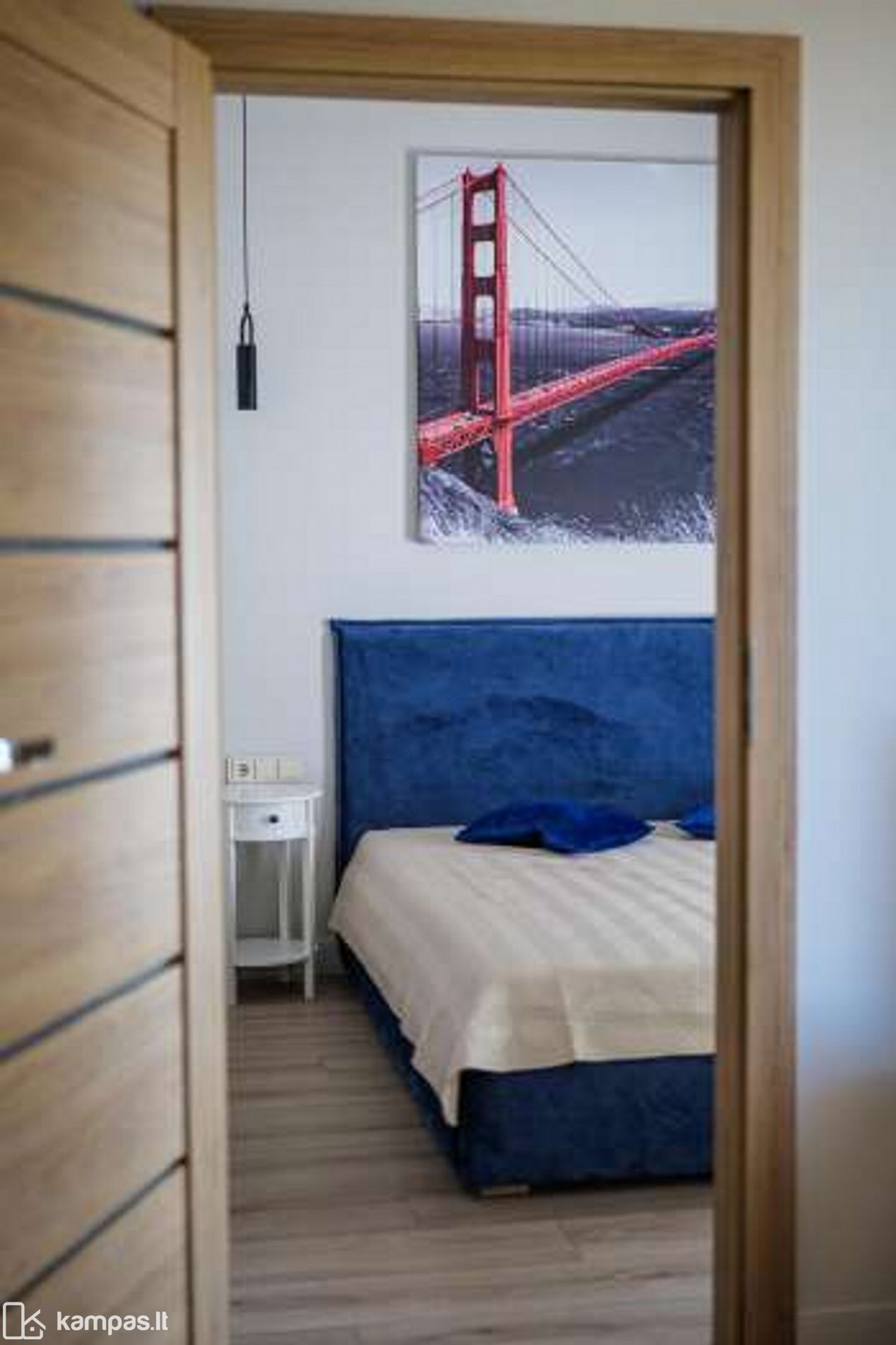 - Aukštos klasės įrengimo medžiagos ir baldai, įmontuojami baldai gaminti pagal individualų užsakymą. Stilinga virtuvė, išskirtinės sieninės spintos iki lubų koridoriuje ir abiejuose miegamuosiuose