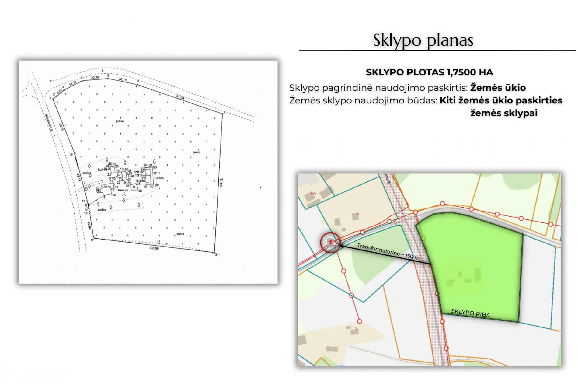 • Sklypo plotas: 1,75 ha, paskirtis – žemės ūkio;