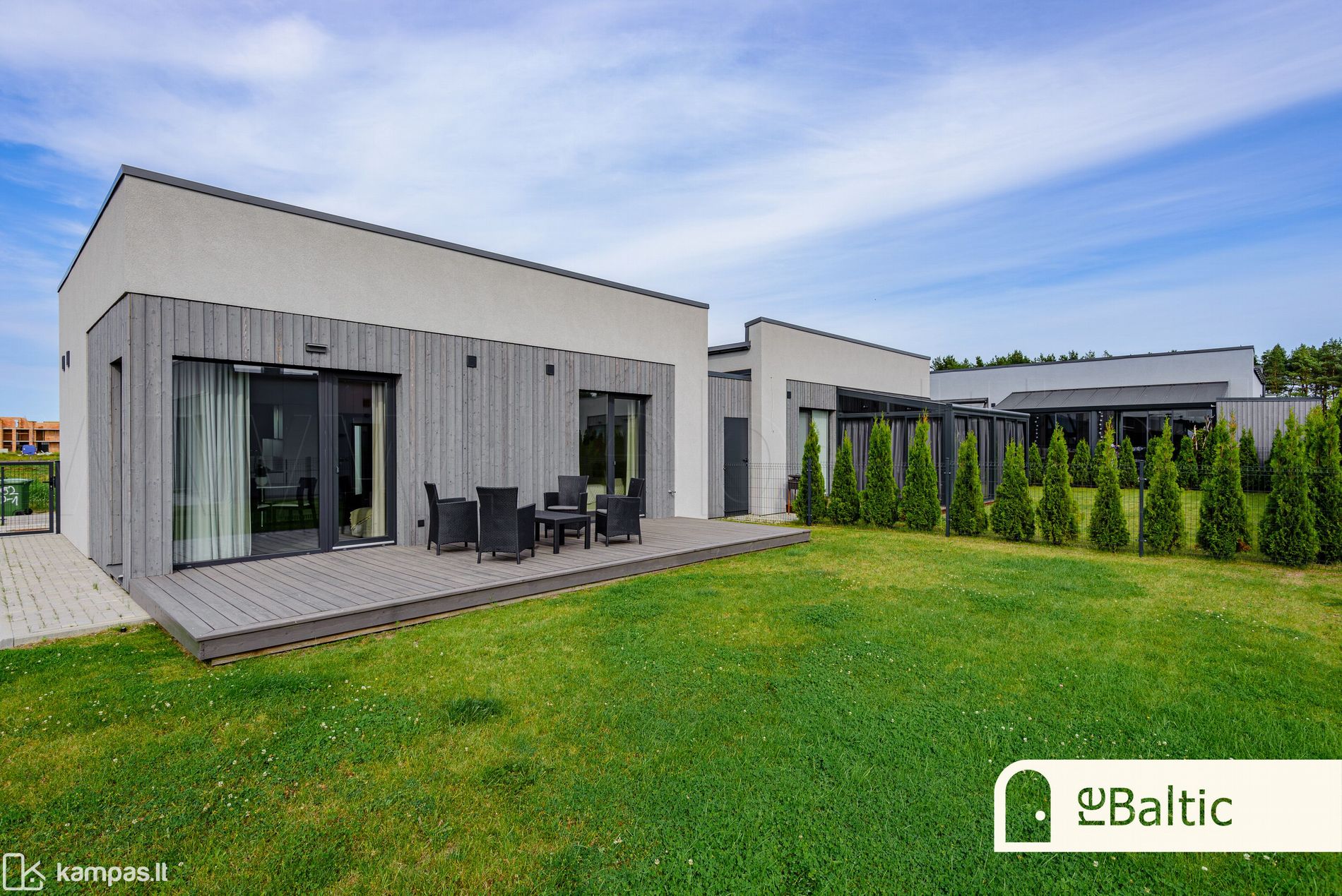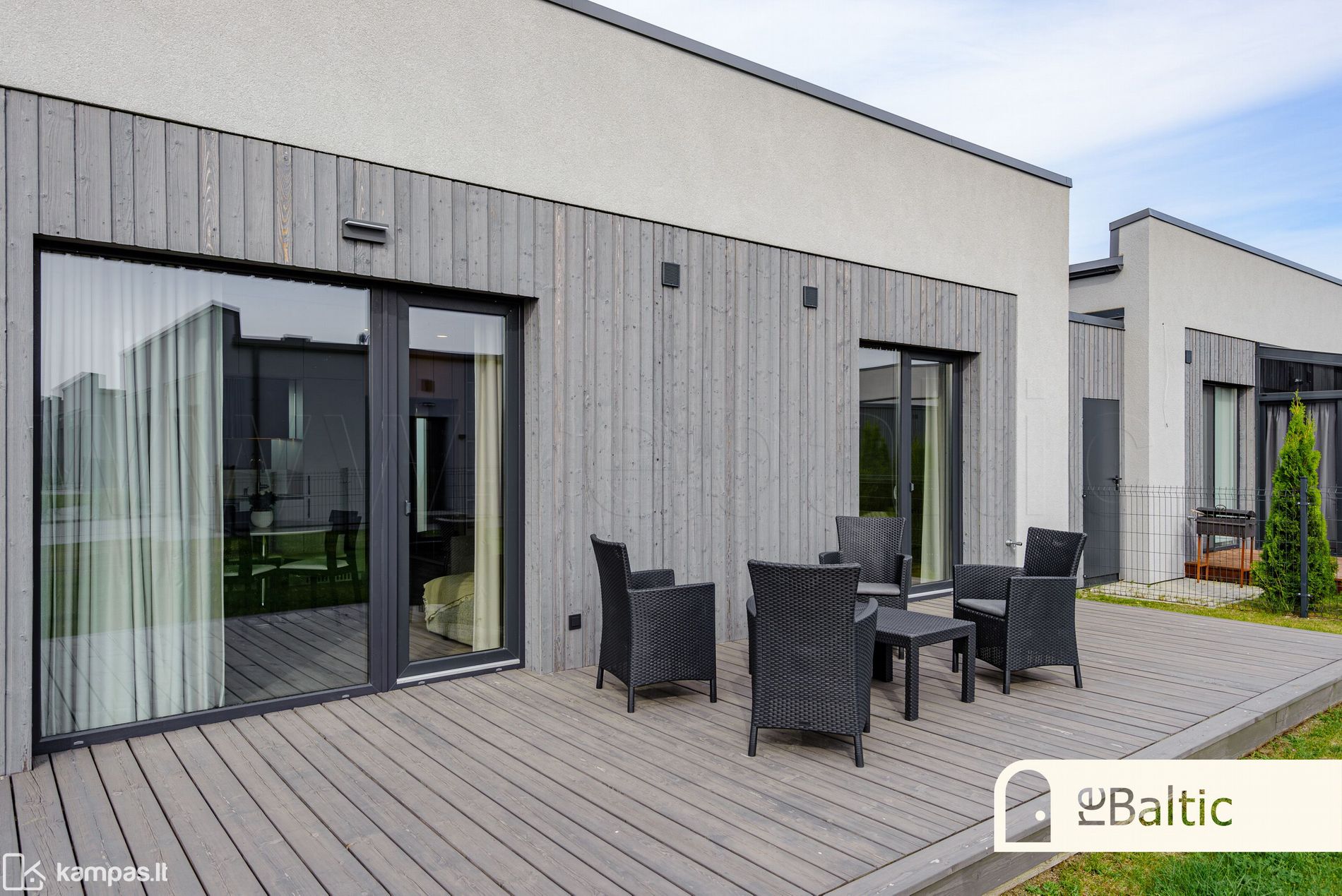 - Didžiulė terasa per visą namo ilgį, orientuota į saulėtąsias pietų ir vakarų puses