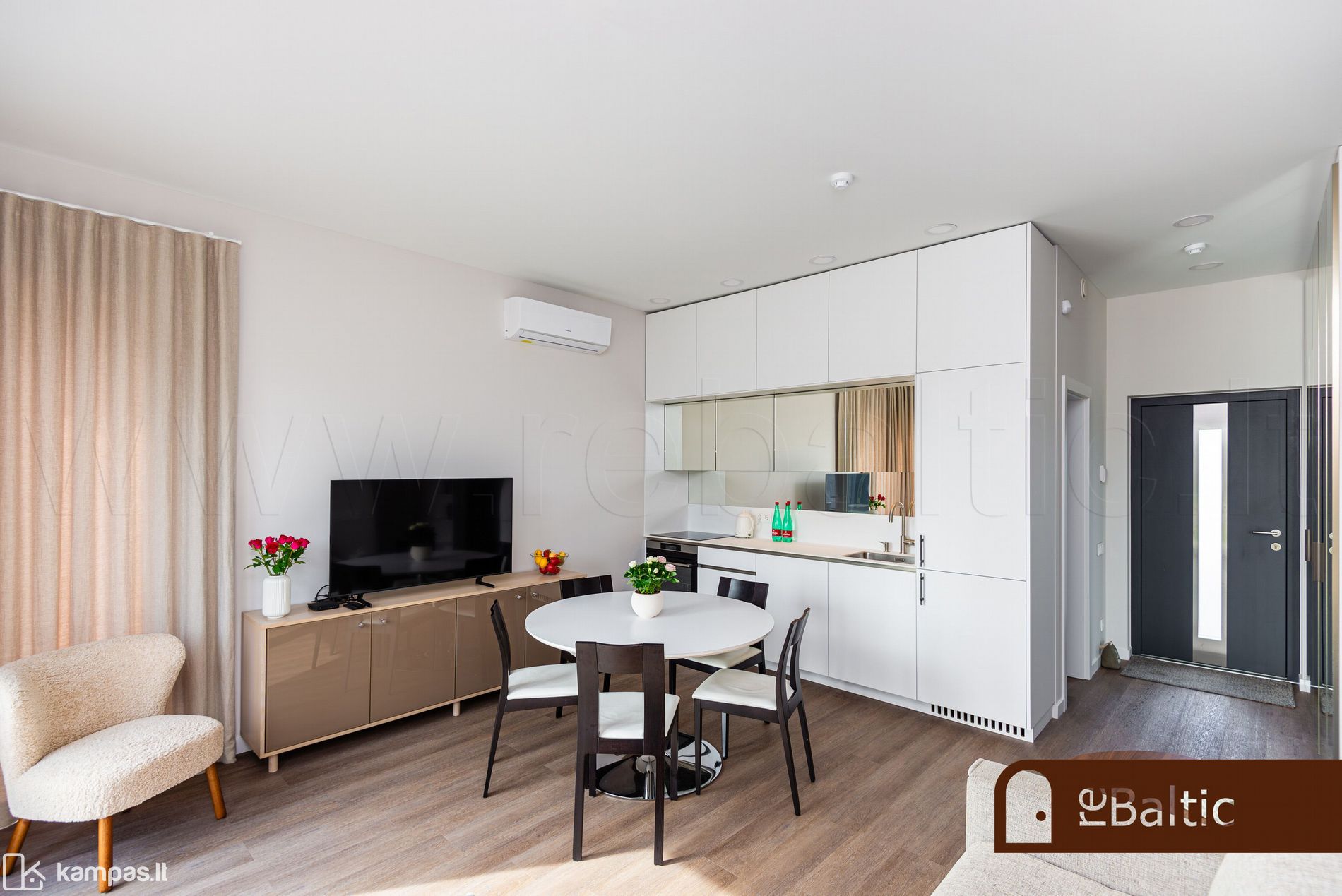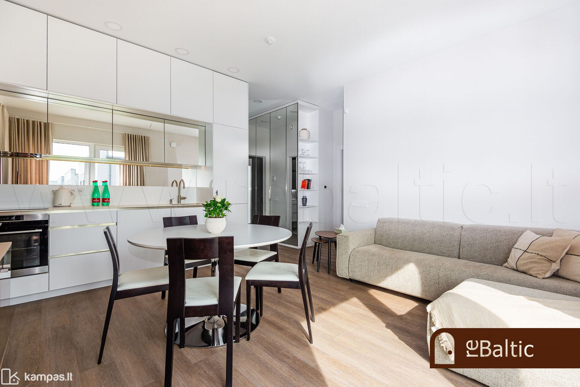 - Svetainė vienoje erdvėje su virtuve. Veidrodinis virtuvės fasadas išplečia svetainės erdvės pojūtį.