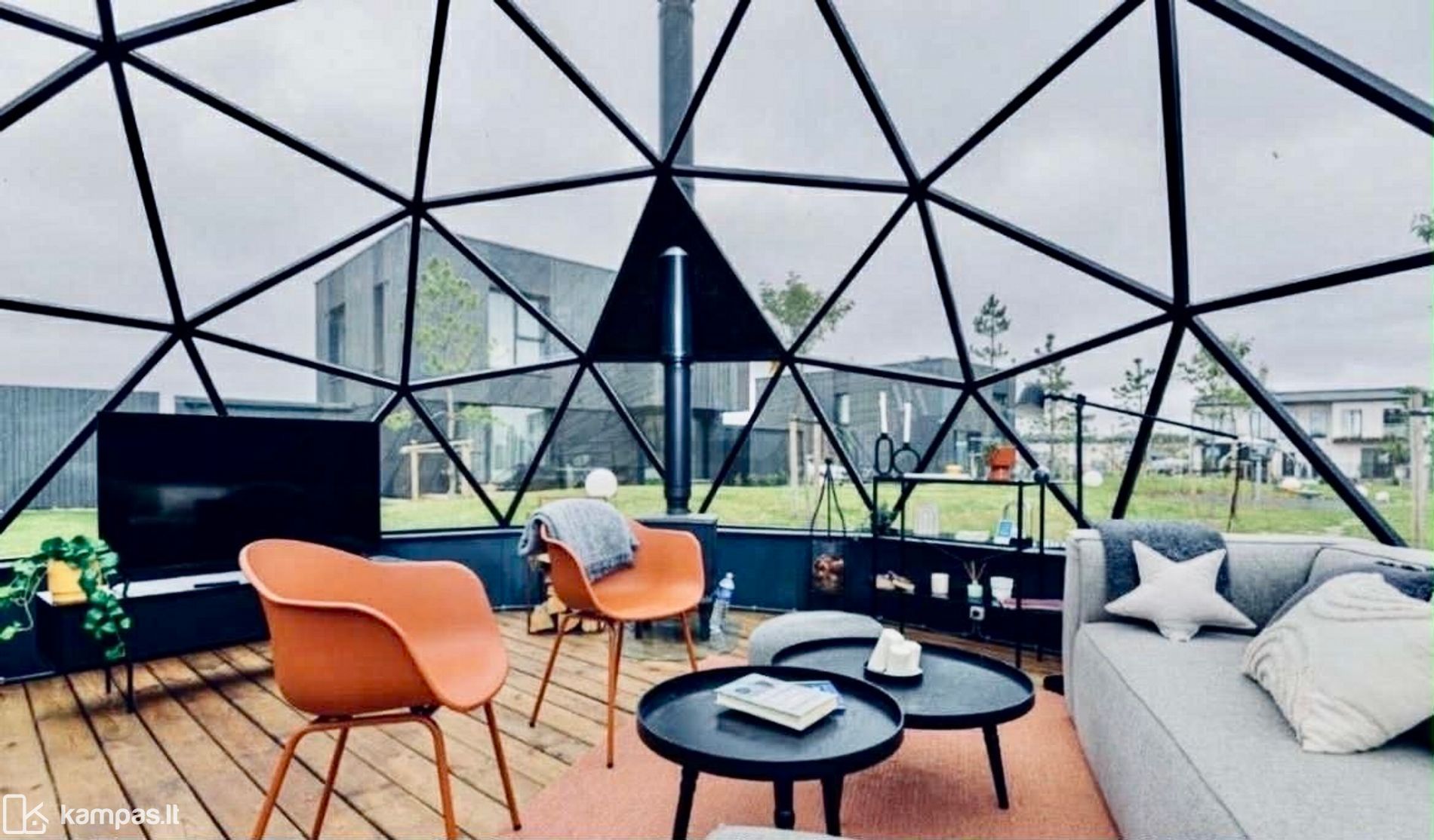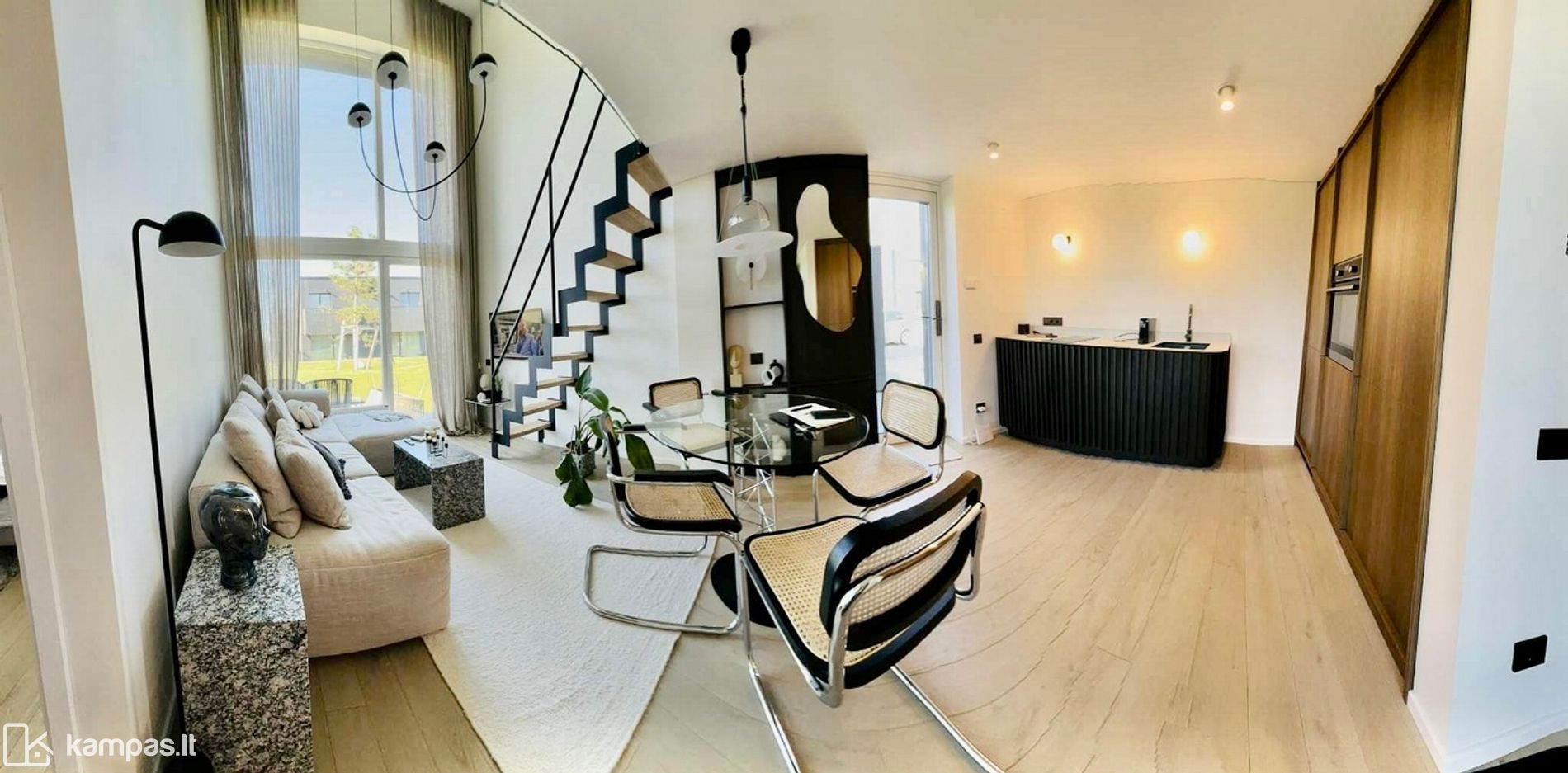 Svetainė sujungta su virtuve ir valgomuoju zona. Pro plačius langus atsiveria vaizdas į privačią terasą ir nedidelį kiemelį, kuris tampa natūralia poilsio erdve – čia malonu skaityti, medituoti ar dalintis kava su artimaisiais.